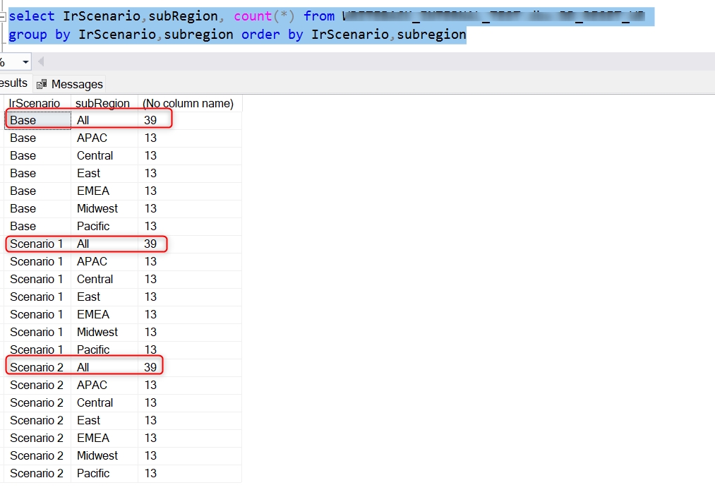 For demonstration purposes, consider a SQL server destination to which the base and scenario data have been written back. The count of data populated in the database, region-wise and subregion-wise is as follows: