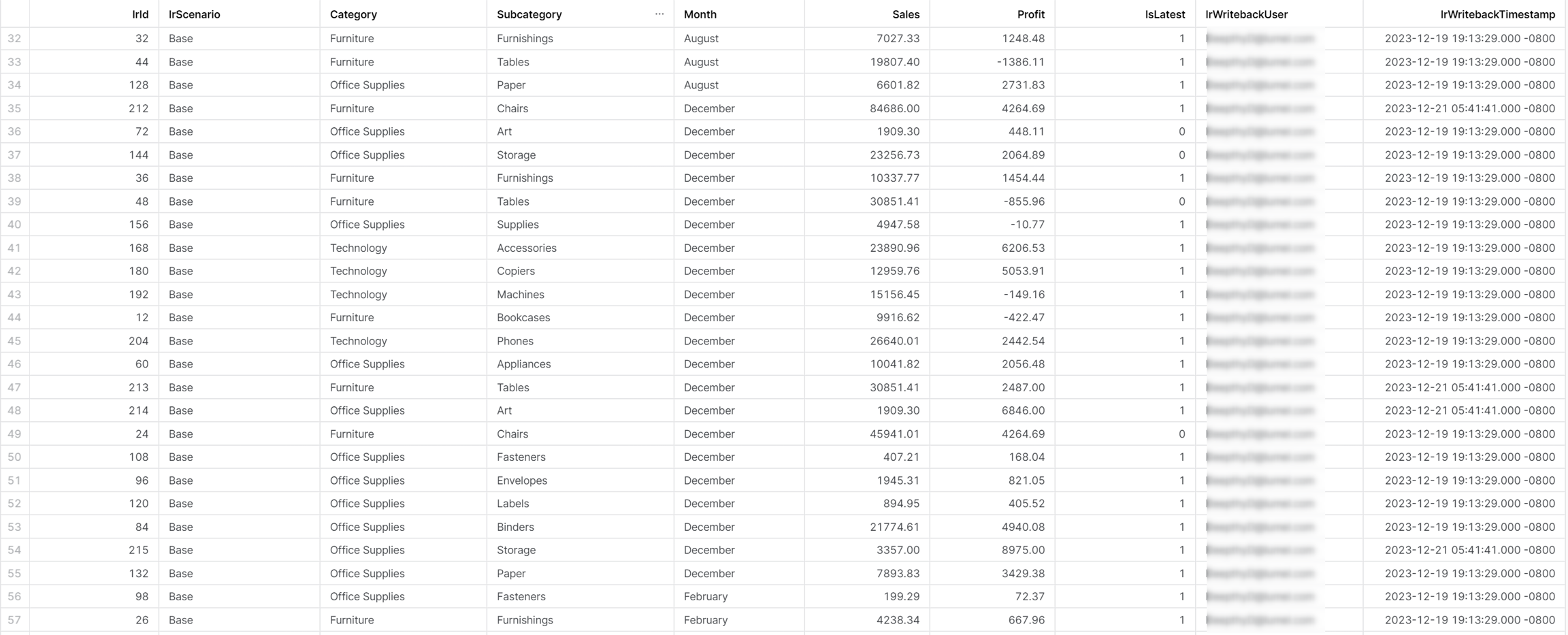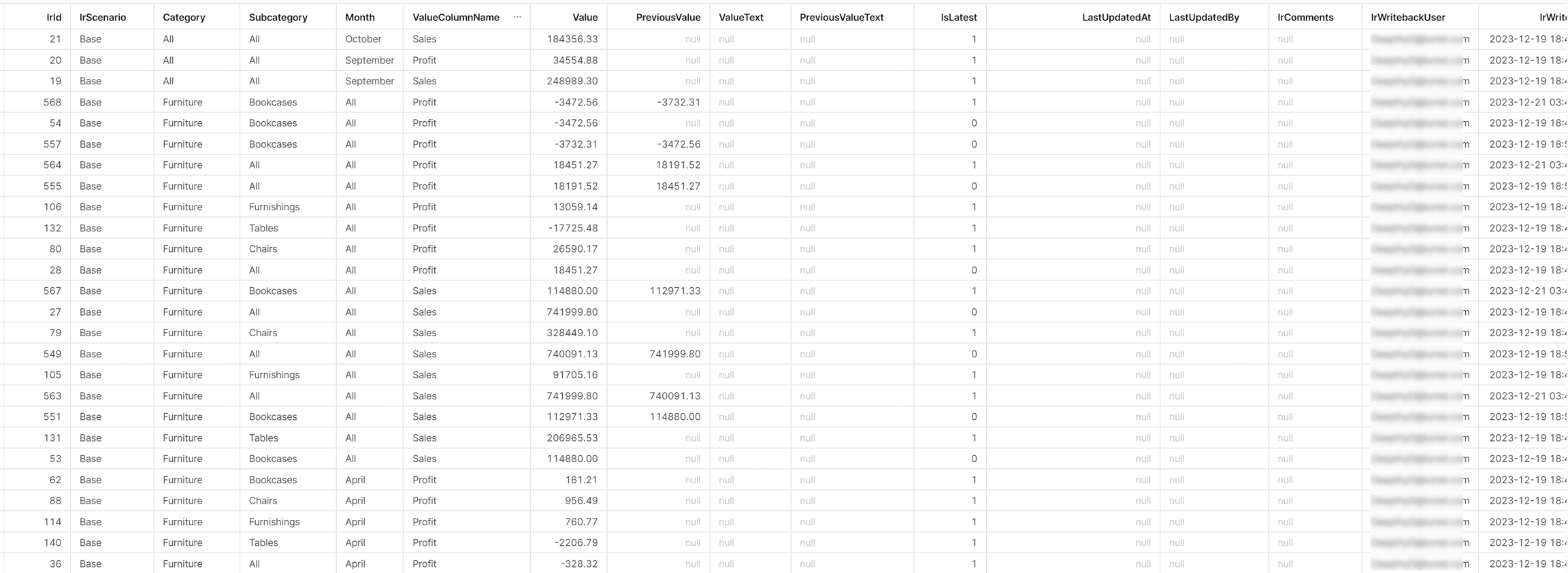 This writeback type also performs a delta writeback - only changed records are written back. In this format, each measure is stored as a separate column in the database. Like the Tidy format, change history is maintained and the active record can be identified using the IsLatest column.
