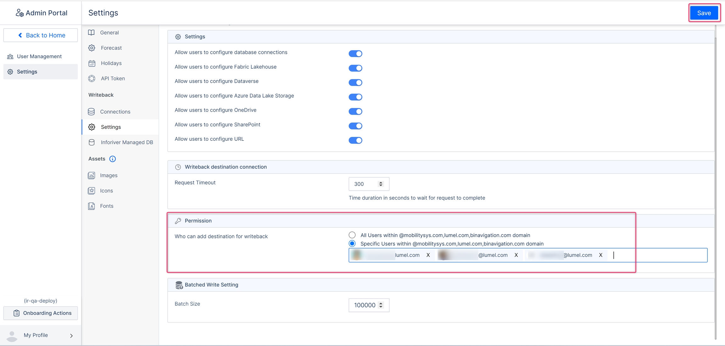 This is done by specifying the email IDs of specific users or adding an Active Directory list in the admin console, as shown below, who will be given permission to add writeback destinations.