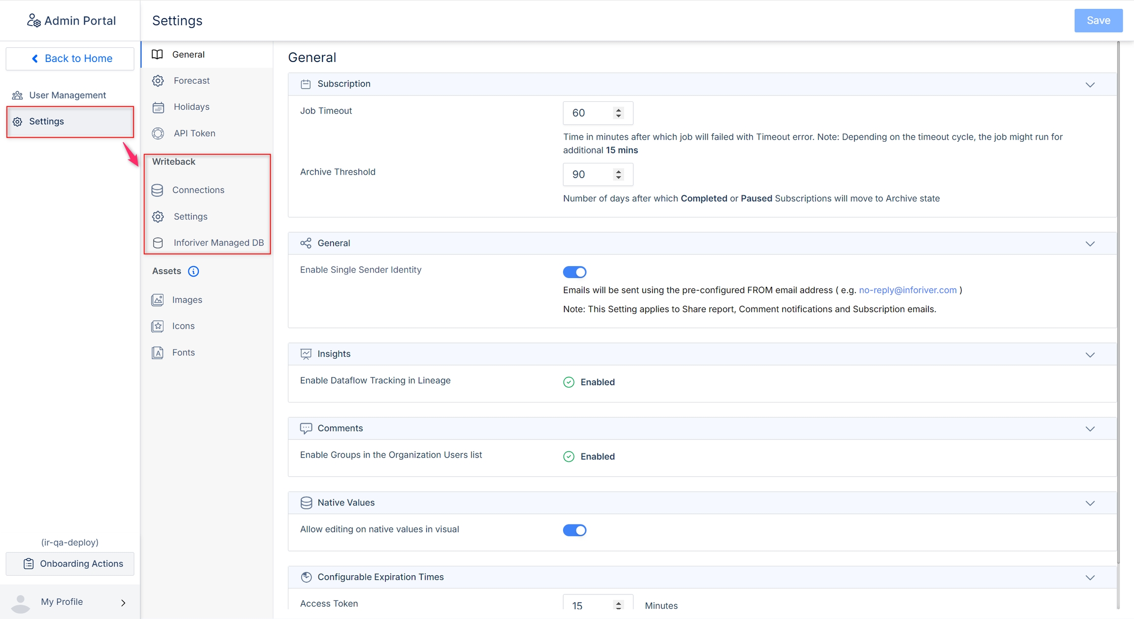 In the admin portal, go to Settings and look for the 'Writeback' section, which contains admin-level writeback settings.