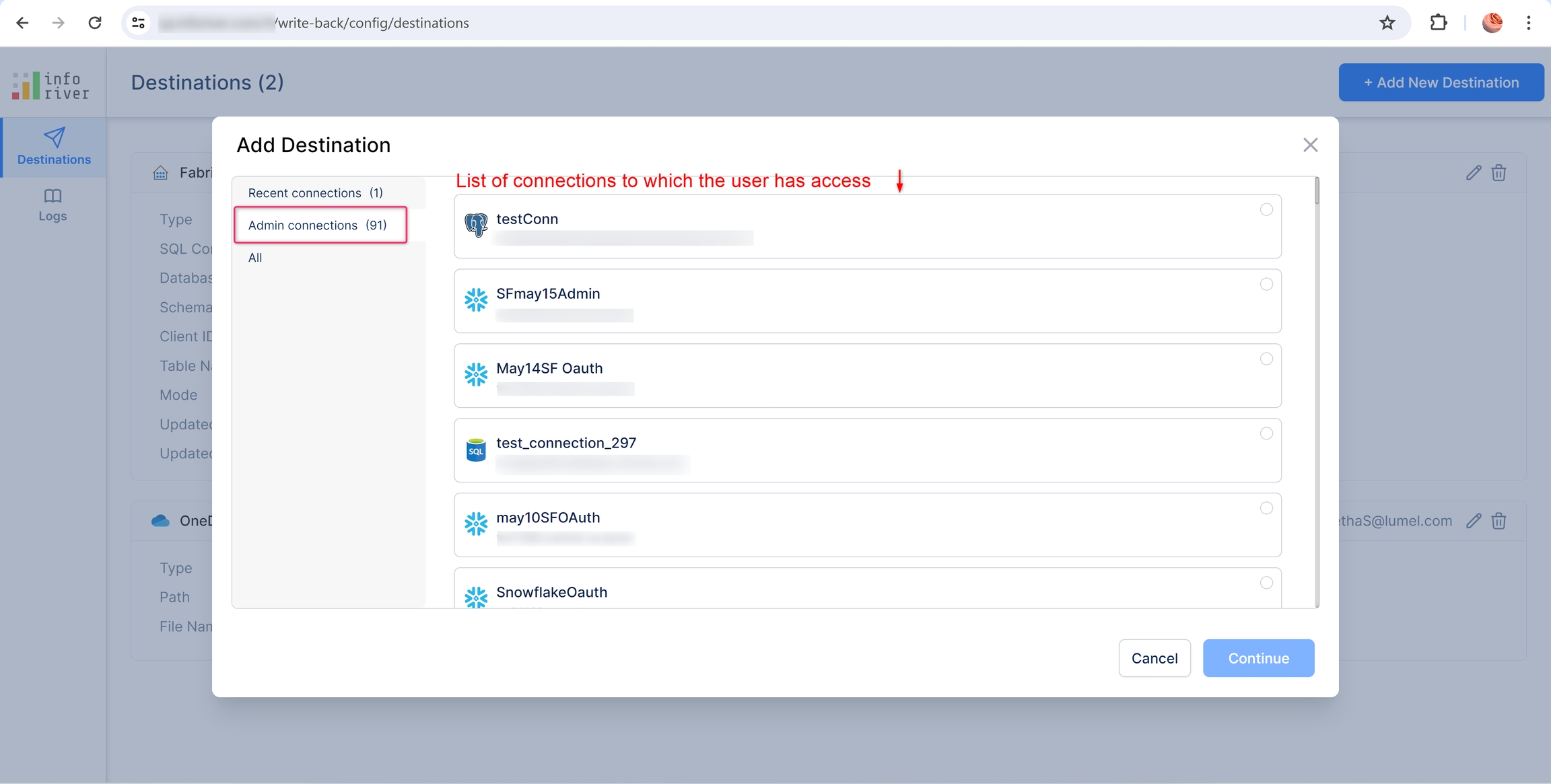 Only these users can view and connect to this admin connection while configuring a new destination. Other users without access cannot view it in the list of connections, as shown below.
