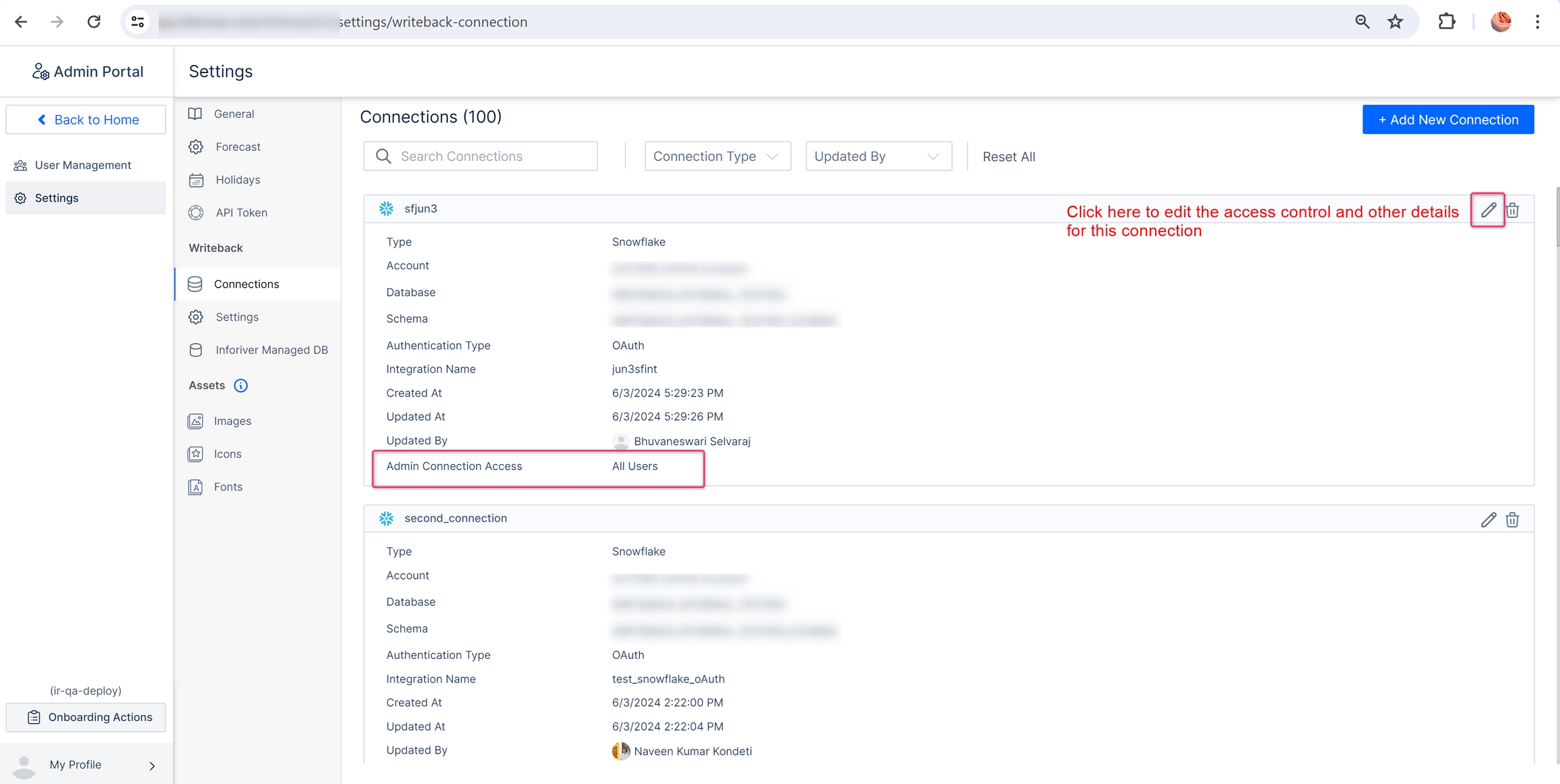 Admins can specify who can access a particular connection by clicking on the pencil icon beside it.