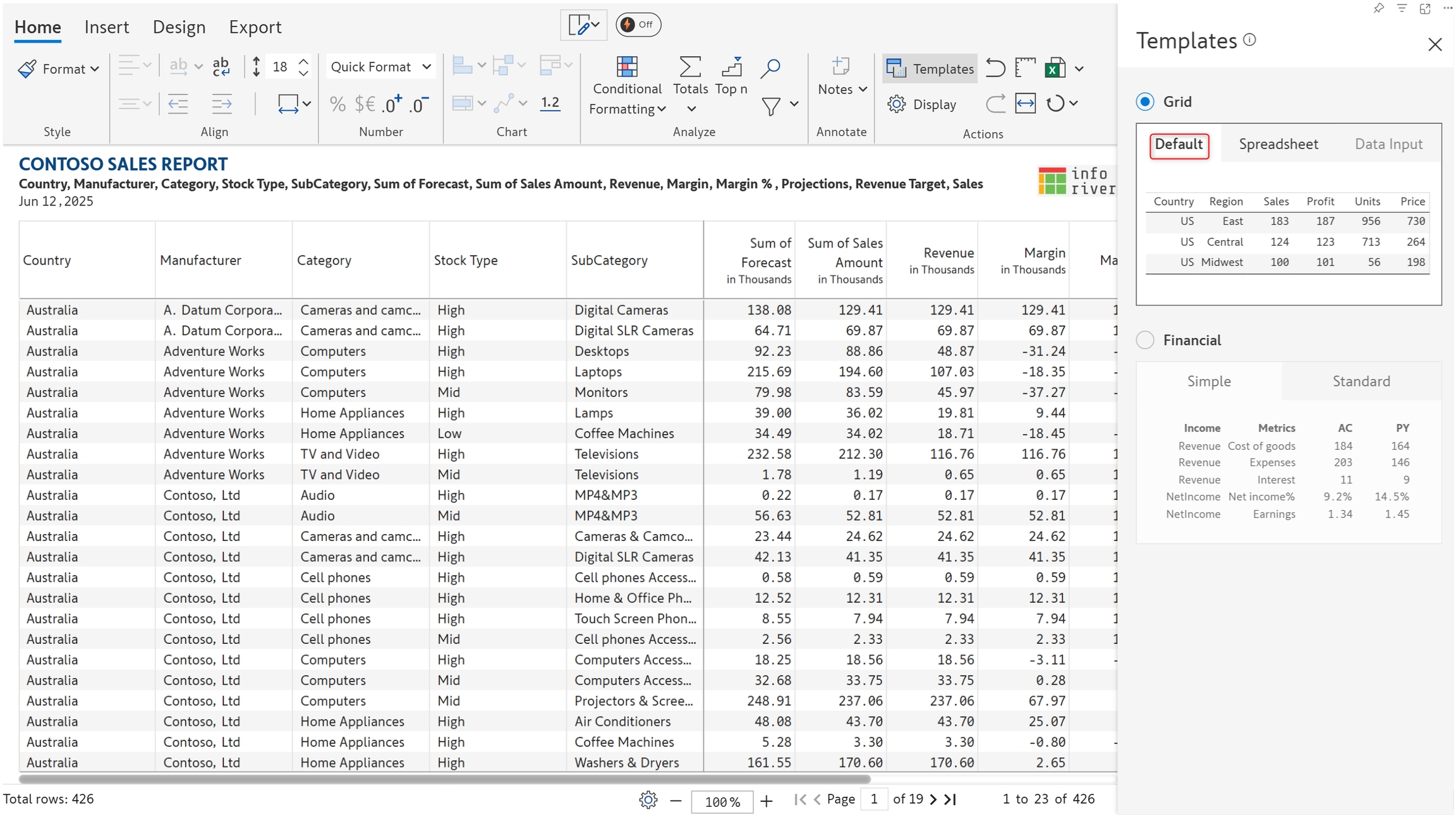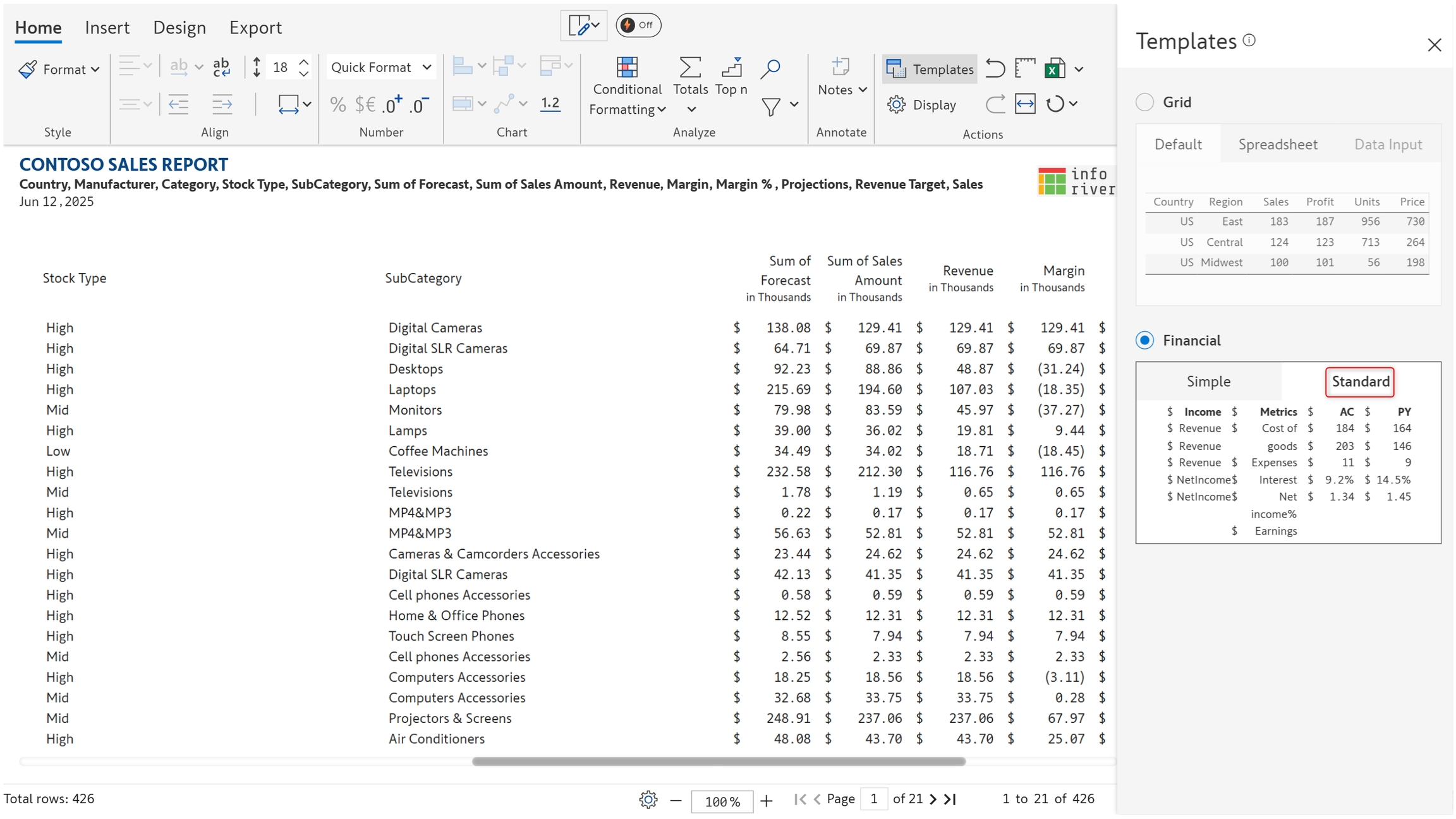 The financial templates are ideal for building financial reports and statements. It comes in two variations, the Simple and the Standard option.