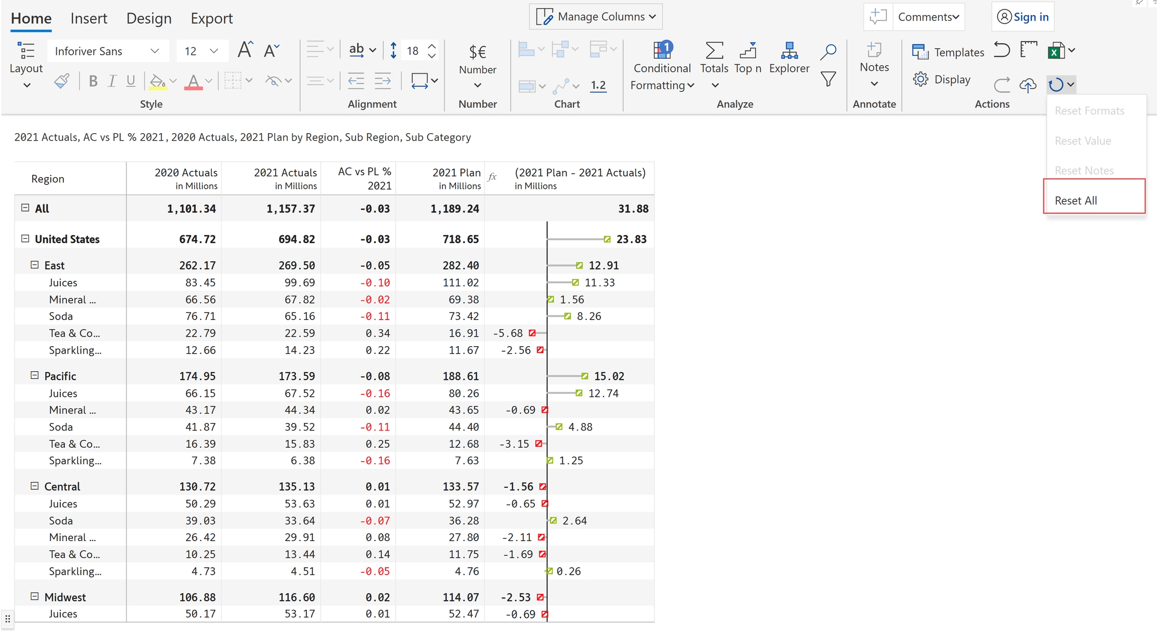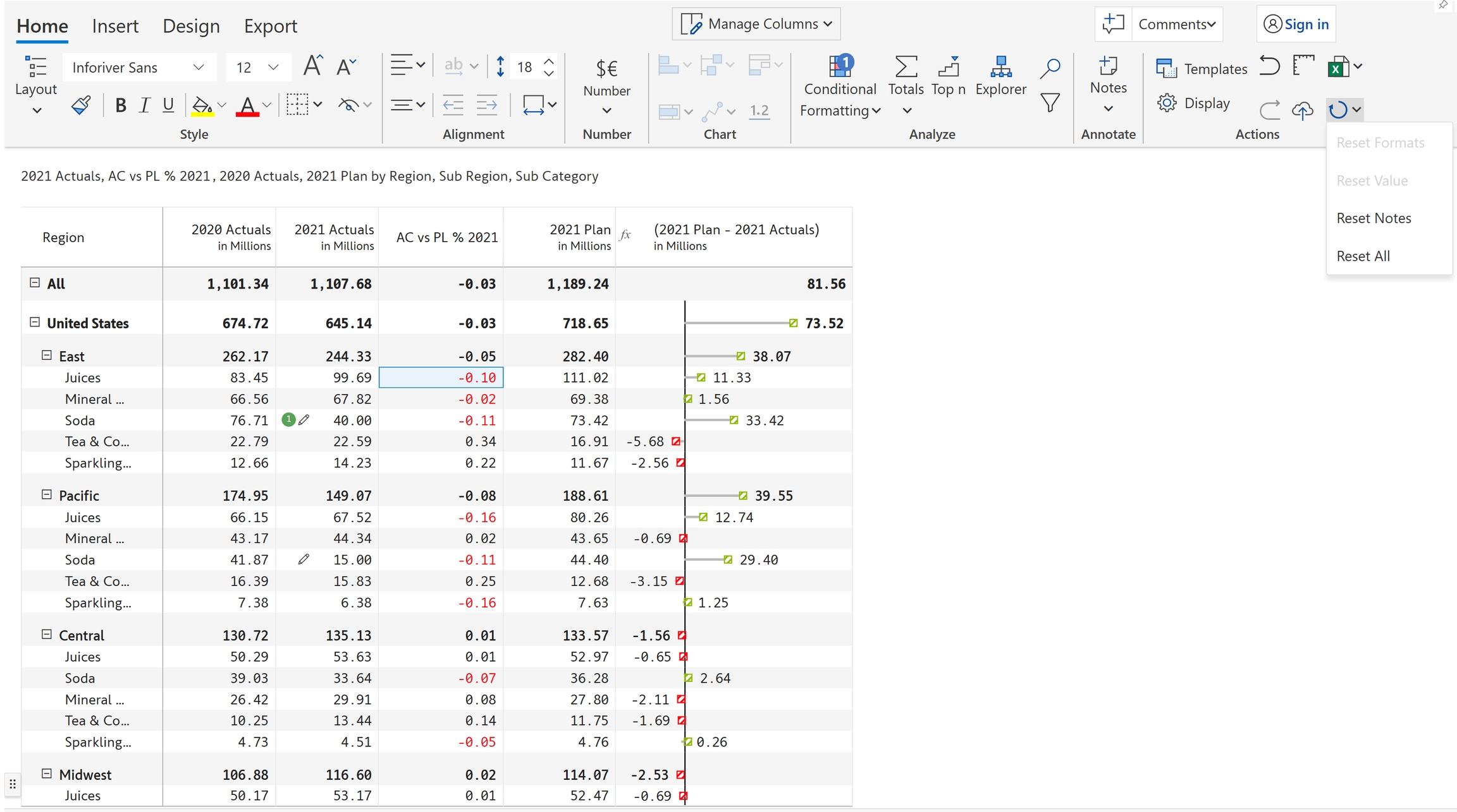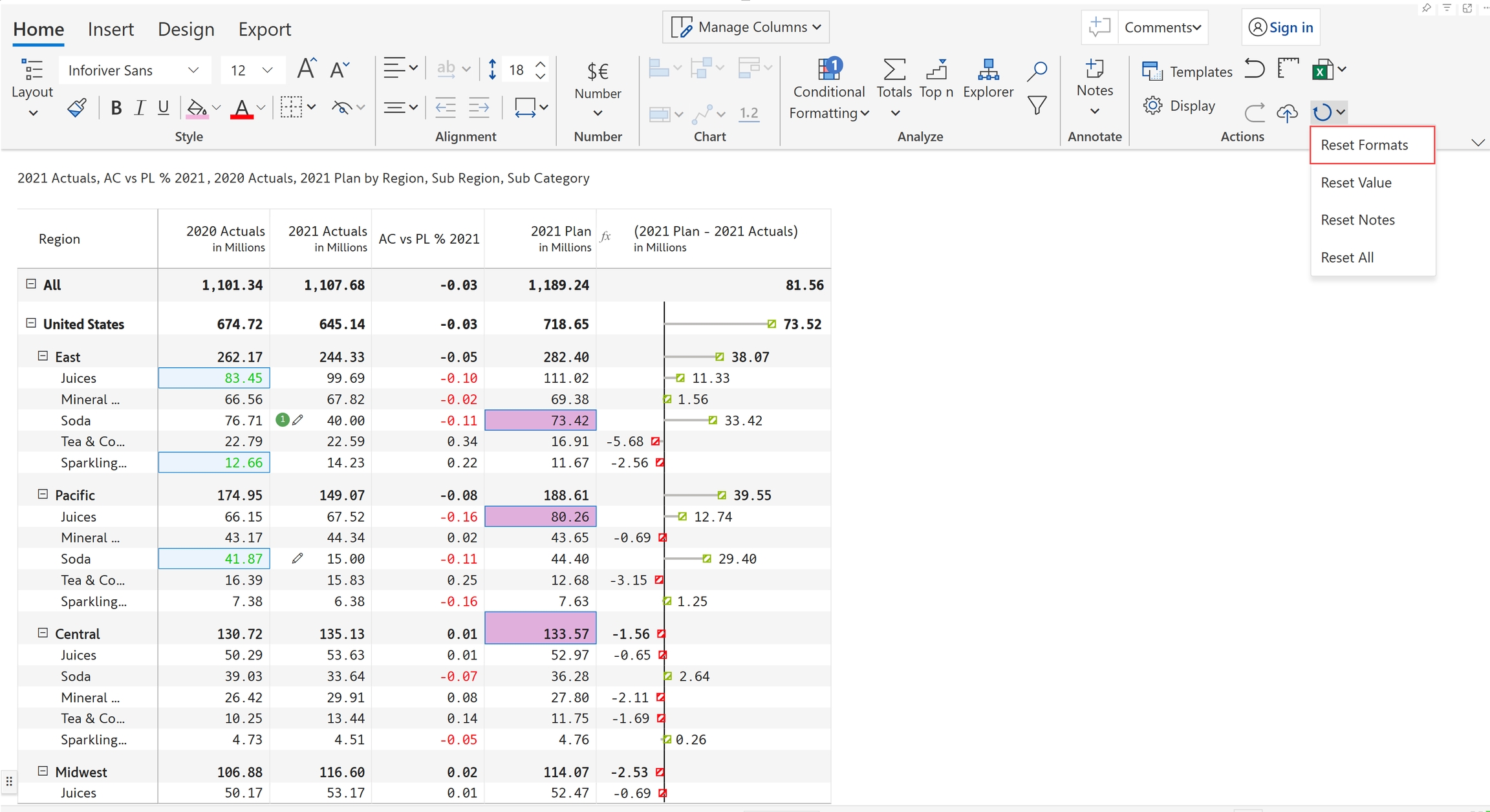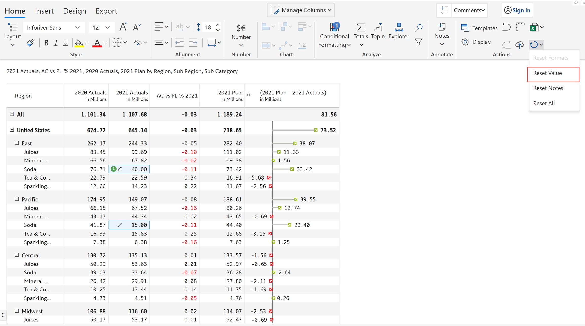 Reset option allows you to remove or revert any changes that have been made to a particular cell or range of cells, and restore them to their original state. Inforiver provides various reset options such as Reset formats, Reset value, Reset notes and Reset all.