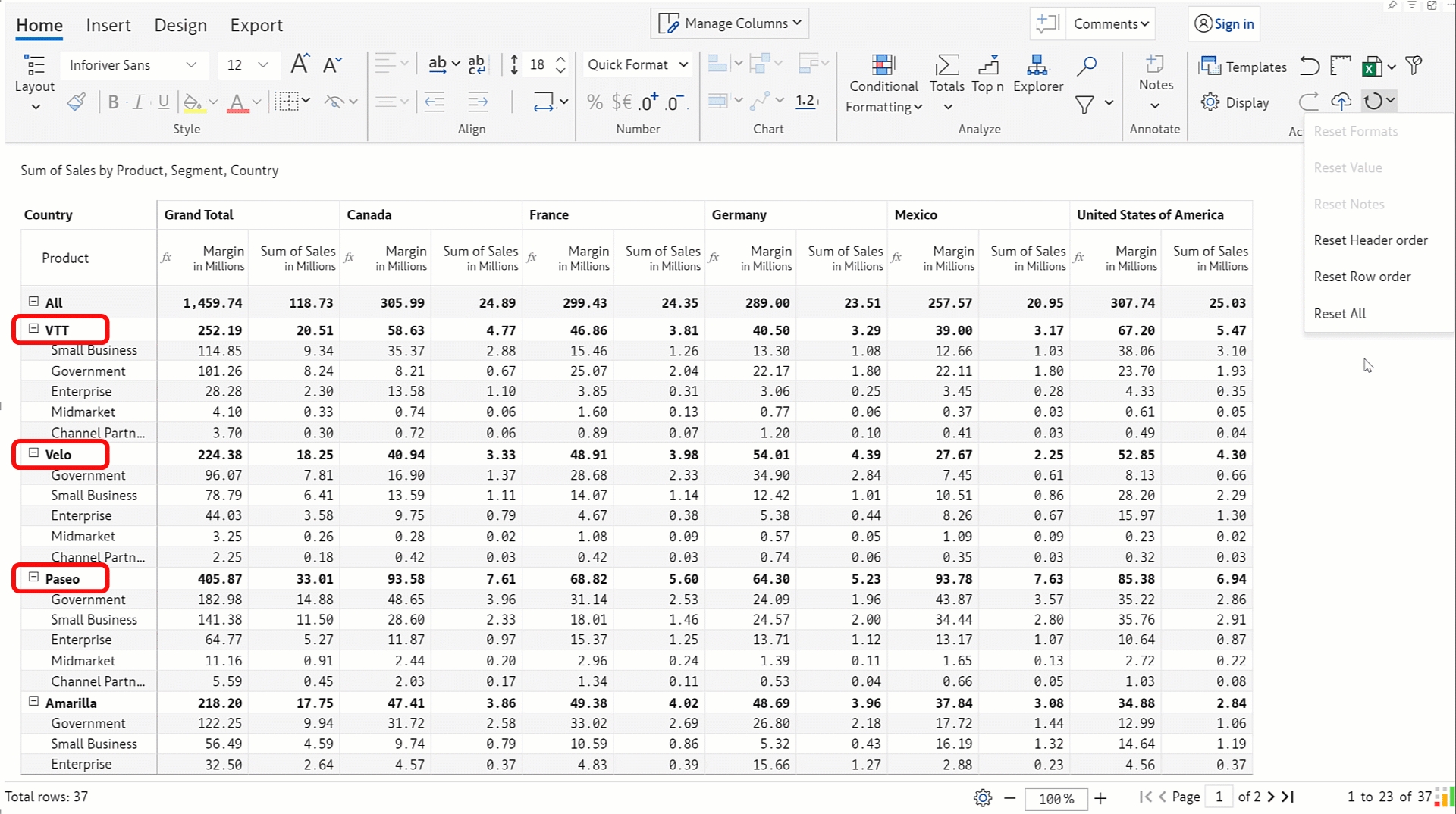 Reset row order: This option reverts to the original ordering of row categories.