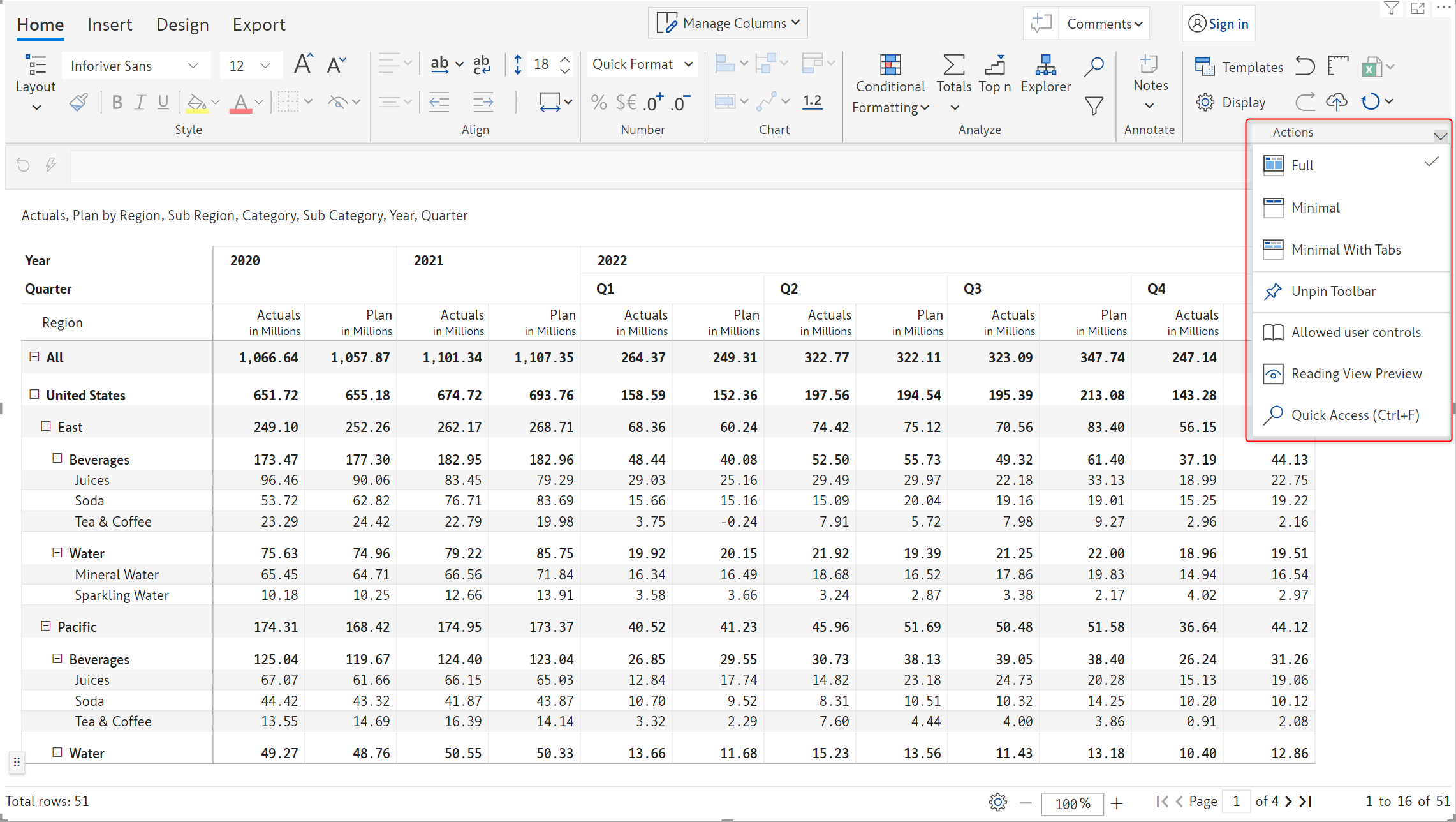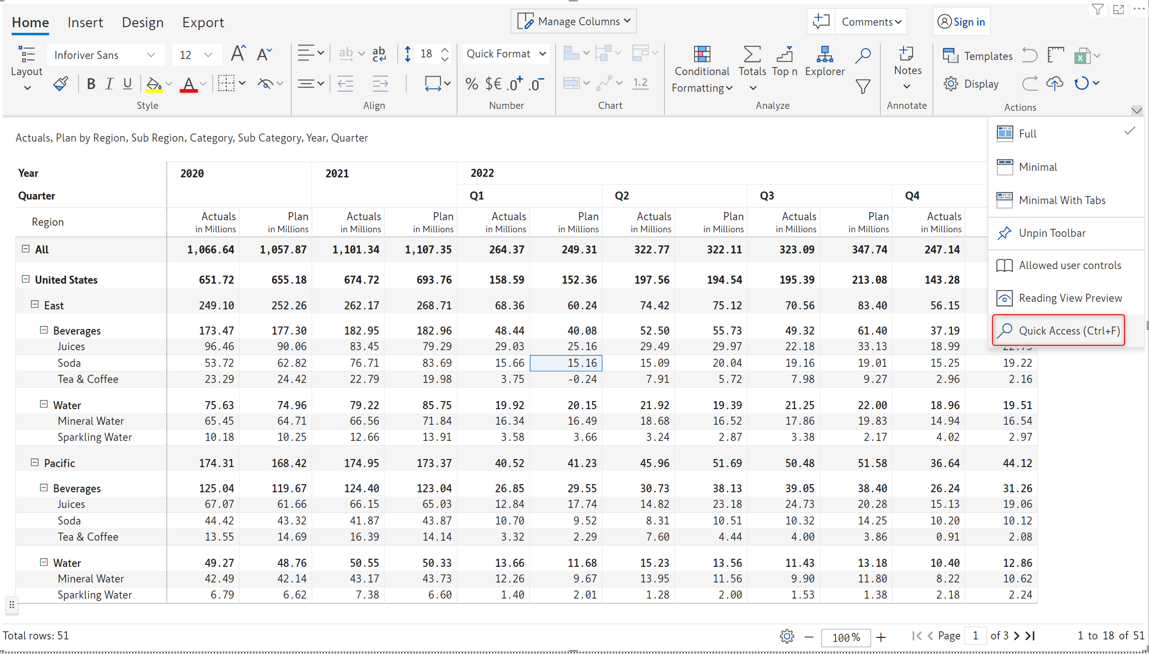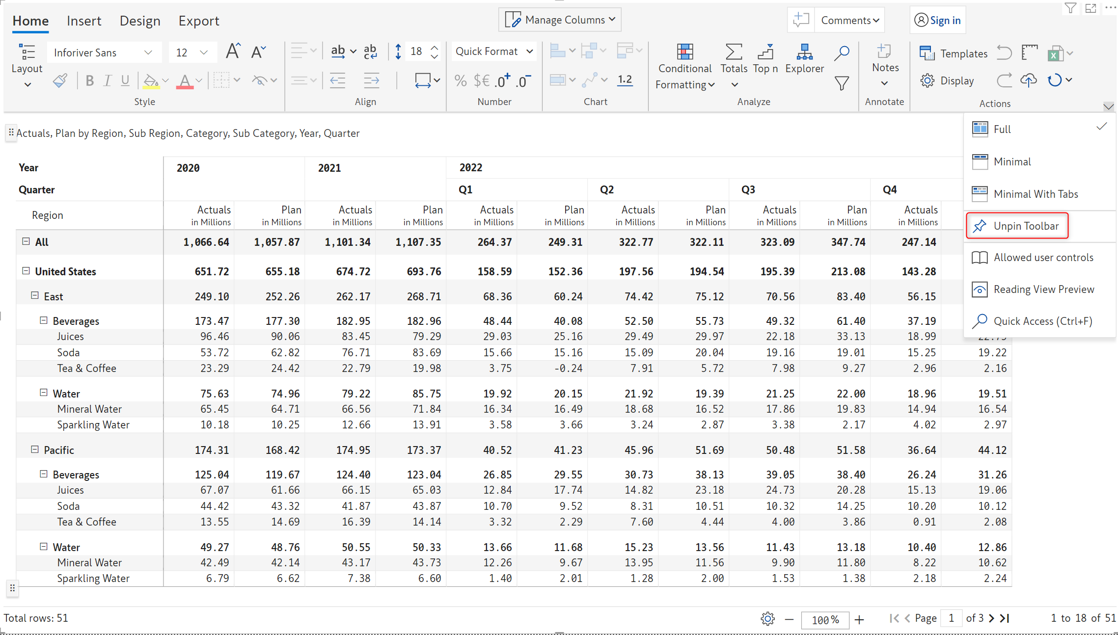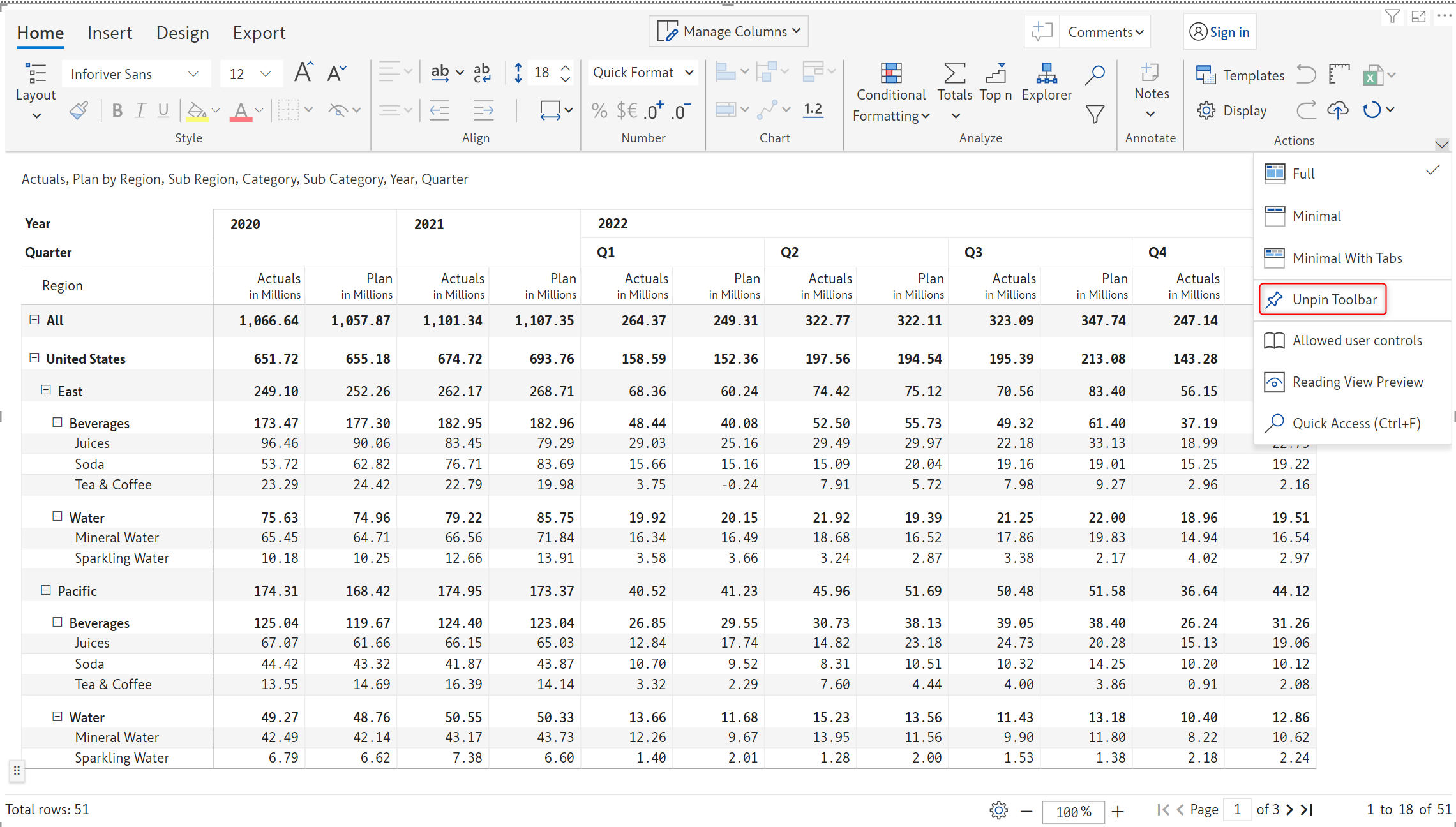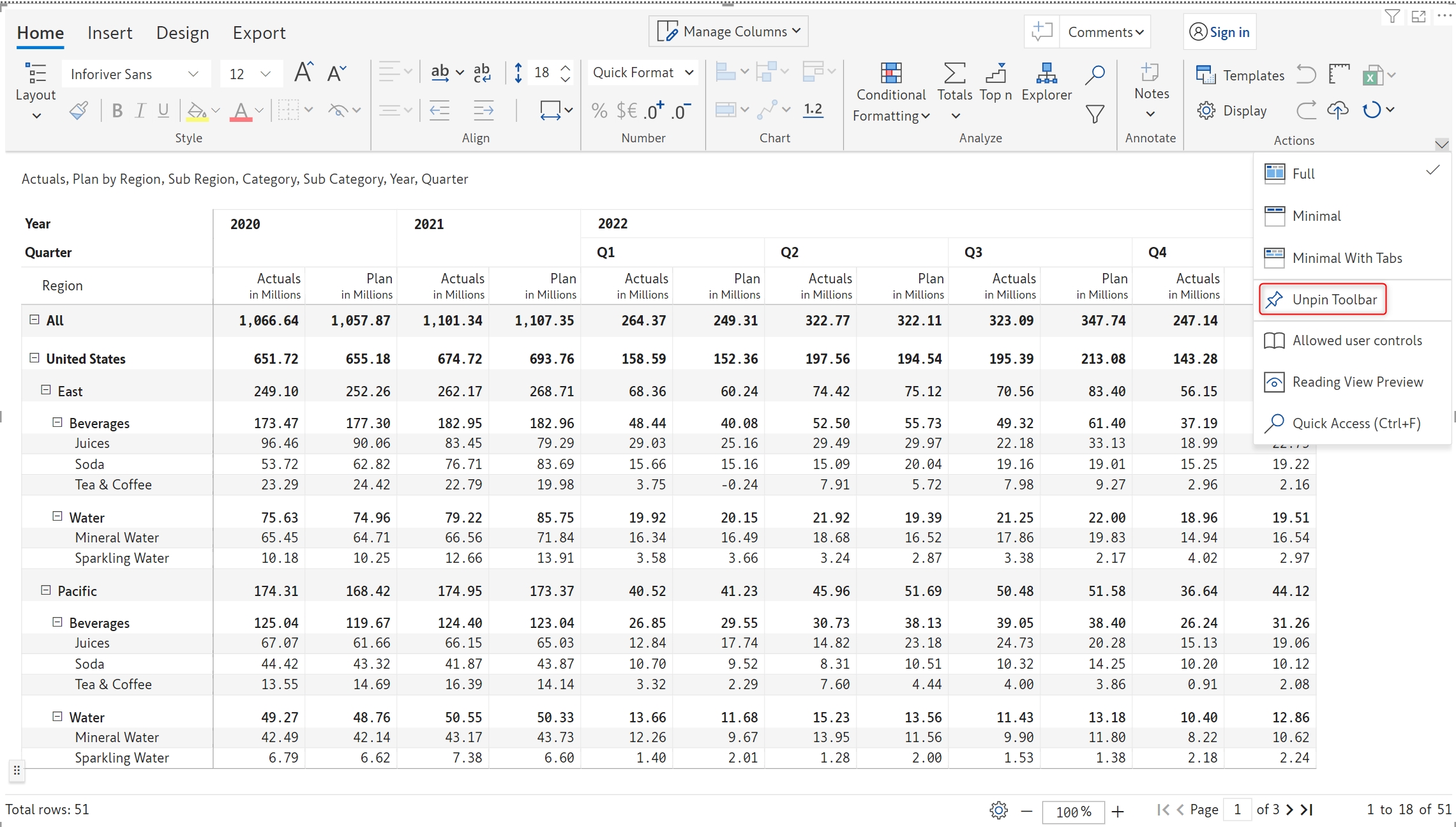 Inforiver now offers Excel-like floating toolbar in the reading view mode on the selected report elements (row, column, or cell) for improved discoverability of features and improved user experience.