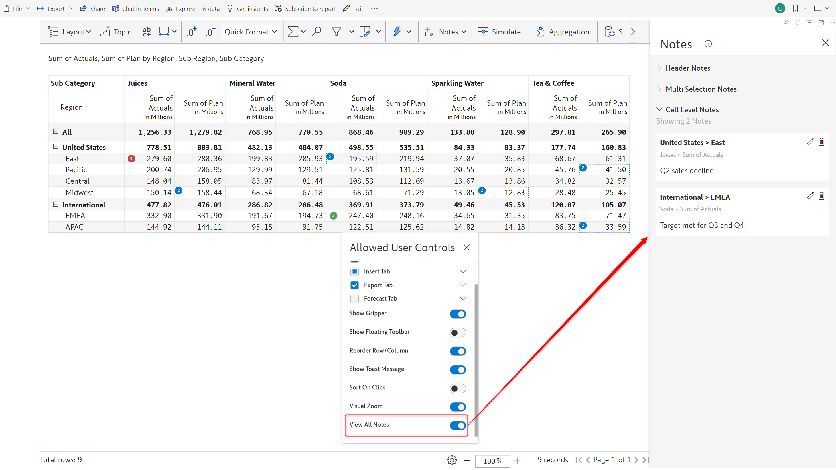 Report users can view all the notes added to a report in a single, consolidated window. The *View All Notes* option in the Allowed user controls setting displays the notes side pane by default in the reading view.