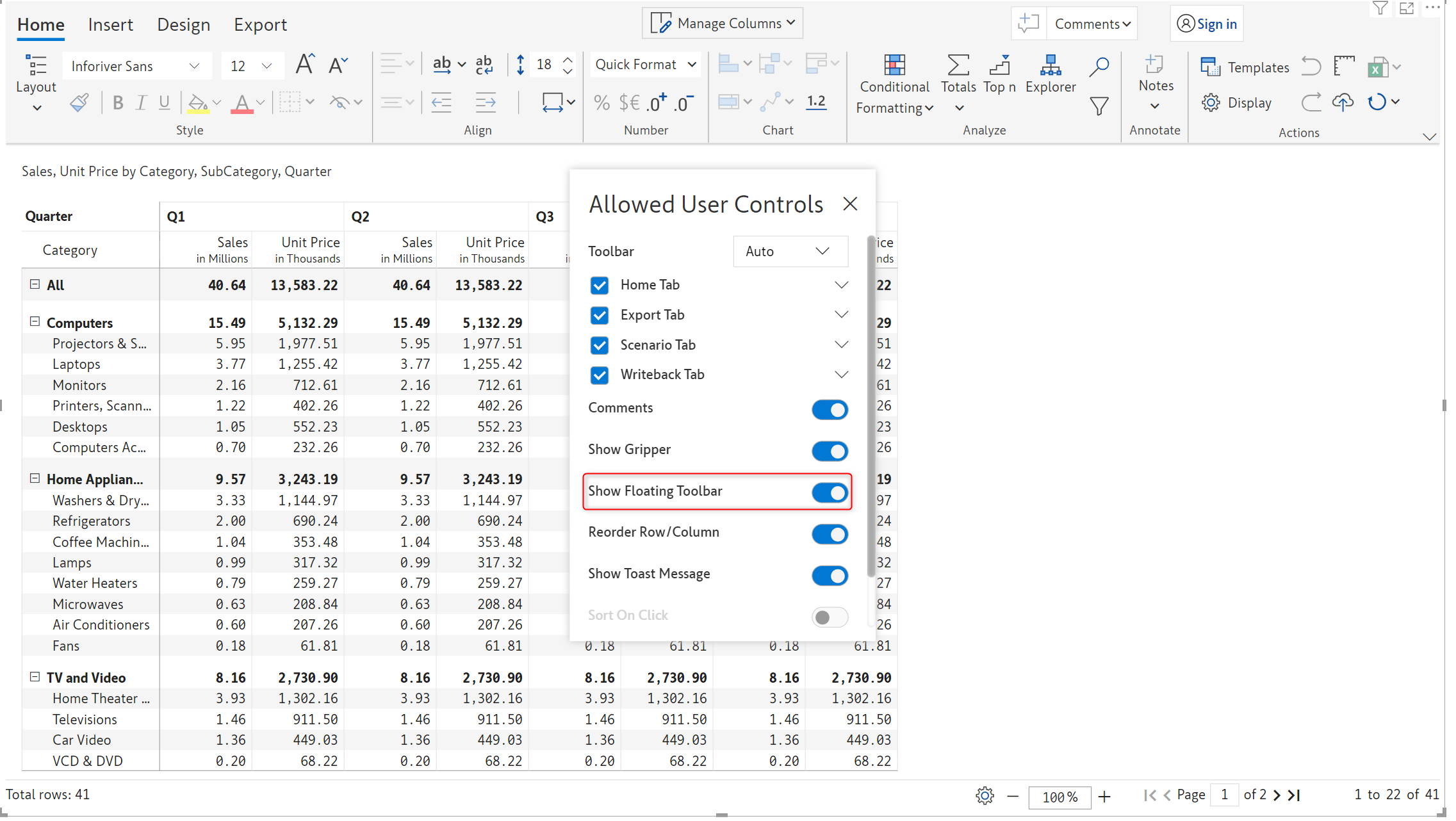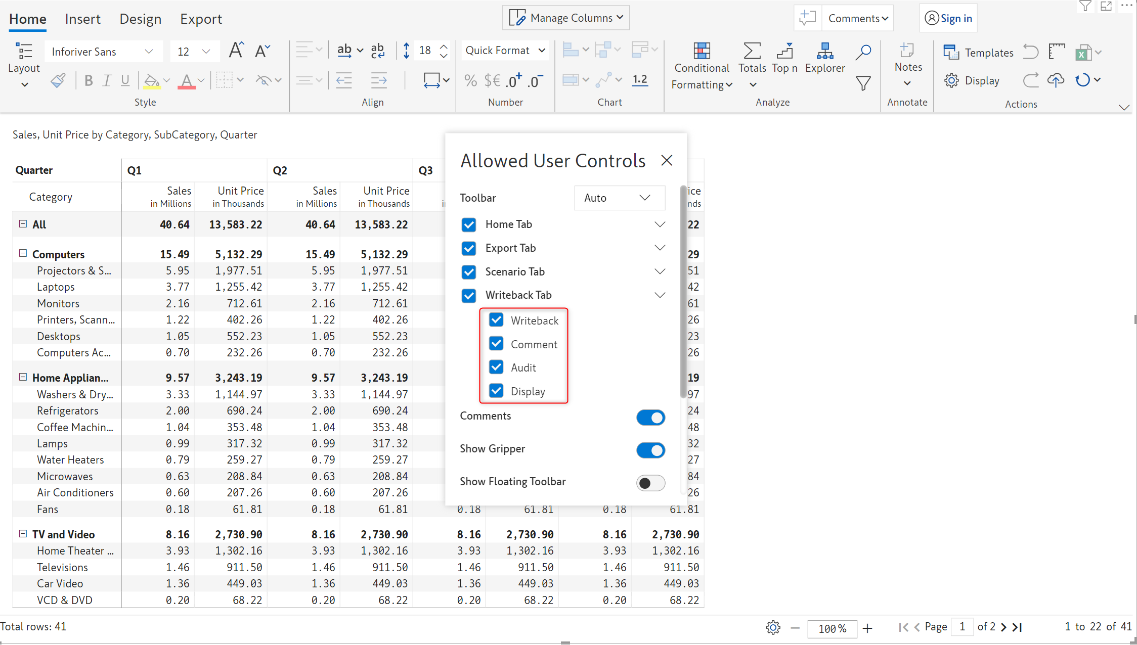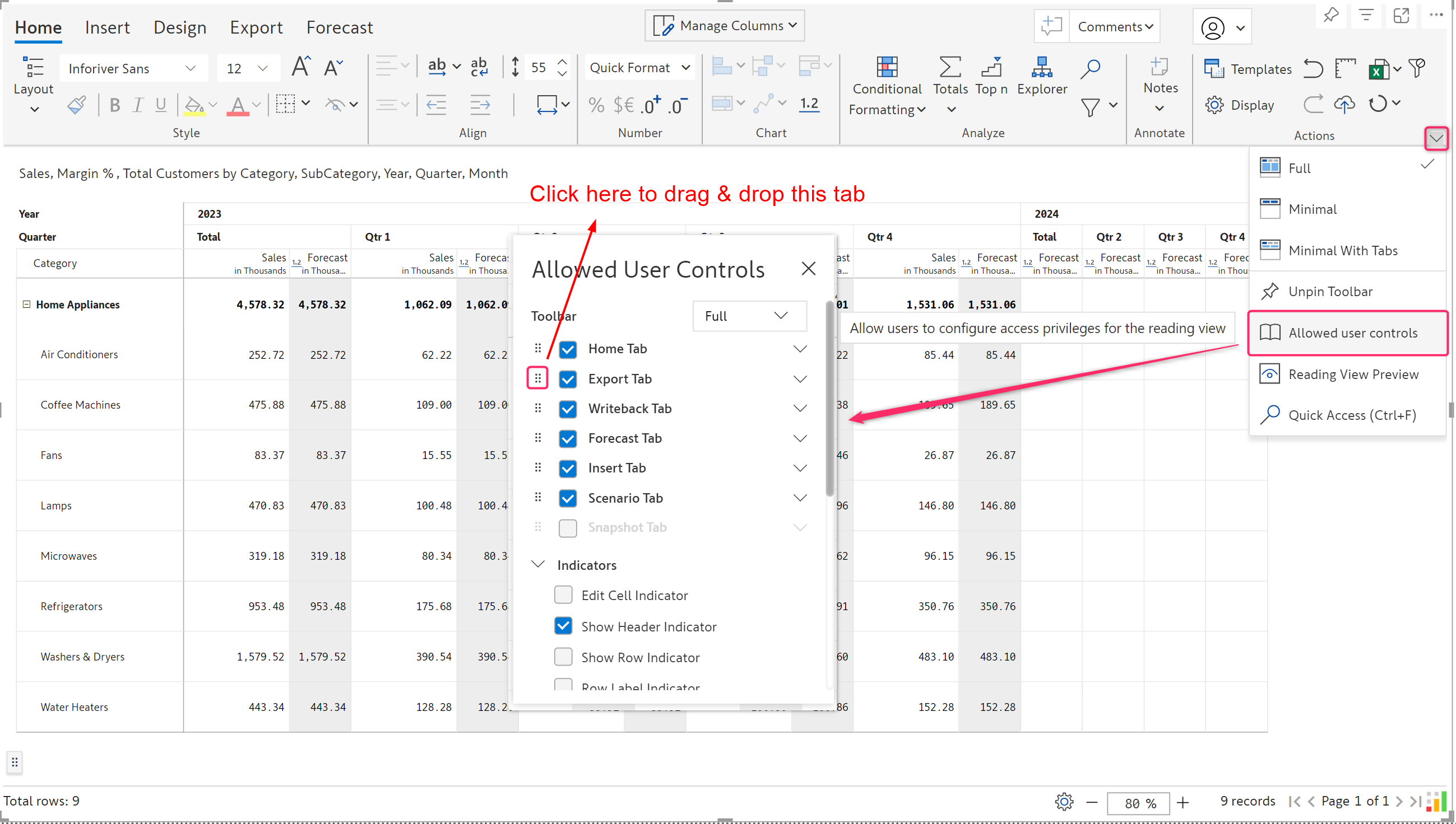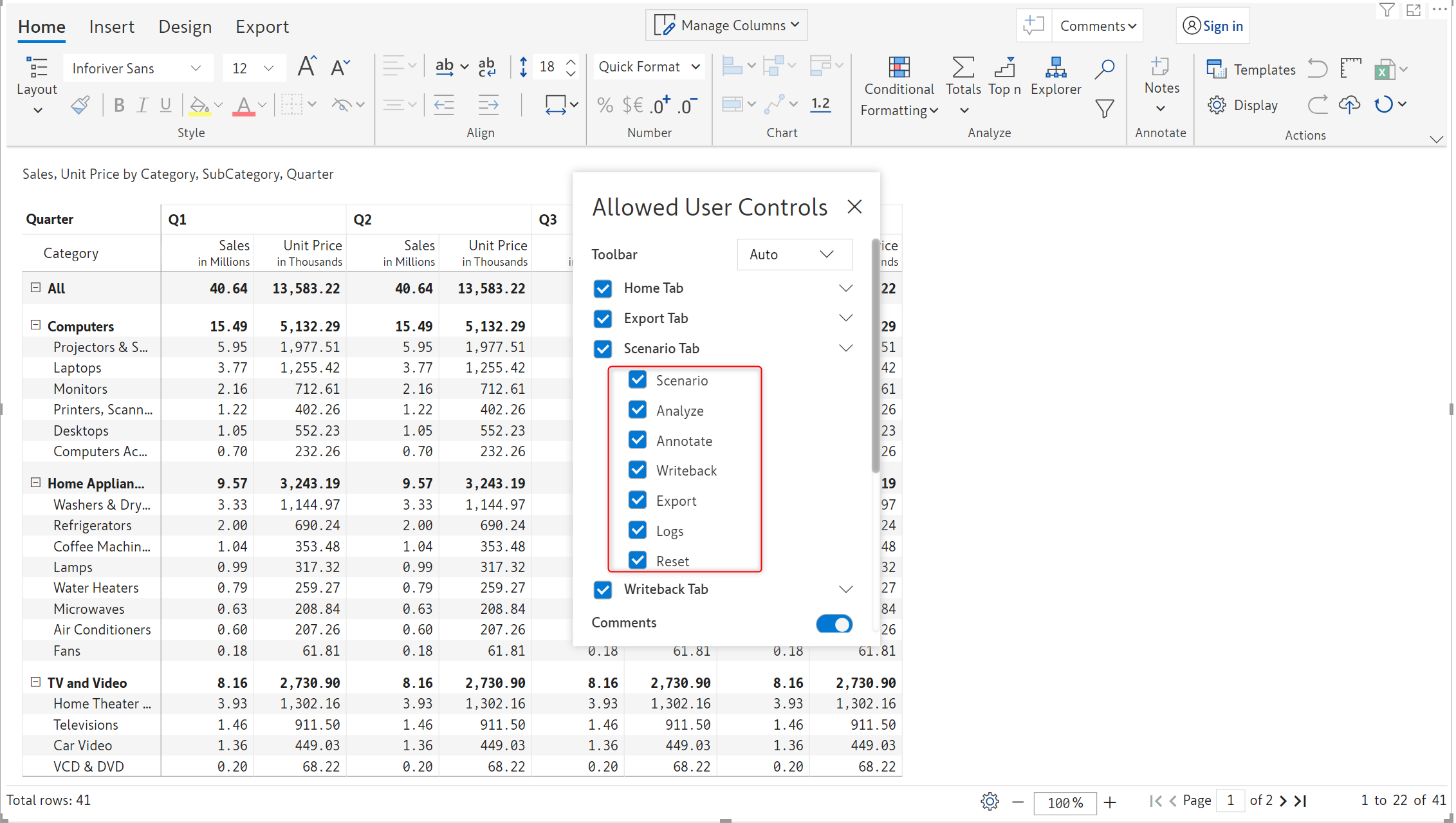 Toolbar items in the *Insert* tab, such as Data input, Simulations, Aggregations, Forecasts, Scenarios, etc, can be leveraged in reading mode. You can control the features that will be available in the reading view from the *Allowed User Controls* window.