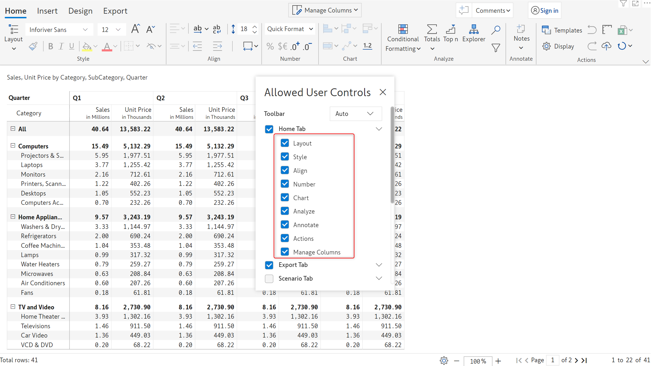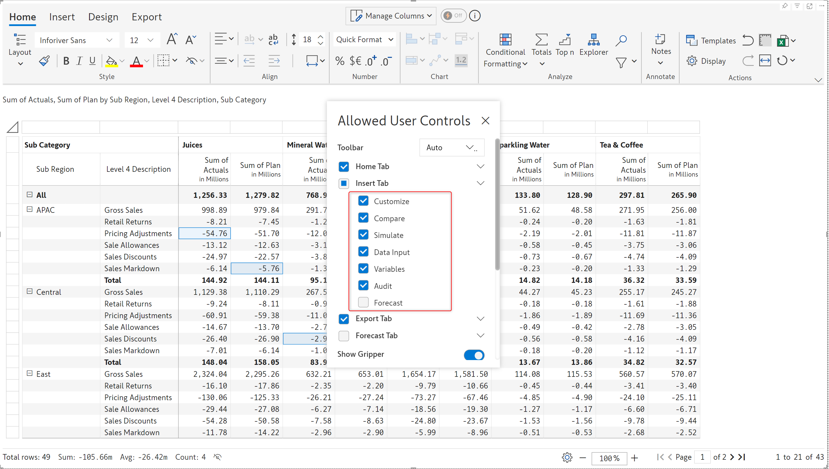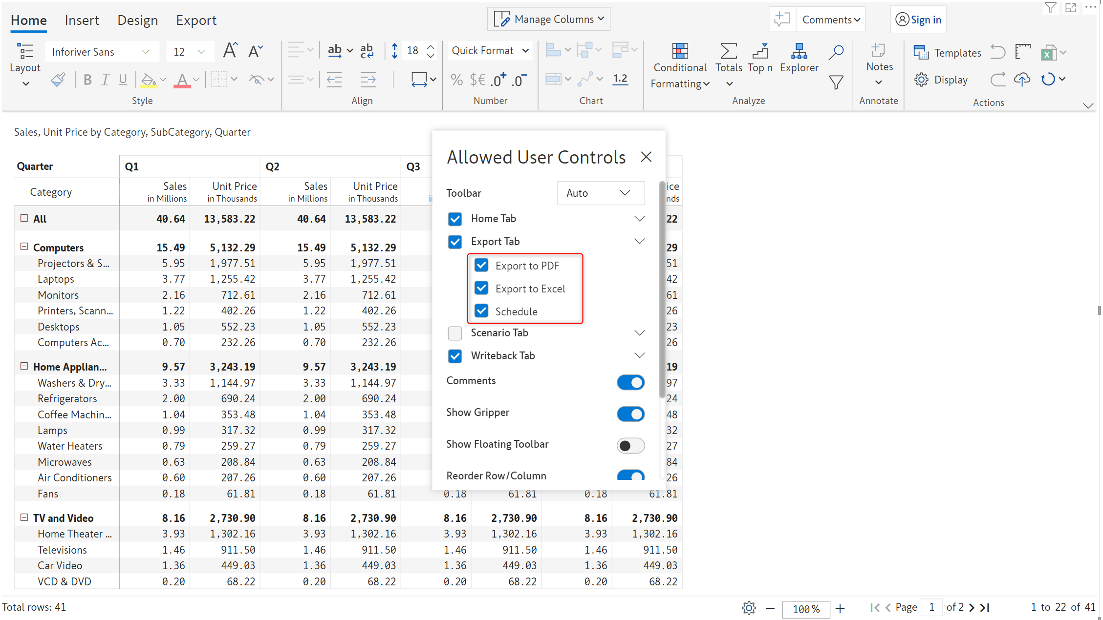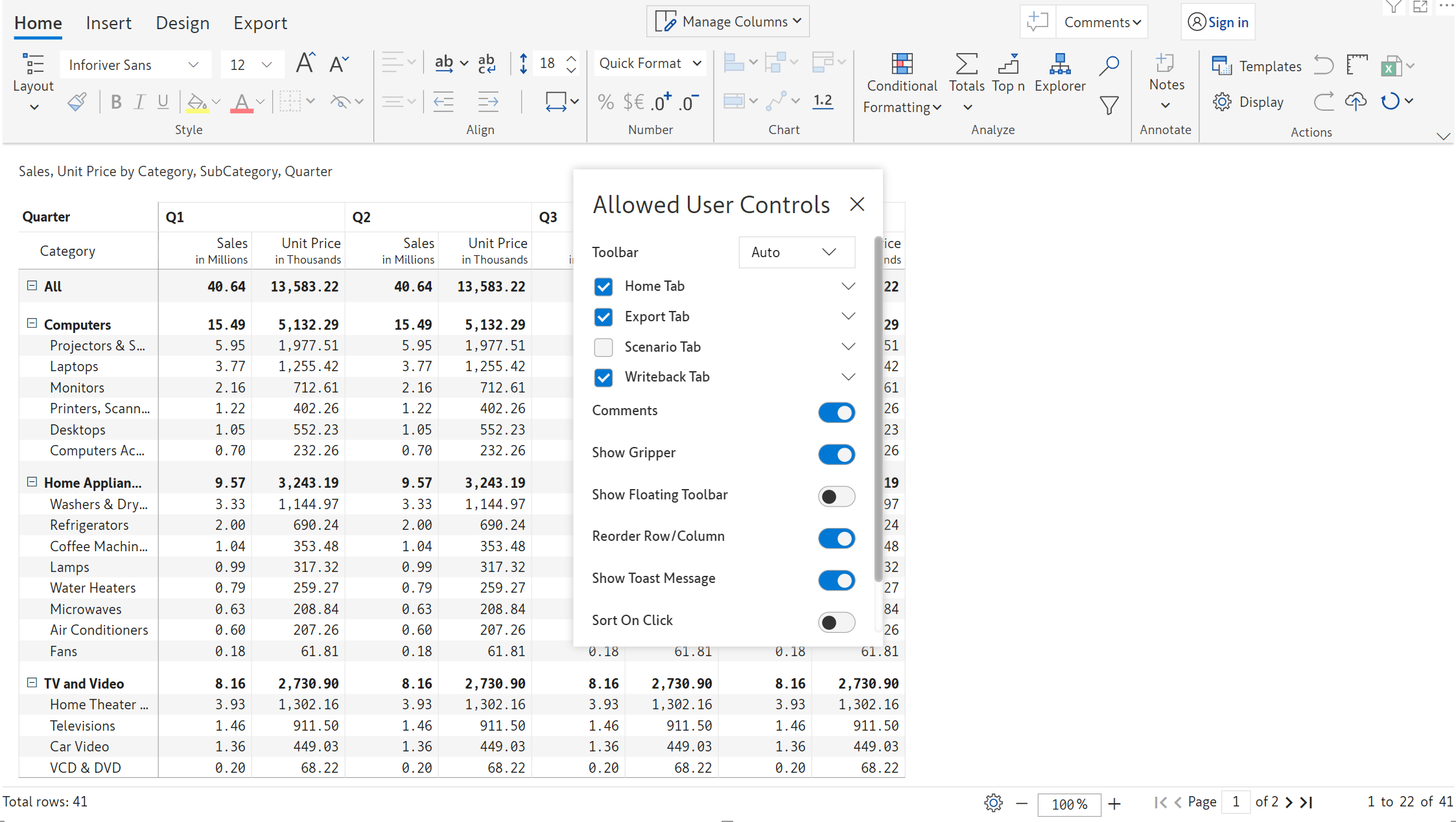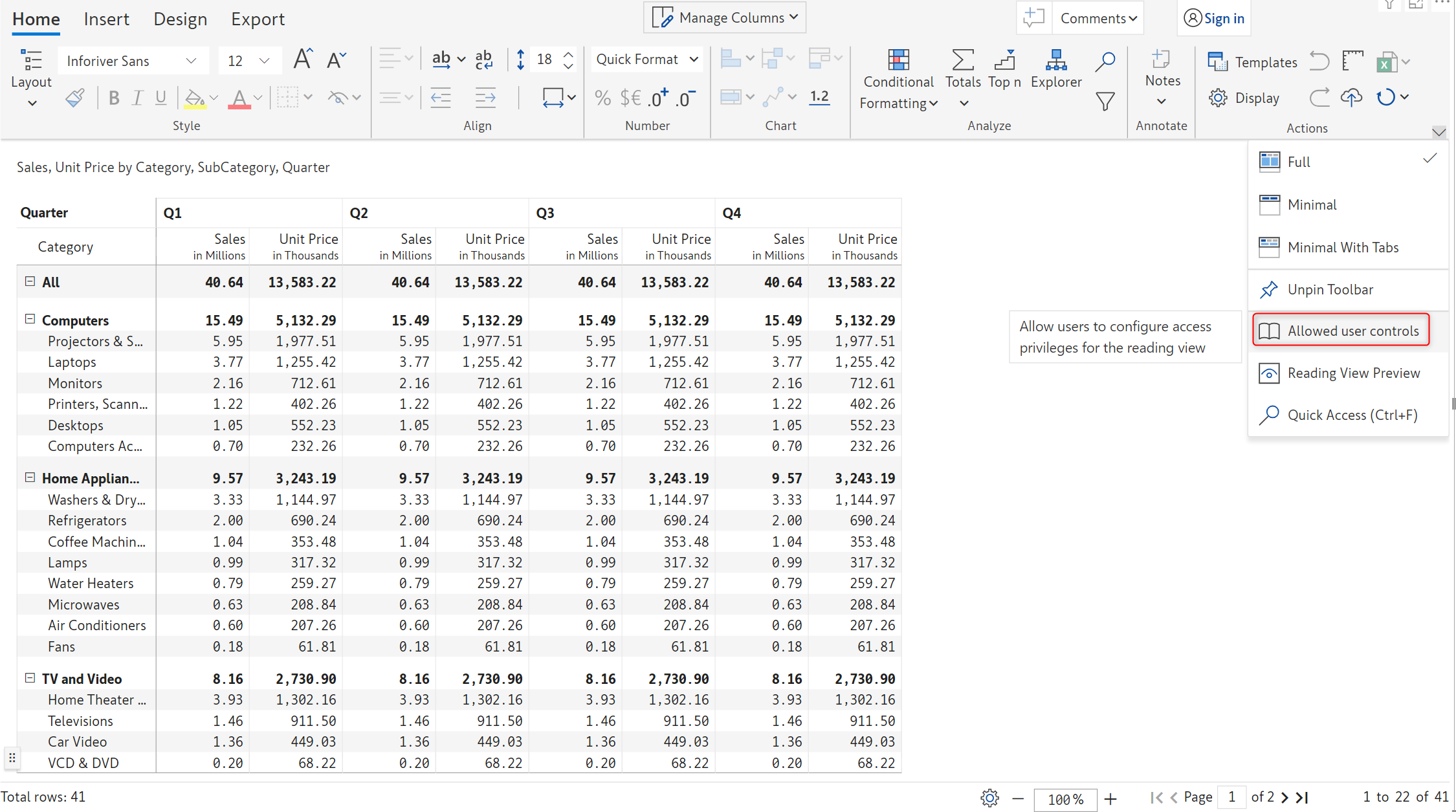 Toolbar items in the *Insert* tab, such as Data input, Simulations, Aggregations, Forecasts, Scenarios, etc, can be leveraged in reading mode. You can control the features that will be available in the reading view from the *Allowed User Controls* window.
