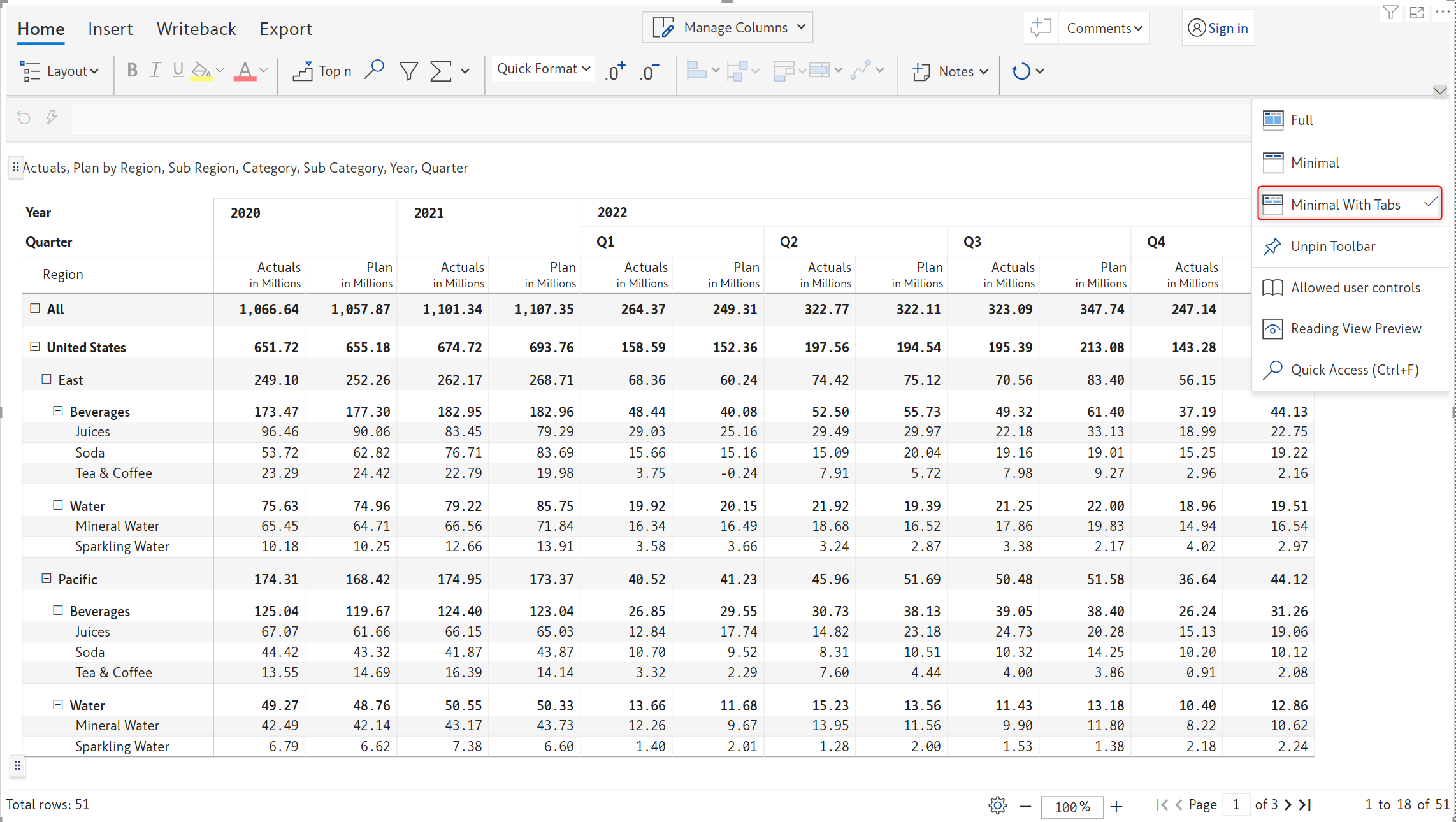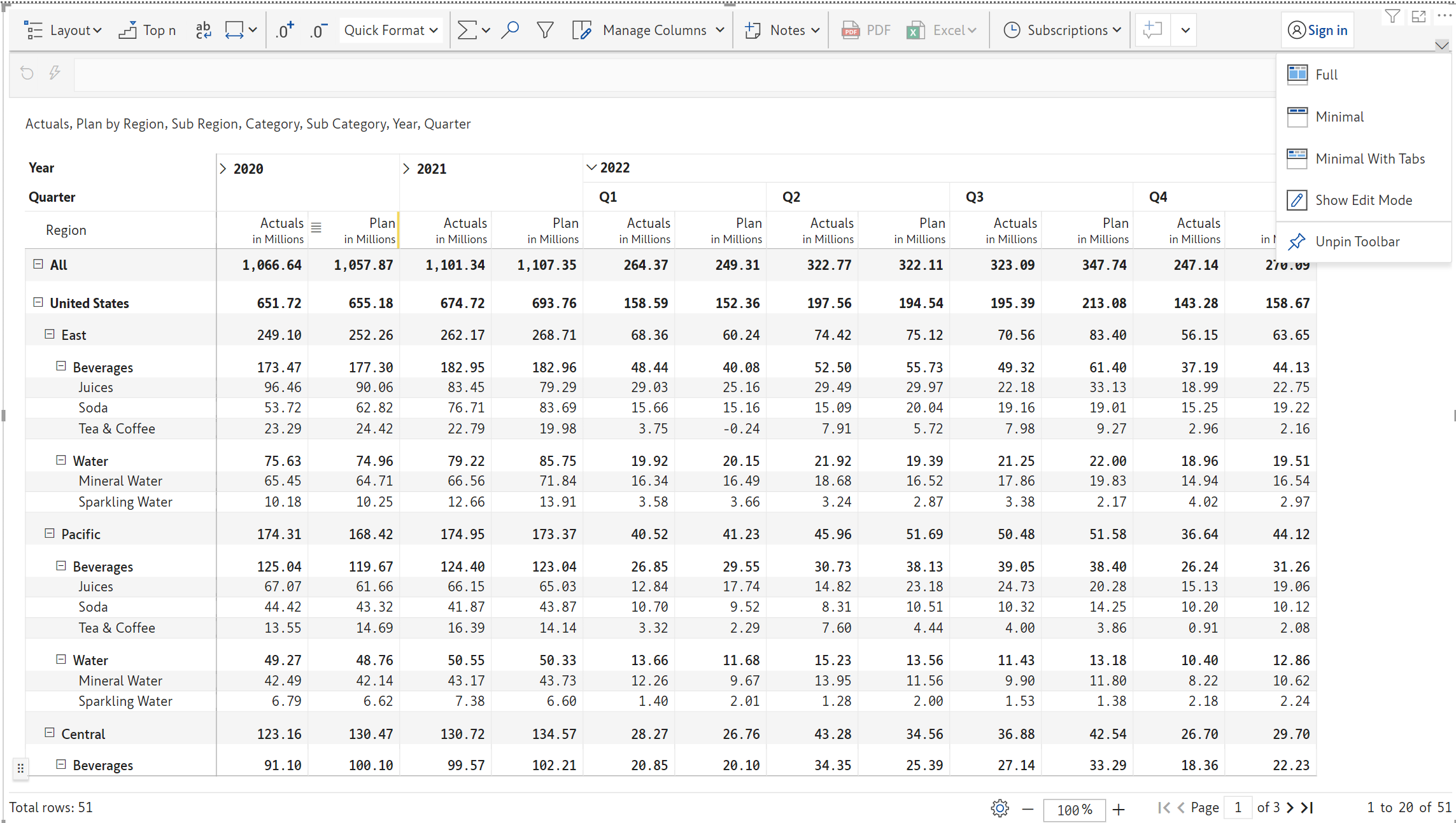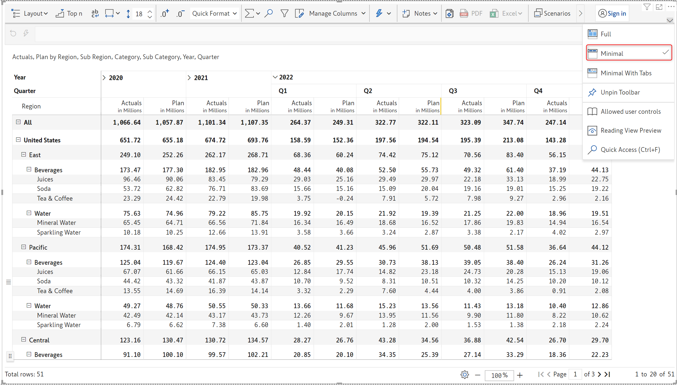 The 'Minimal' option shows the minimal view of the toolbar with options such as Layout, Top N, Auto fit, Row height, Notes, Export and many more as shown in the below image.&#x20;