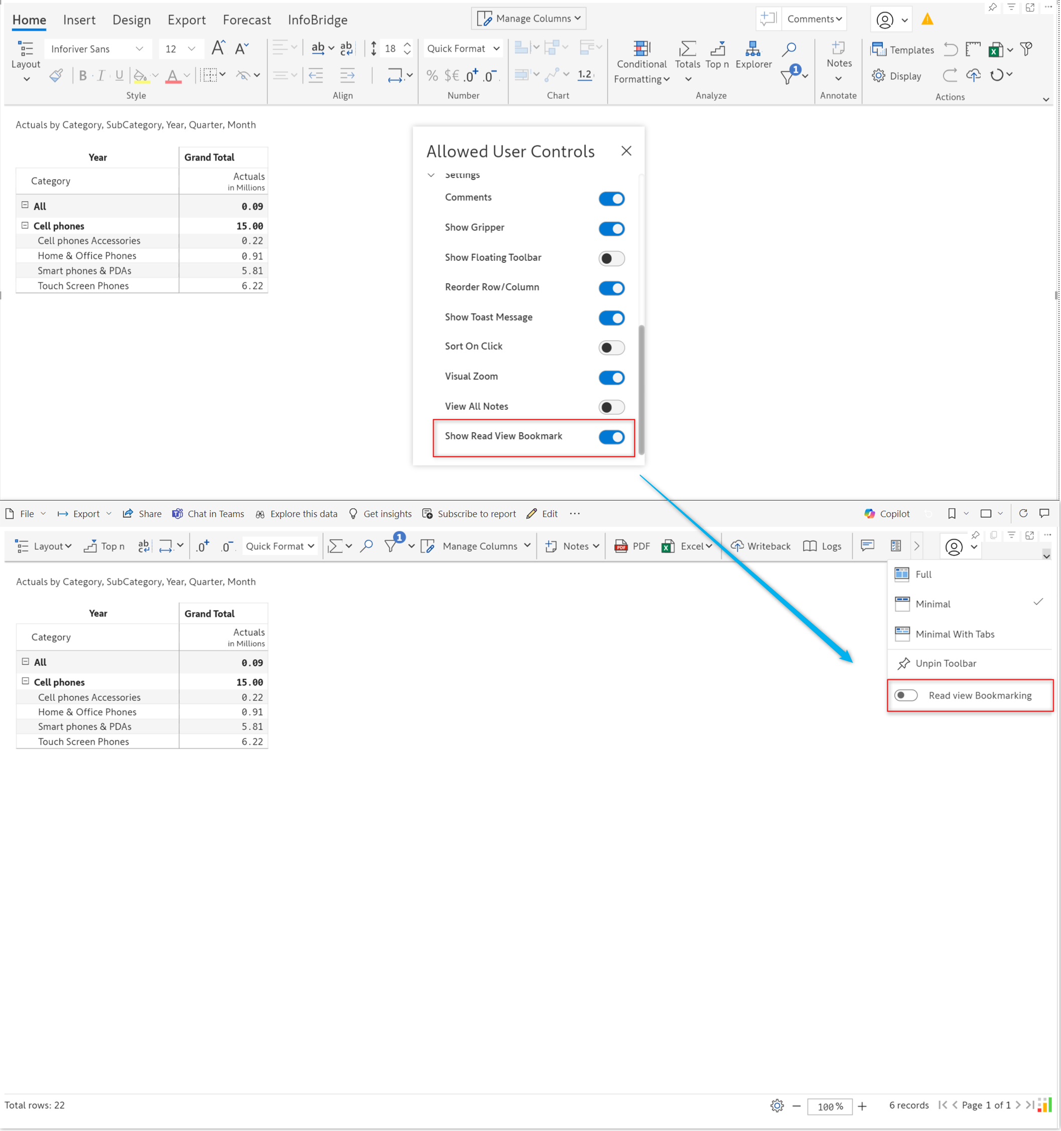 Report viewers may apply formatting/Inforiver filters for data analysis and save their changes using the Power BI bookmarking feature. When the **Show read View Bookmark** option is enabled in Allowed user controls, in reading view, you will notice a **Read view bookmarking** toggle.&#x20;