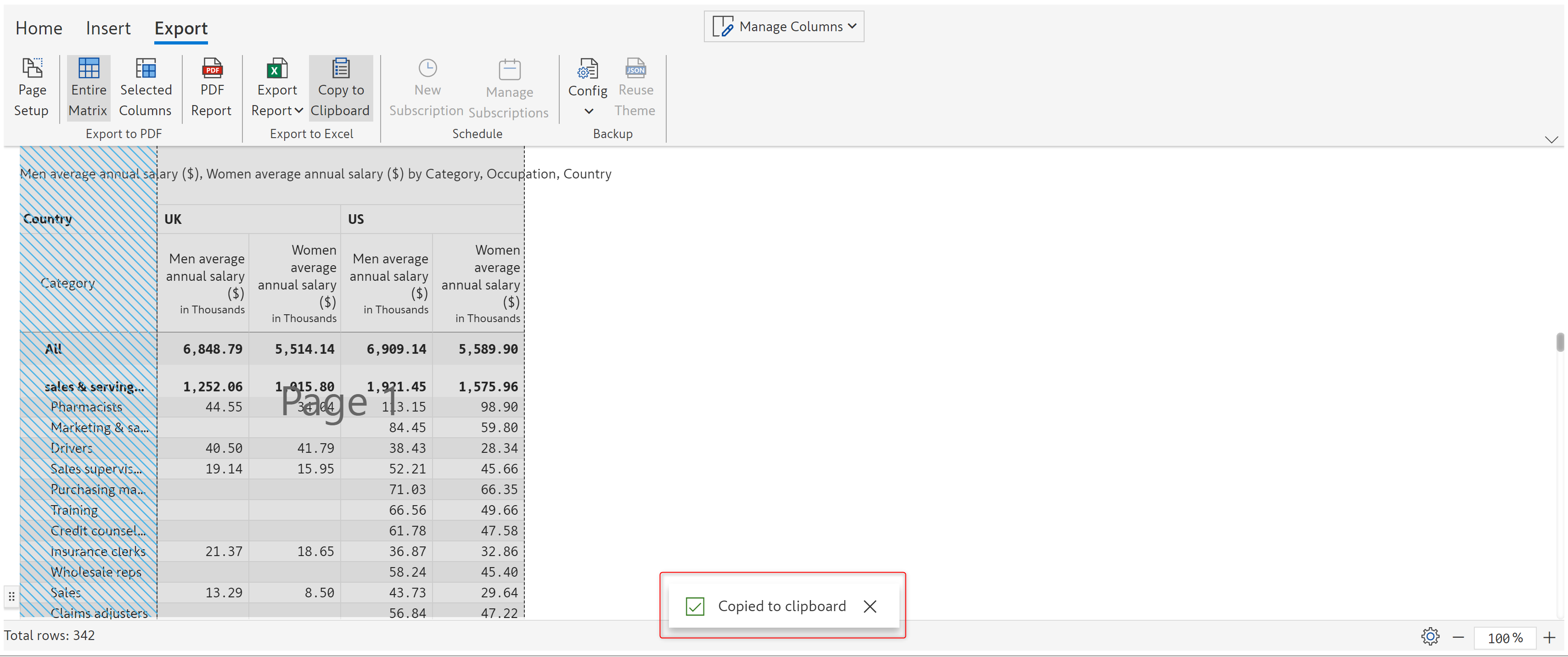 Enabling this option will display the 'Export' tab in the toolbar if the report is in reading view mode. Click on the caret icon to the right of the 'Export' tab to expand it. This will display additional sub-options.&#x20;