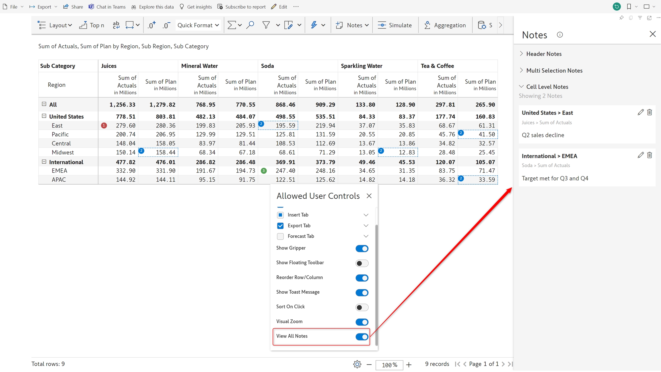 Report users can view all the notes added to a report in a single, consolidated window. The View All Notes option in the Allowed user controls setting displays the notes side pane by default in the reading view.