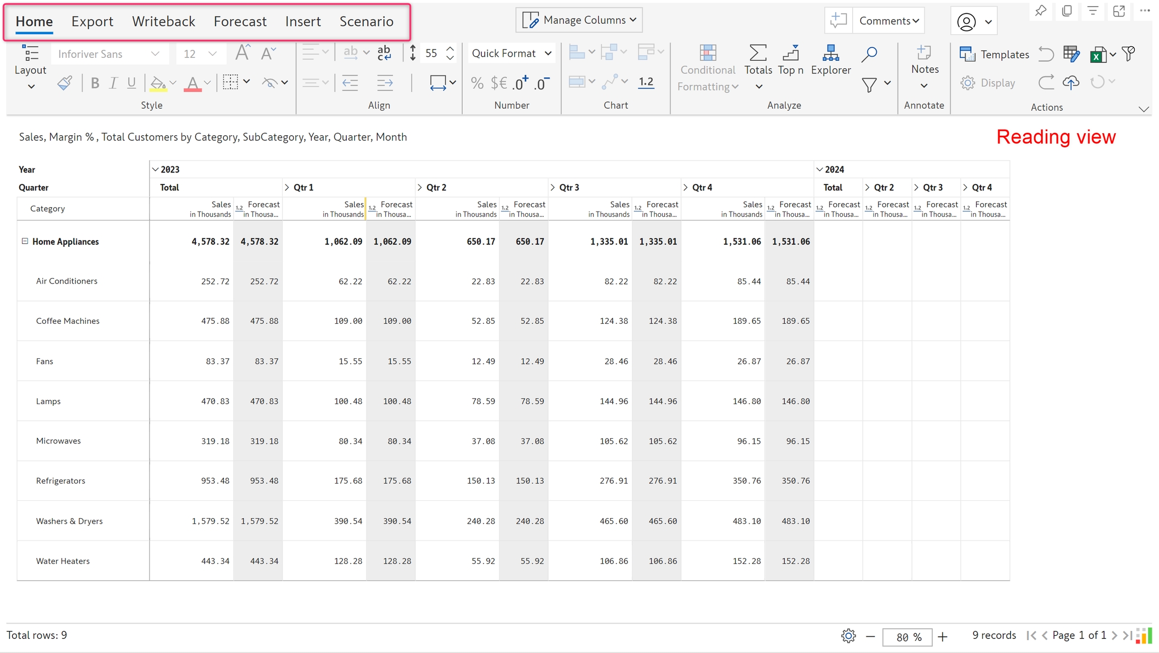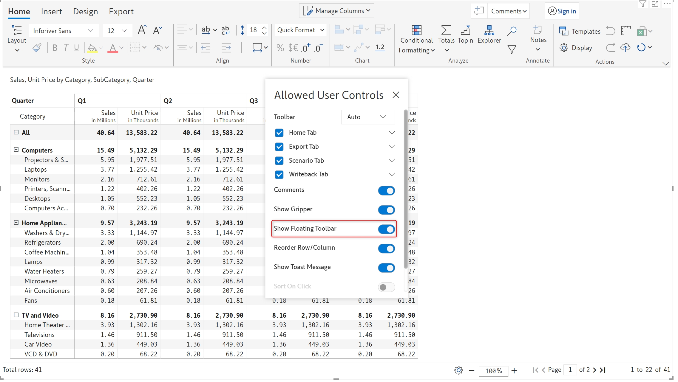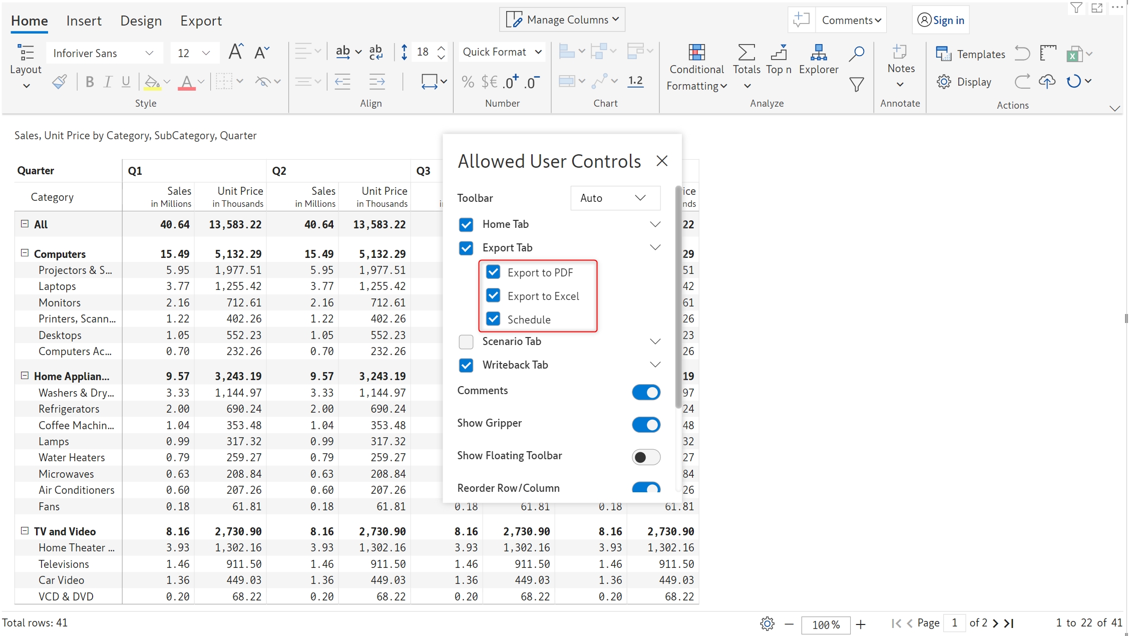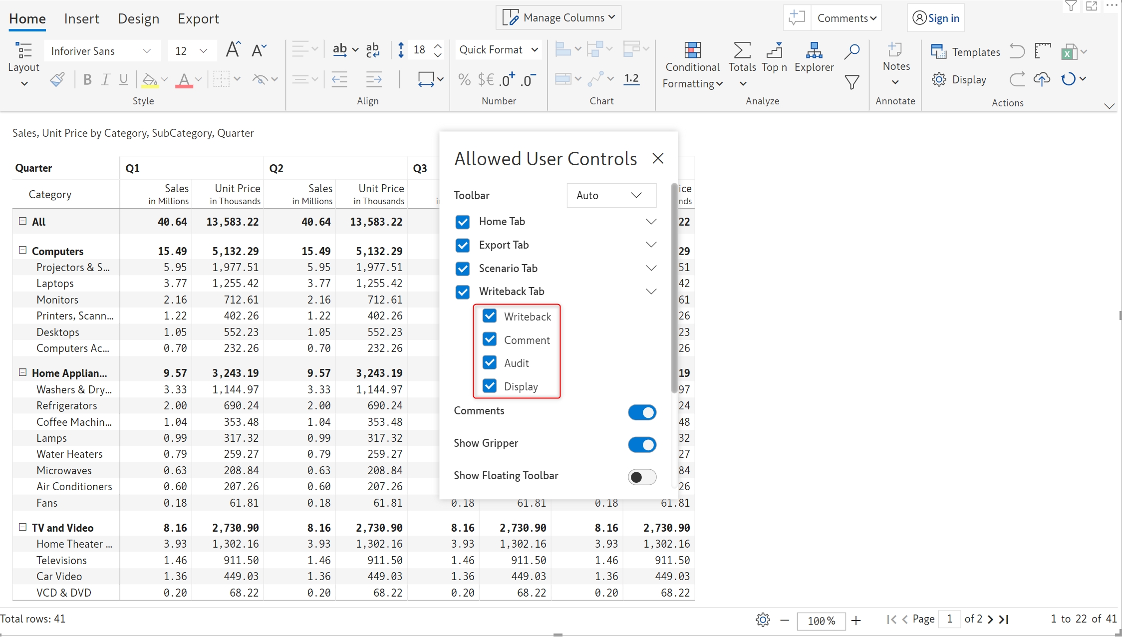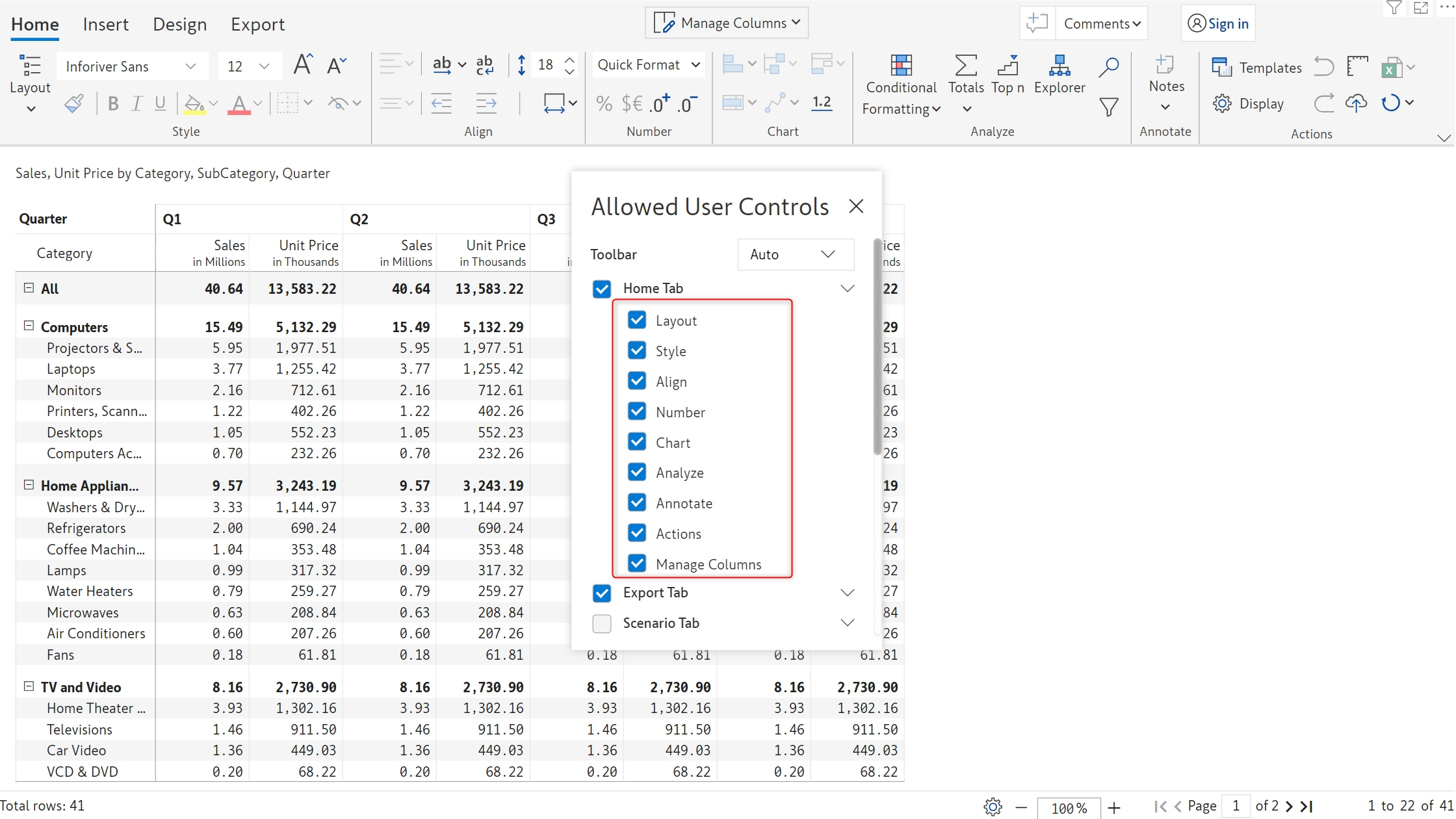Toolbar items in the Insert tab, such as Data input, Simulations, Aggregations, Forecasts, Scenarios, etc, can be leveraged in reading mode. You can control the features that will be available in the reading view from the Allowed User Controls window.