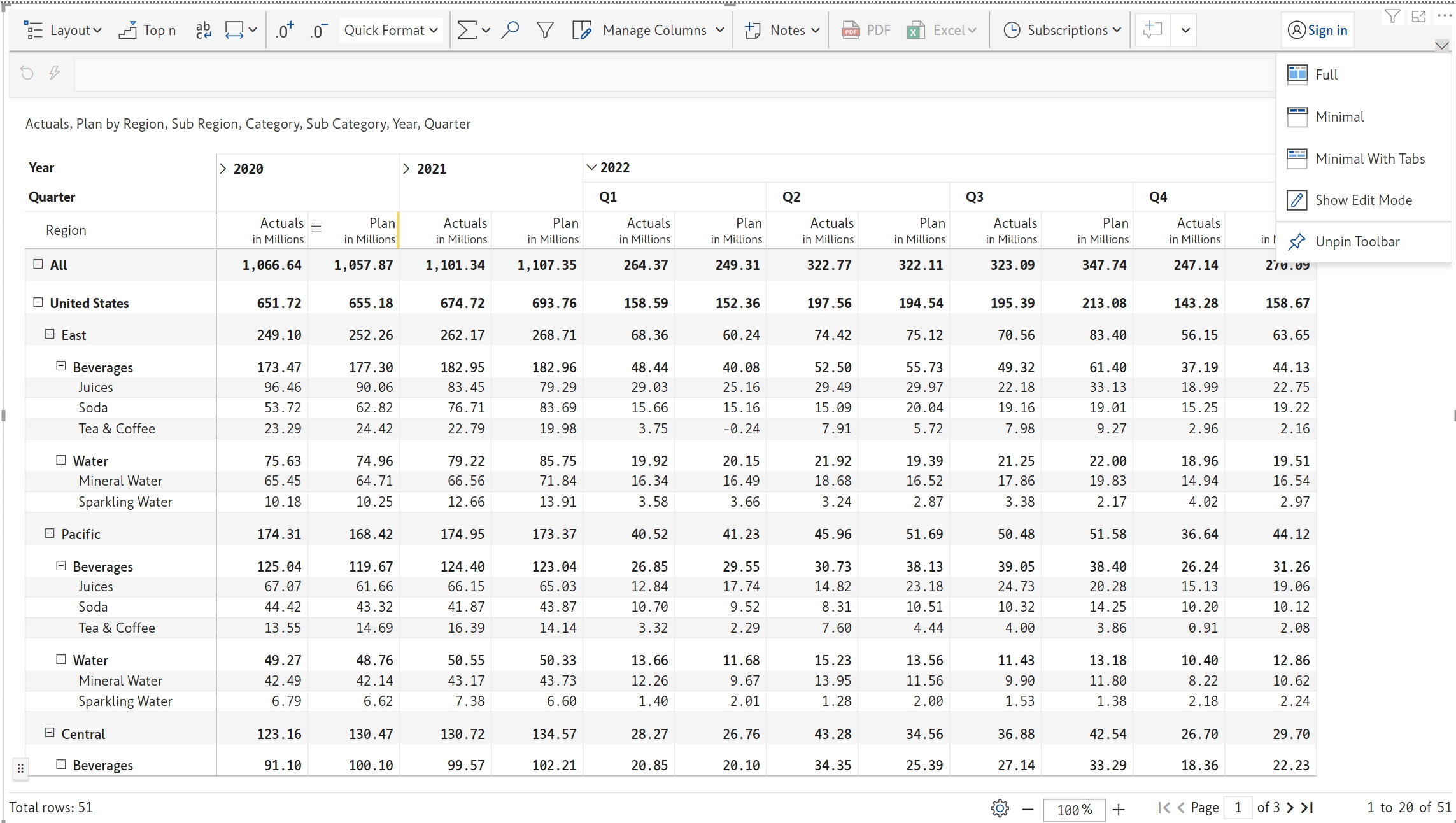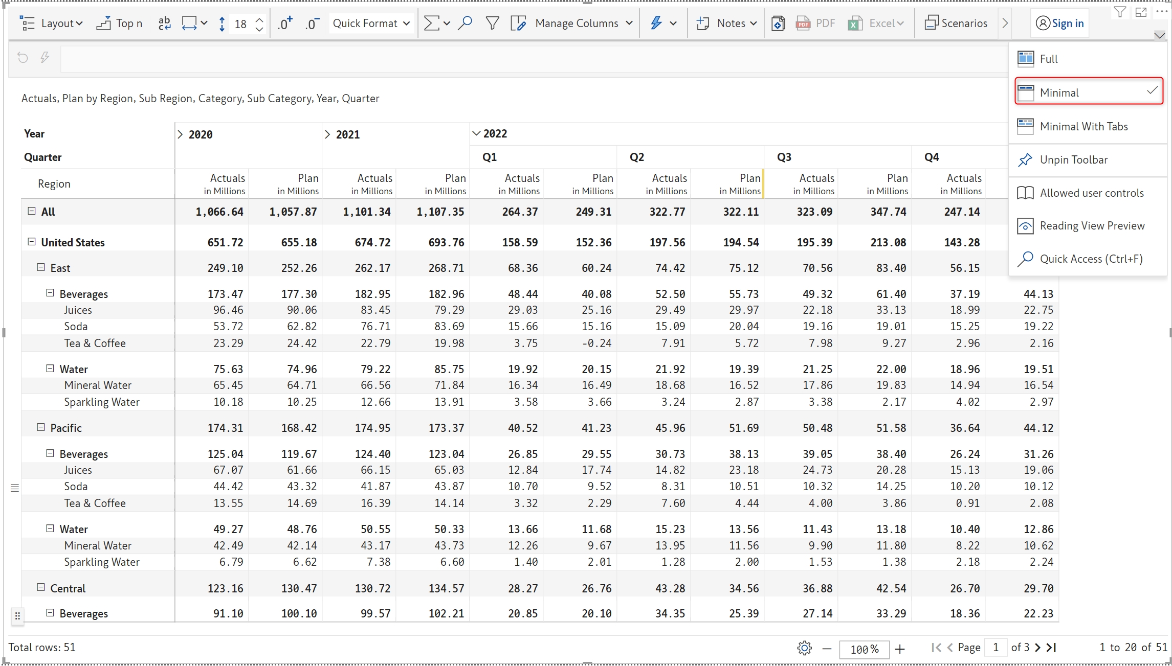 The 'Minimal' option shows the minimal view of the toolbar with options such as Layout, Top N, Auto fit, Row height, Notes, Export and many more as shown in the below image.