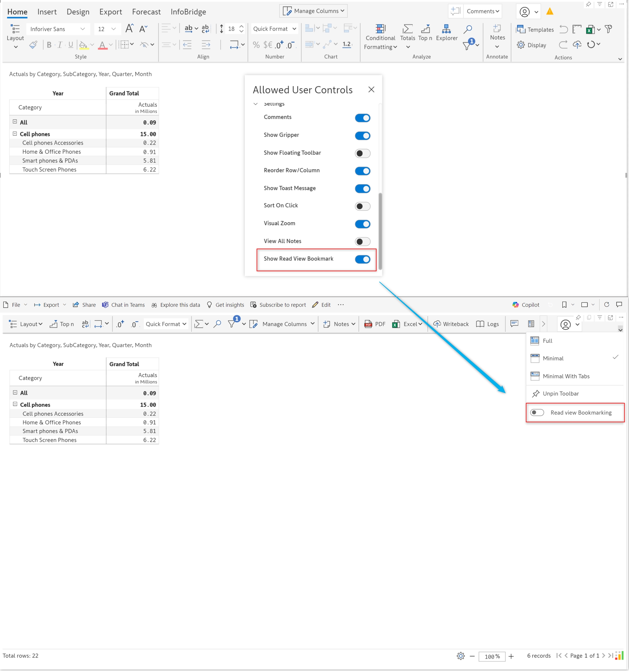 Report viewers may apply formatting/Inforiver filters for data analysis and save their changes using the Power BI bookmarking feature. When the Show read View Bookmark option is enabled in Allowed user controls, in reading view, you will notice a Read view bookmarking toggle.