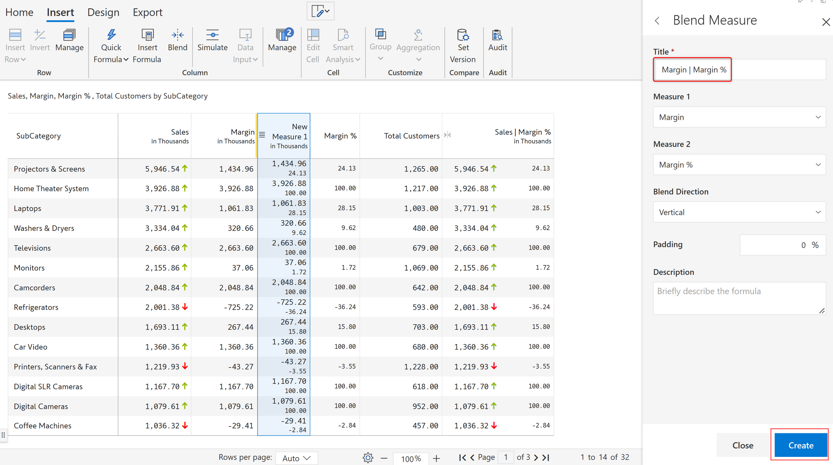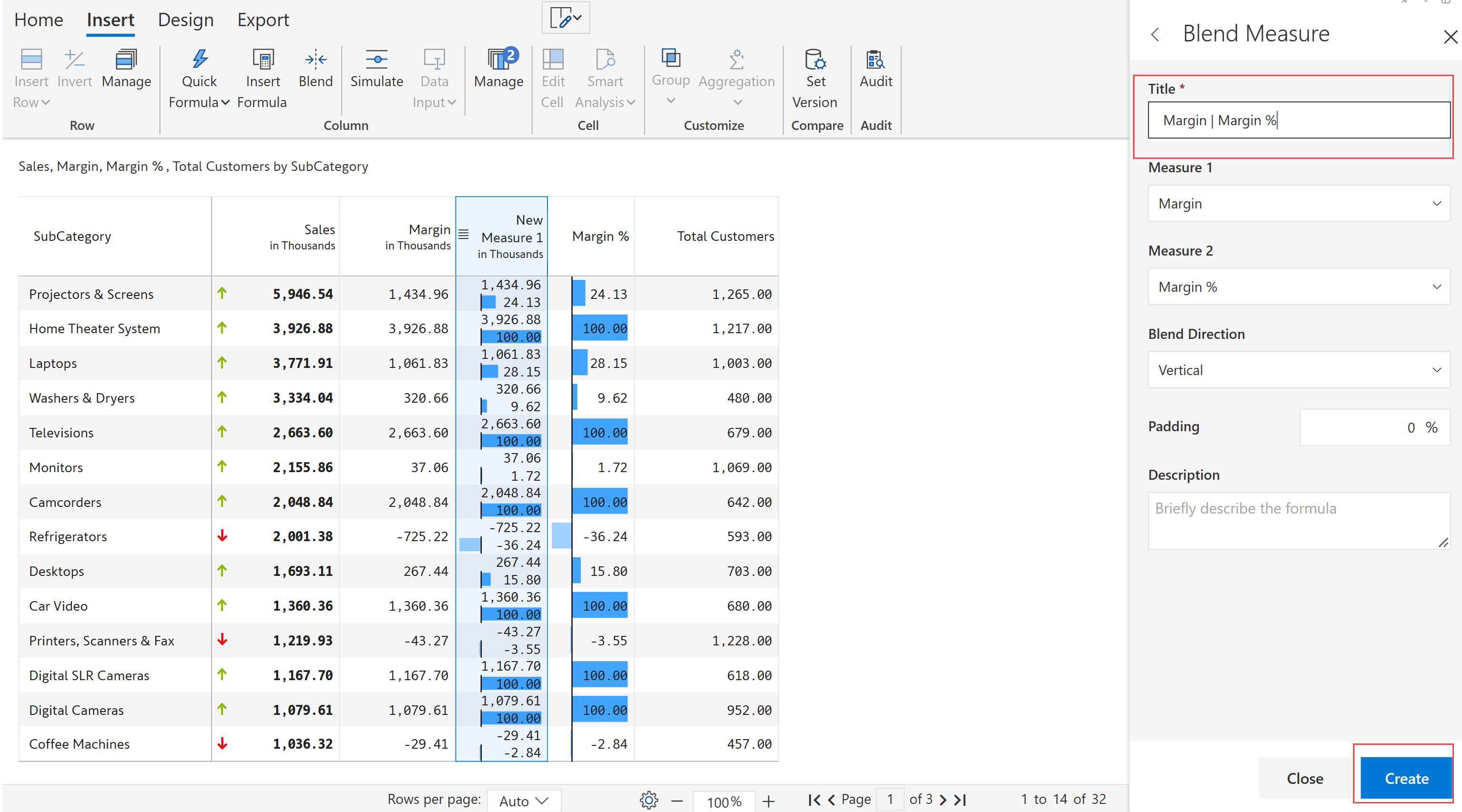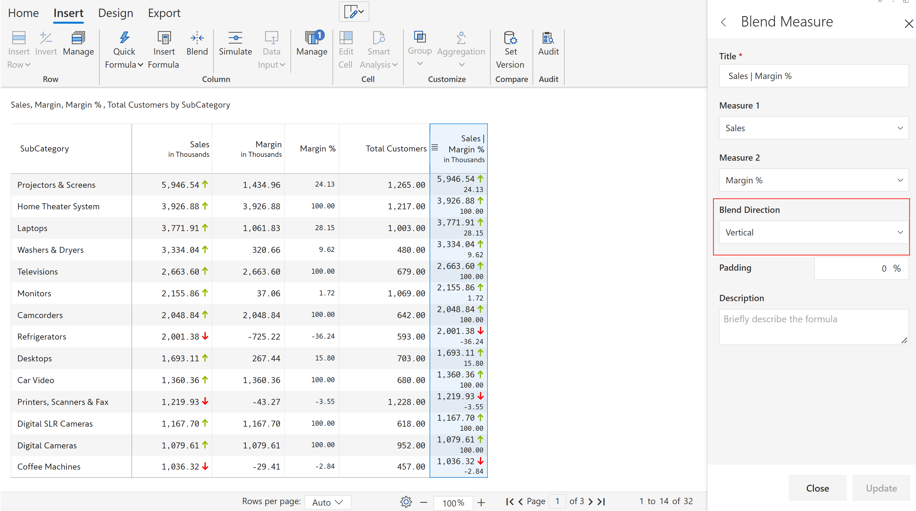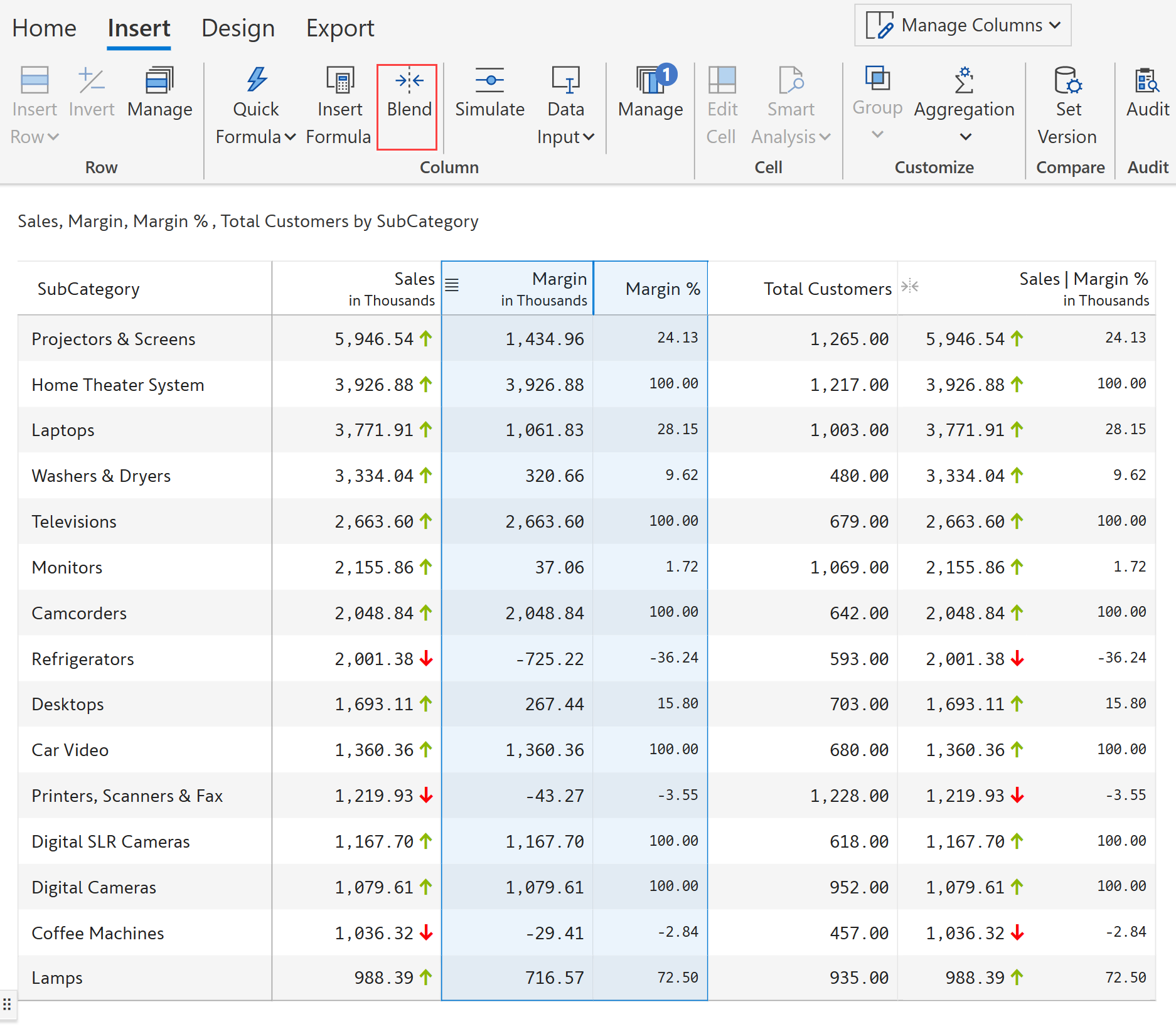Another way to blend the columns is by selecting the columns to be combined and clicking the **Blend** option from the Insert tab. For example, let's blend the Margin and Margin% columns into a single column.&#x20;