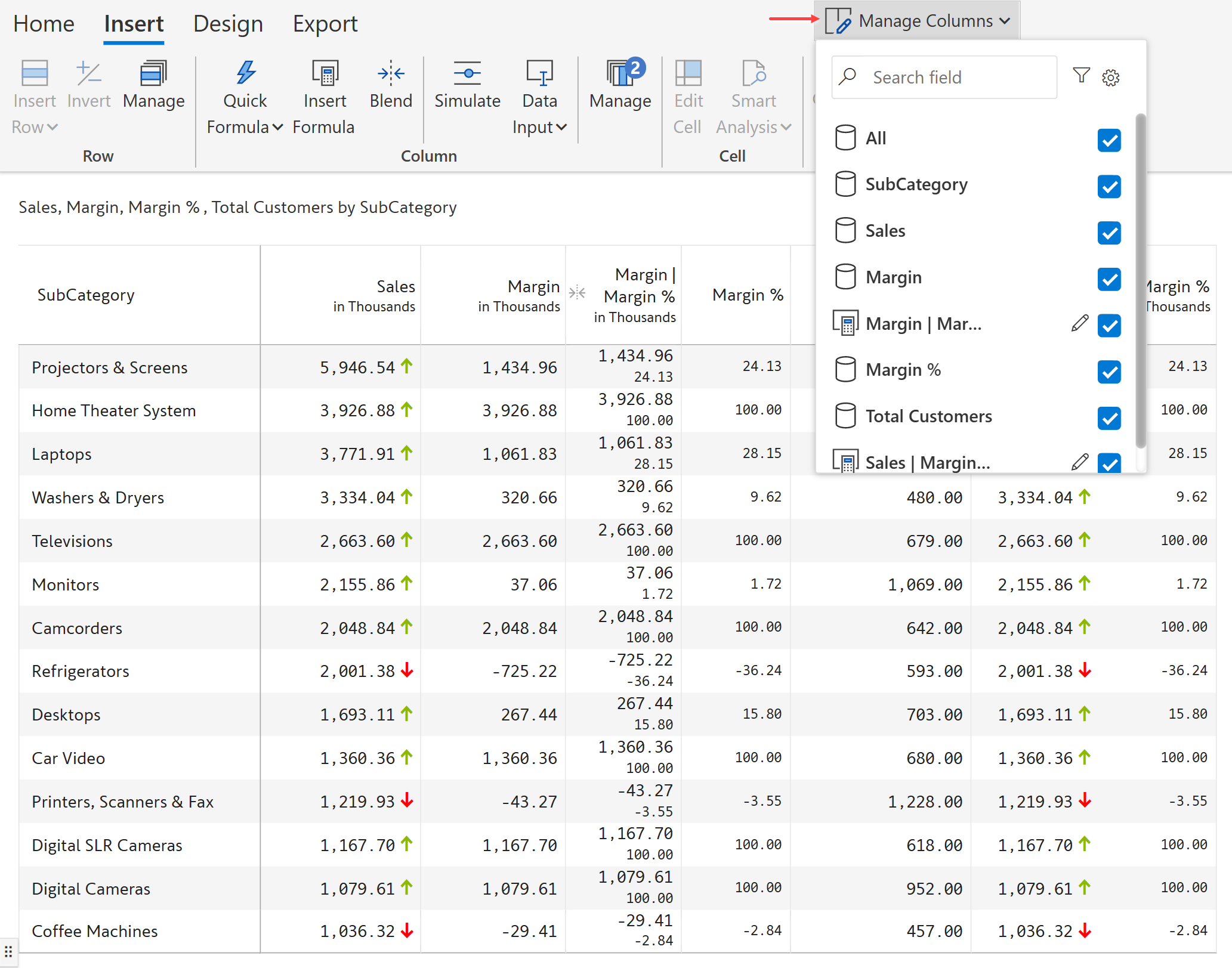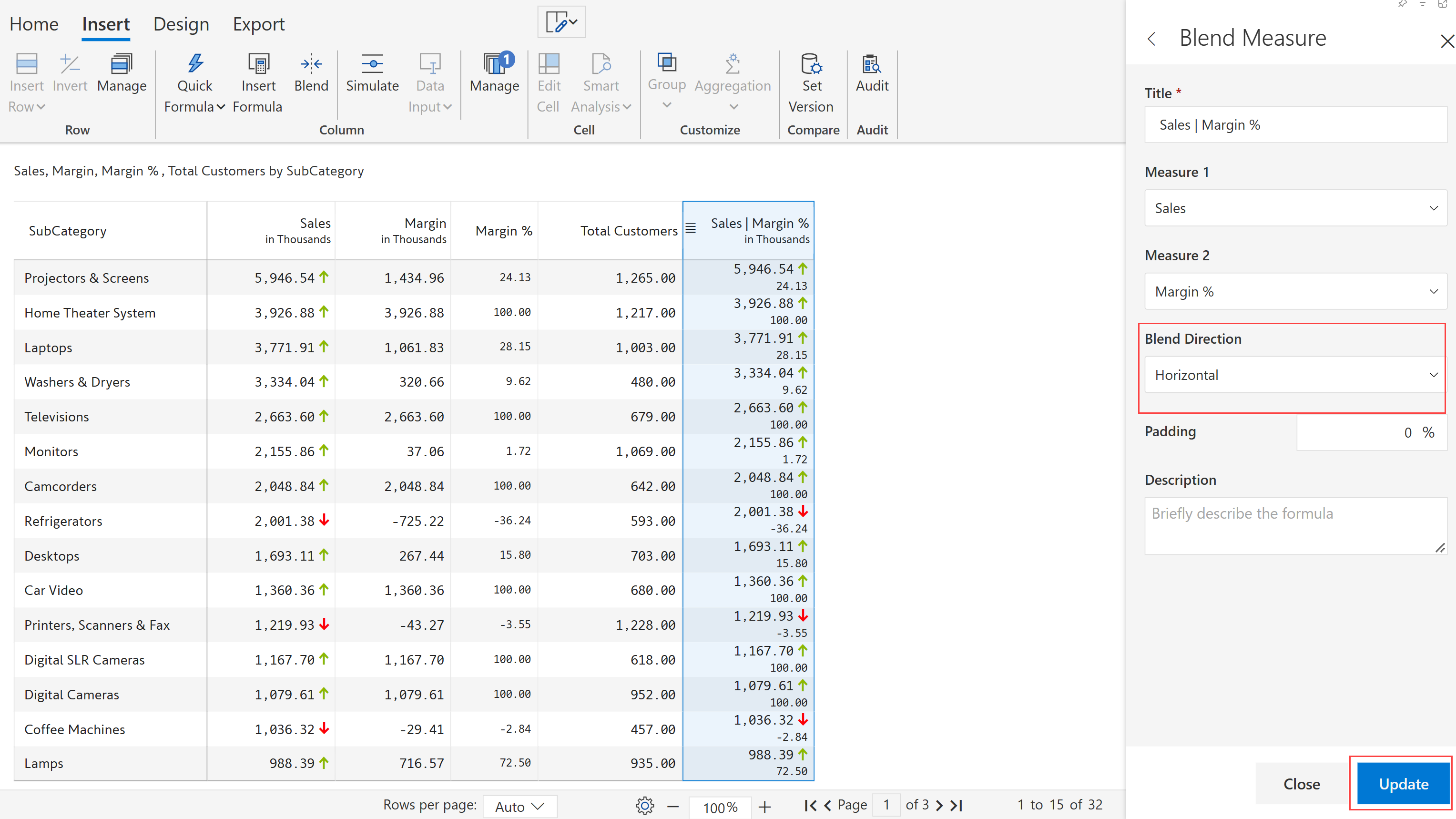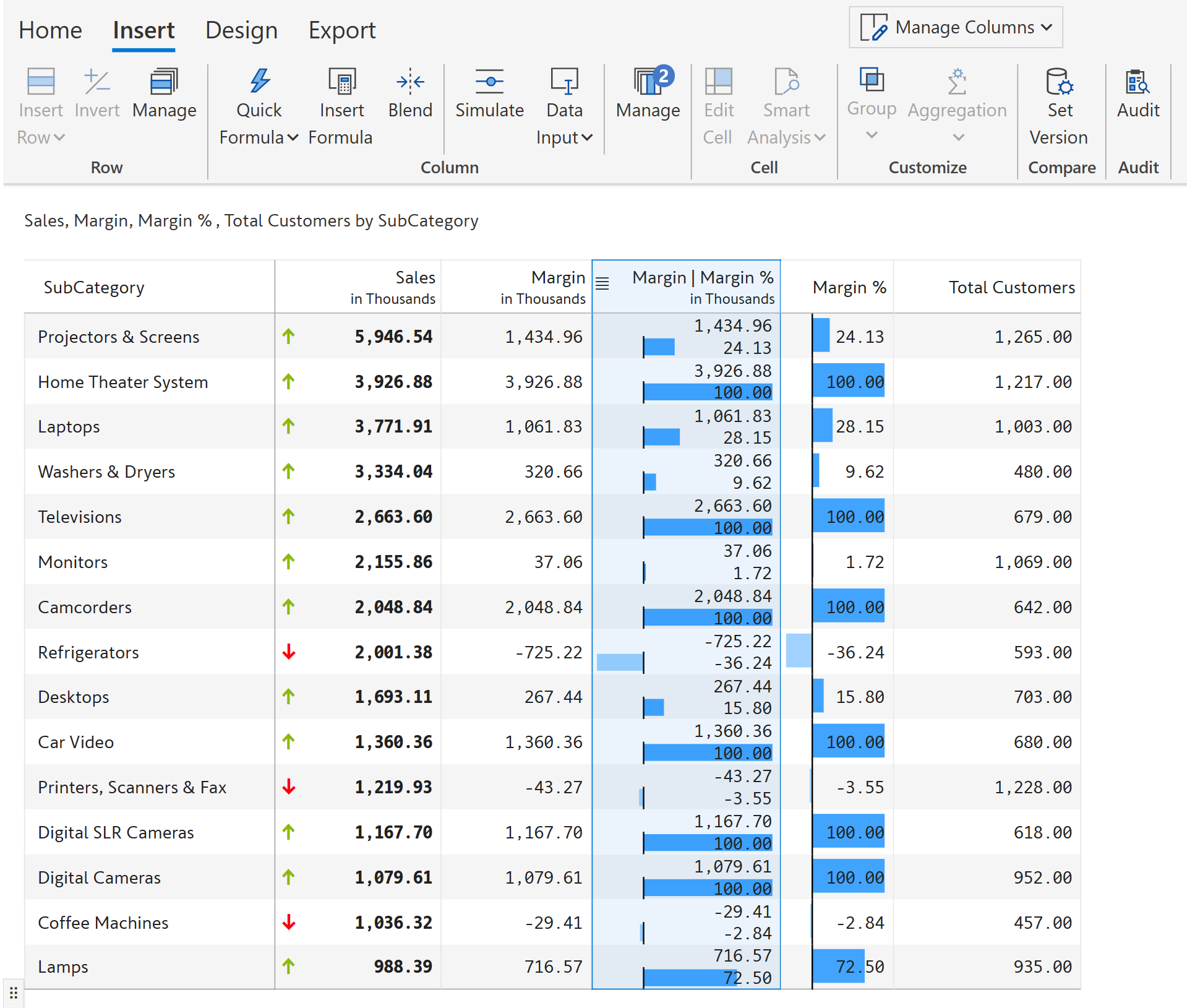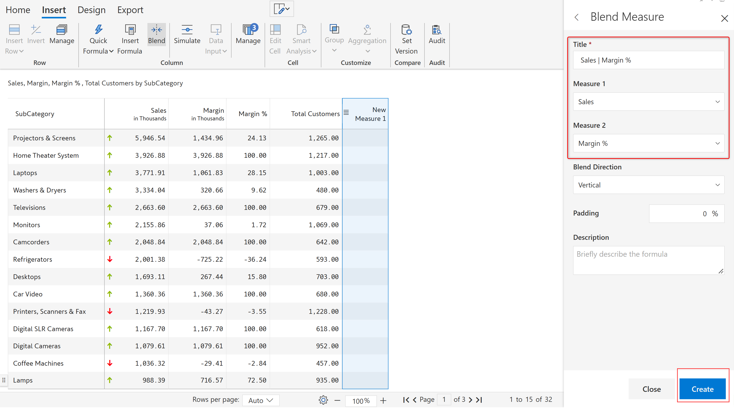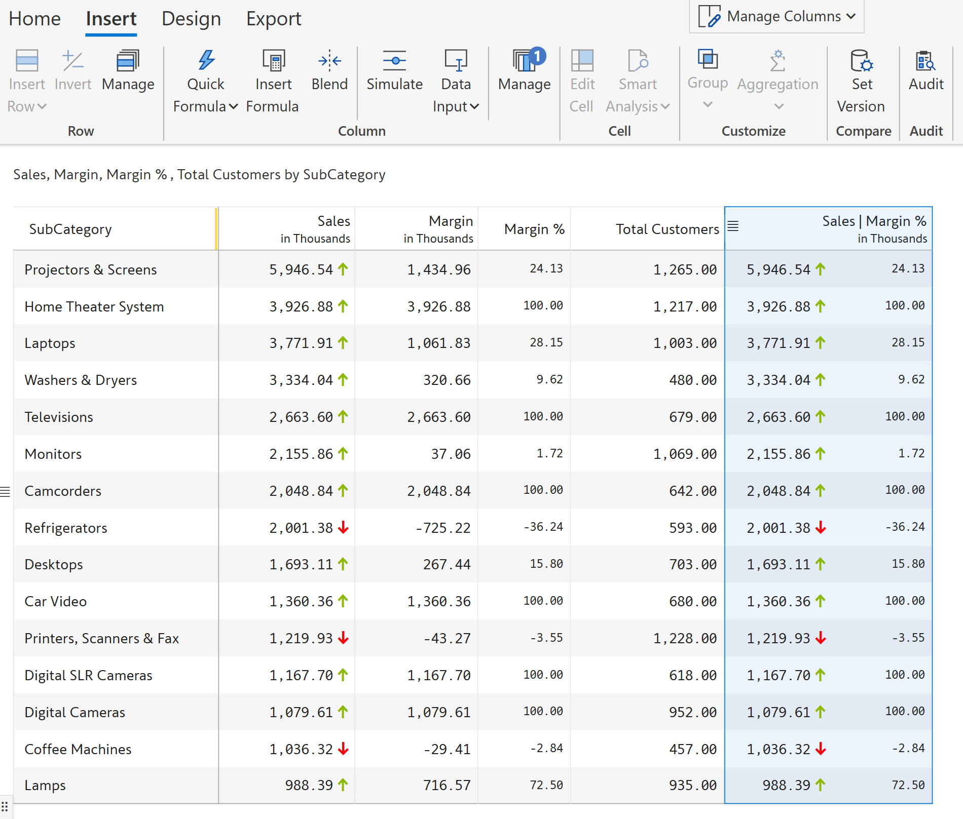 Another way to blend the columns is by selecting the columns to be combined and clicking the **Blend** option from the Insert tab. For example, let's blend the Margin and Margin% columns into a single column.&#x20;