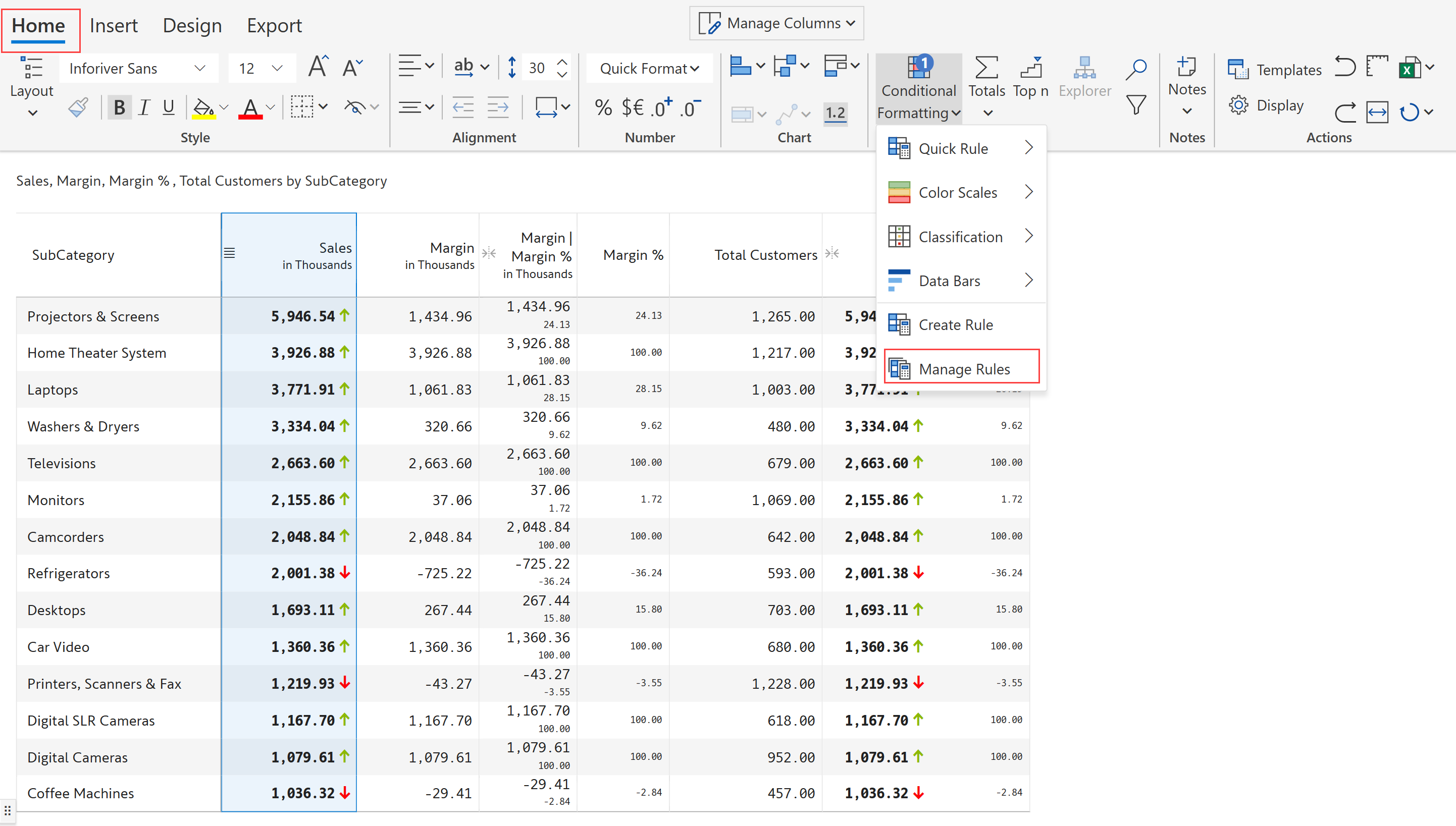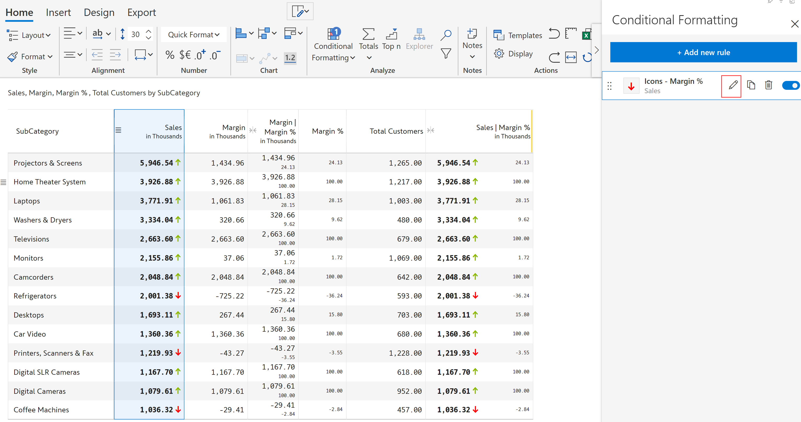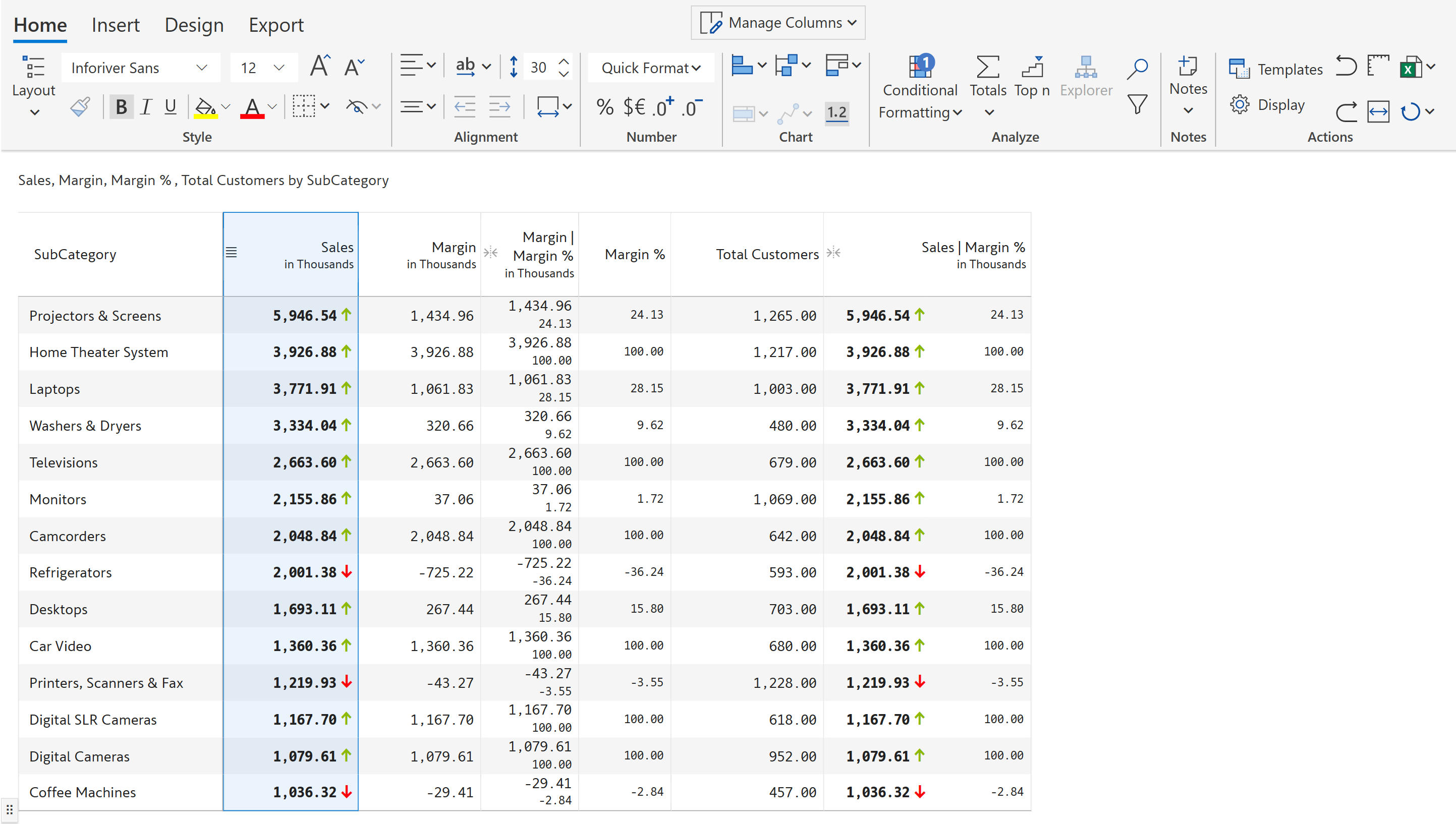 **STEP 1:** Let's change the font style to bold for the **Sales** column. You can see that the same style has been copied to the Sales values of the merged column (Sales| Margin %).