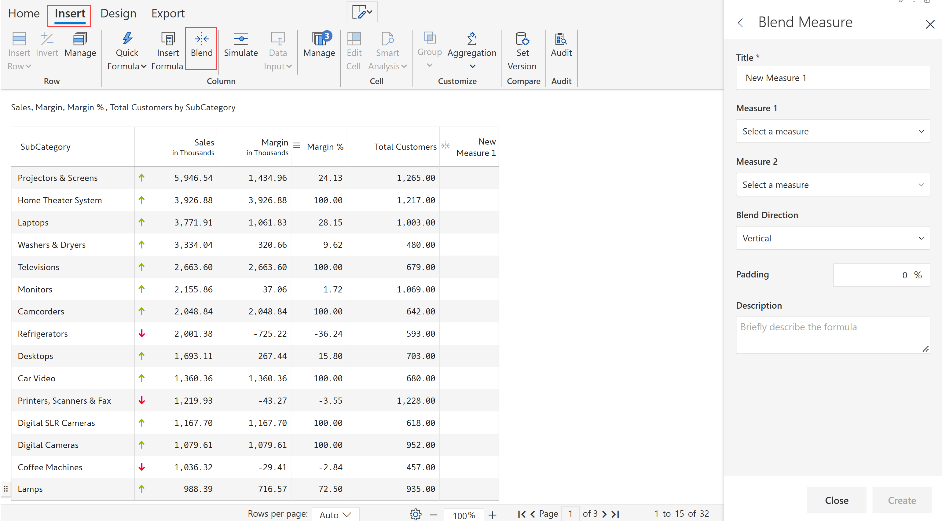 **STEP 1:** In the **Insert tab**, click on the **Blend option** in the **Column** section. A blank measure gets inserted, and the **Blend measure** side panel opens.&#x20;
