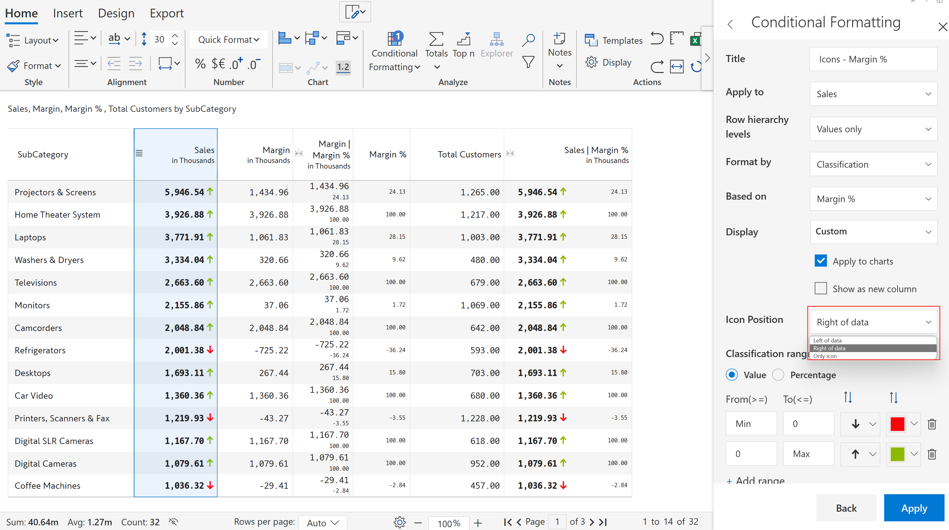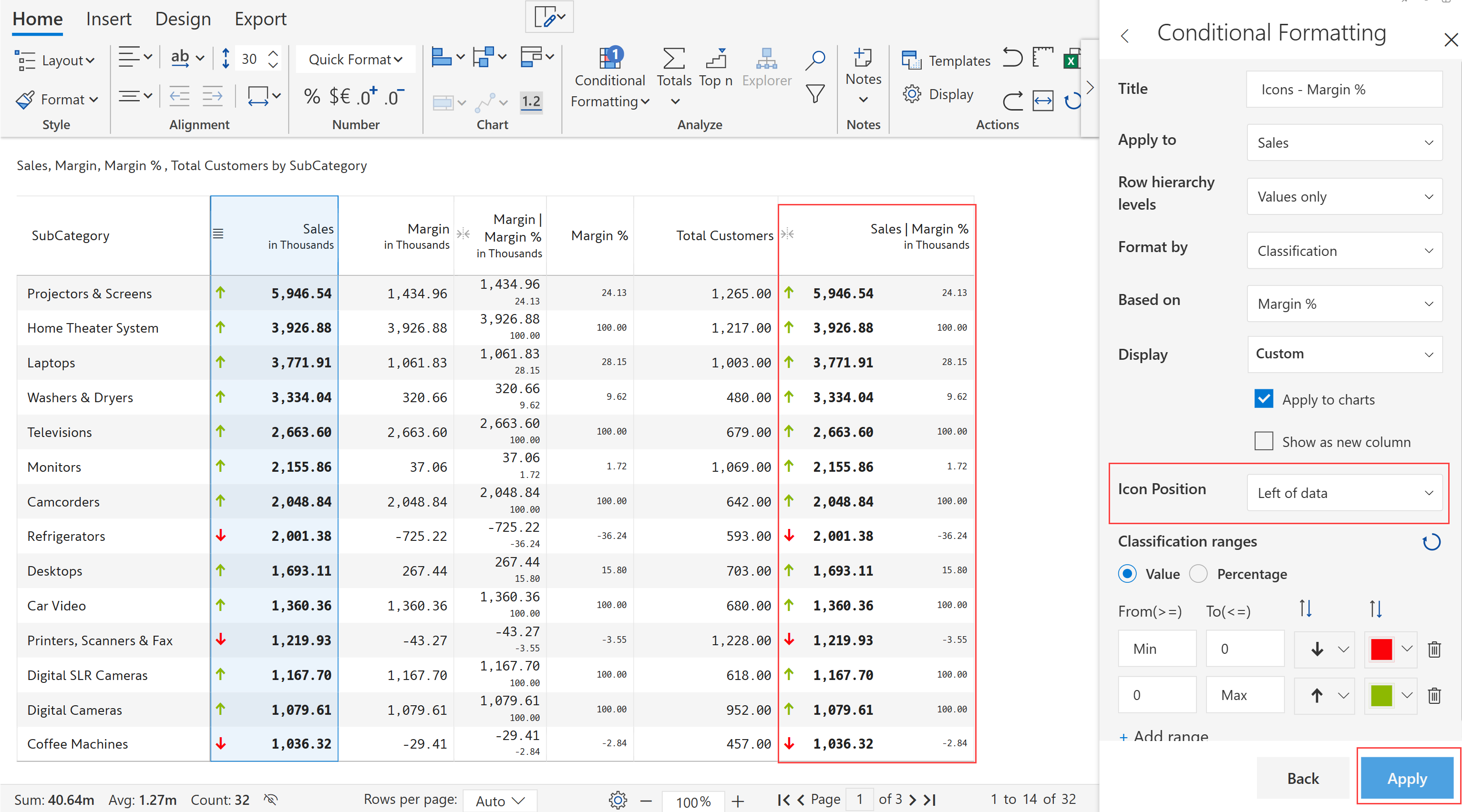 **STEP 4:** When you change the icon position from **Right of data** to **Left of data** and select **Apply**, you can see that the icons in both columns shift over.&#x20;