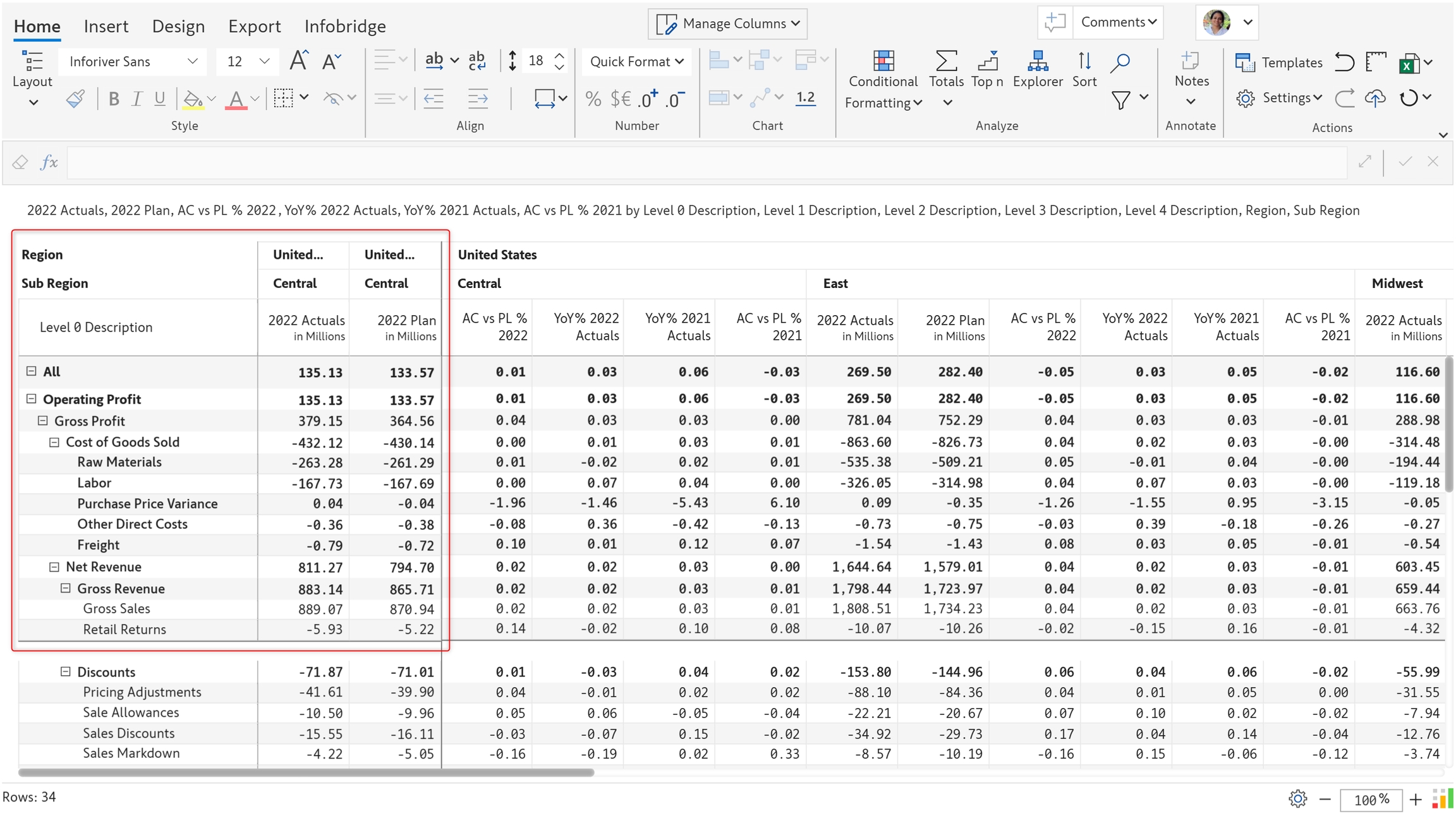 You can freeze both rows and columns. To analyze the Gross Profit and Net Revenue based on US Central metrics, we can freeze the selected rows and columns from the row/column grippers. Learn more about freezing rows.