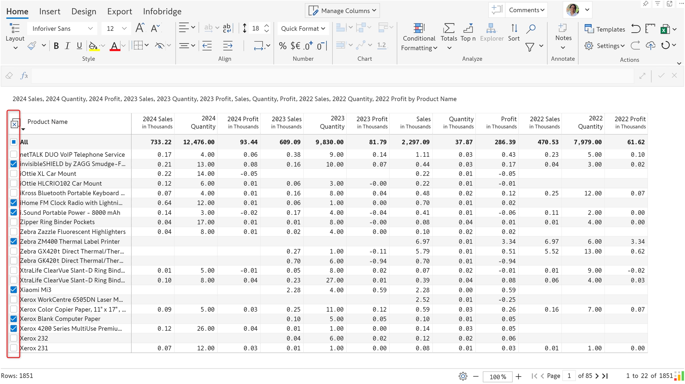 Multi-row selection can now filter the records in another Inforiver Matrix visual. You'll see that the product names in the first visual are automatically filtered when we make category selections in the second visual.