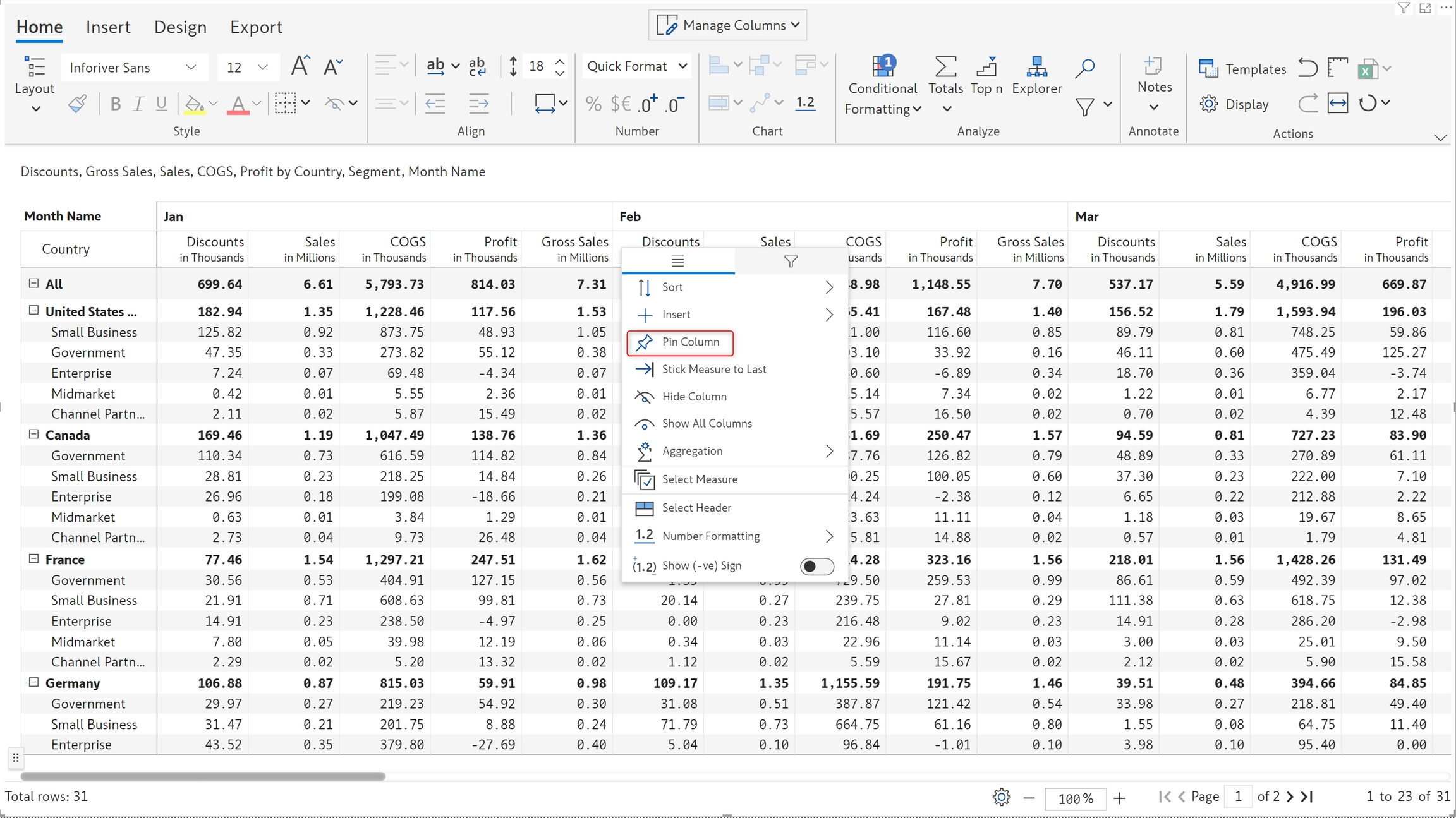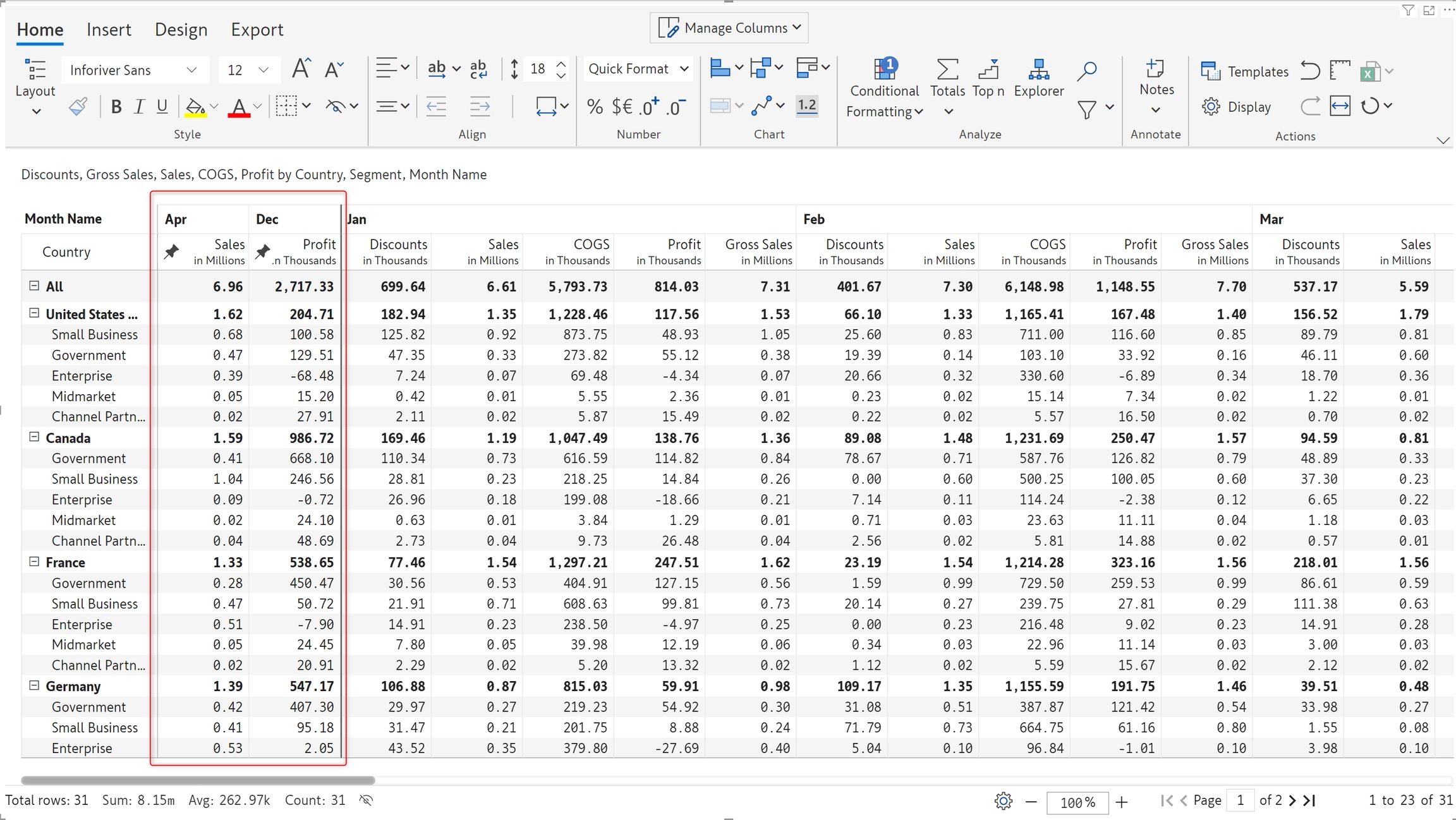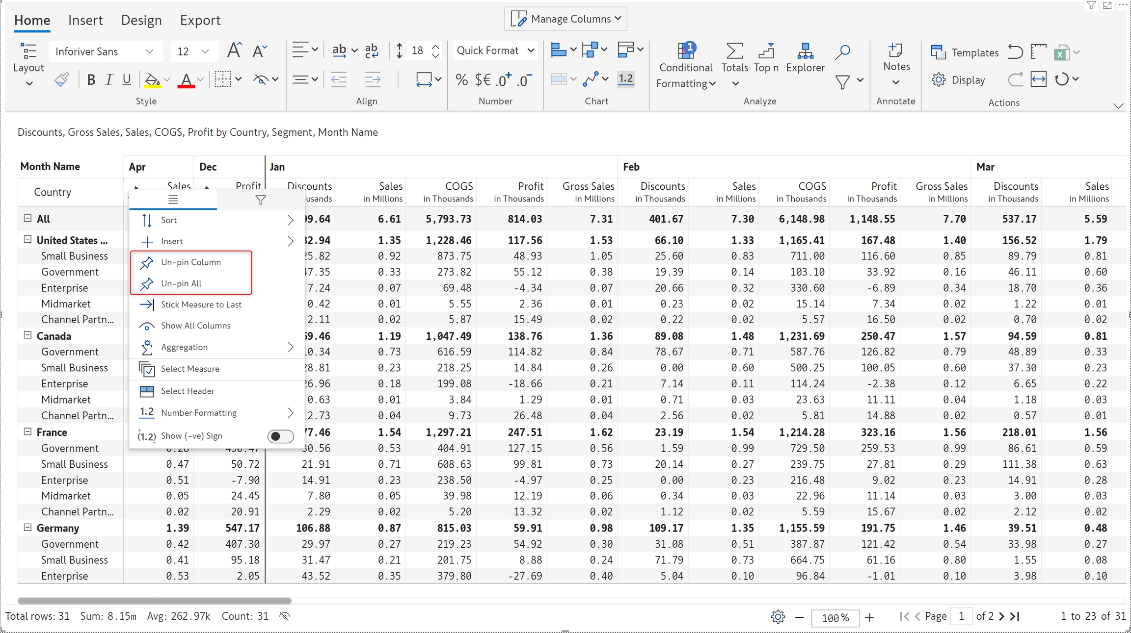 In the example, the Dec>Profits and Apr>Sales have been pinned to the beginning of the report.