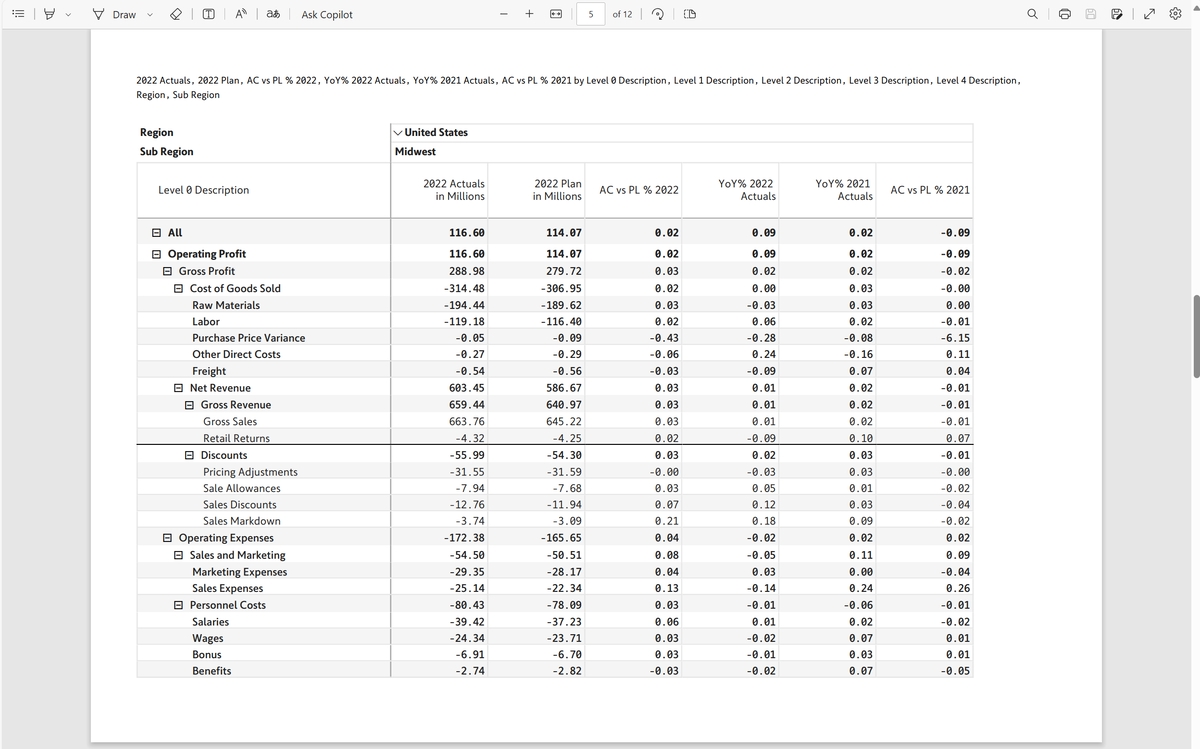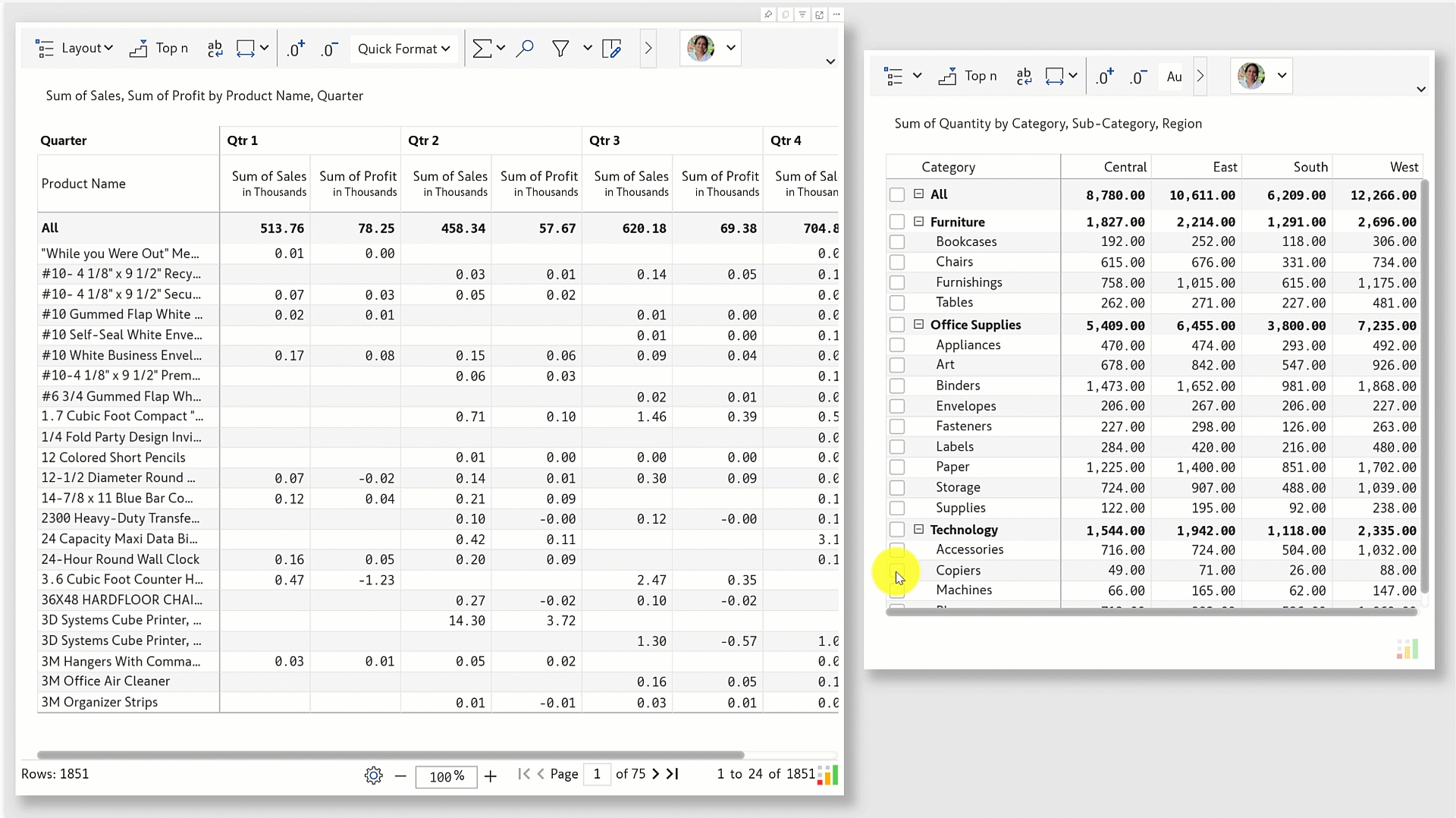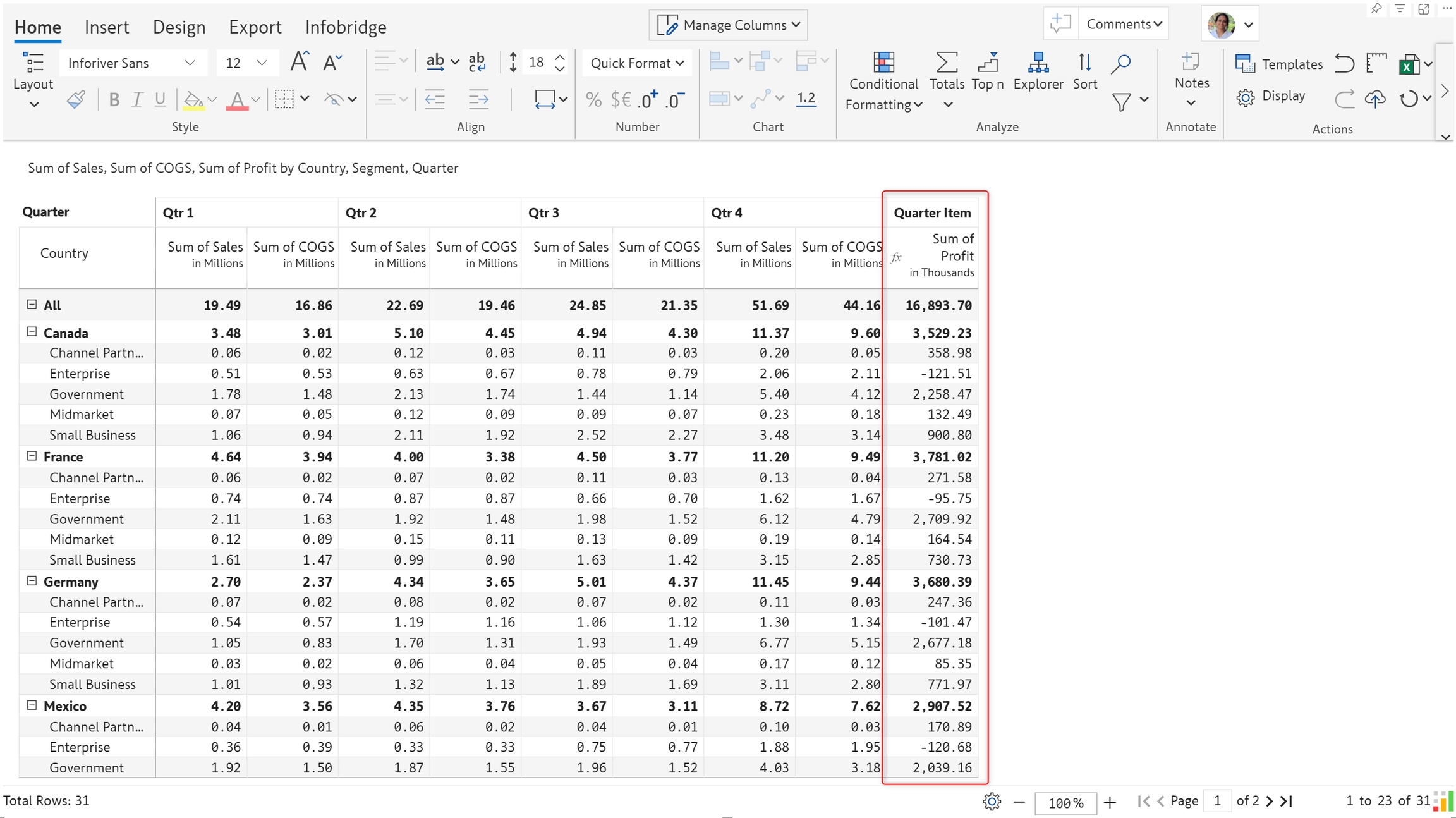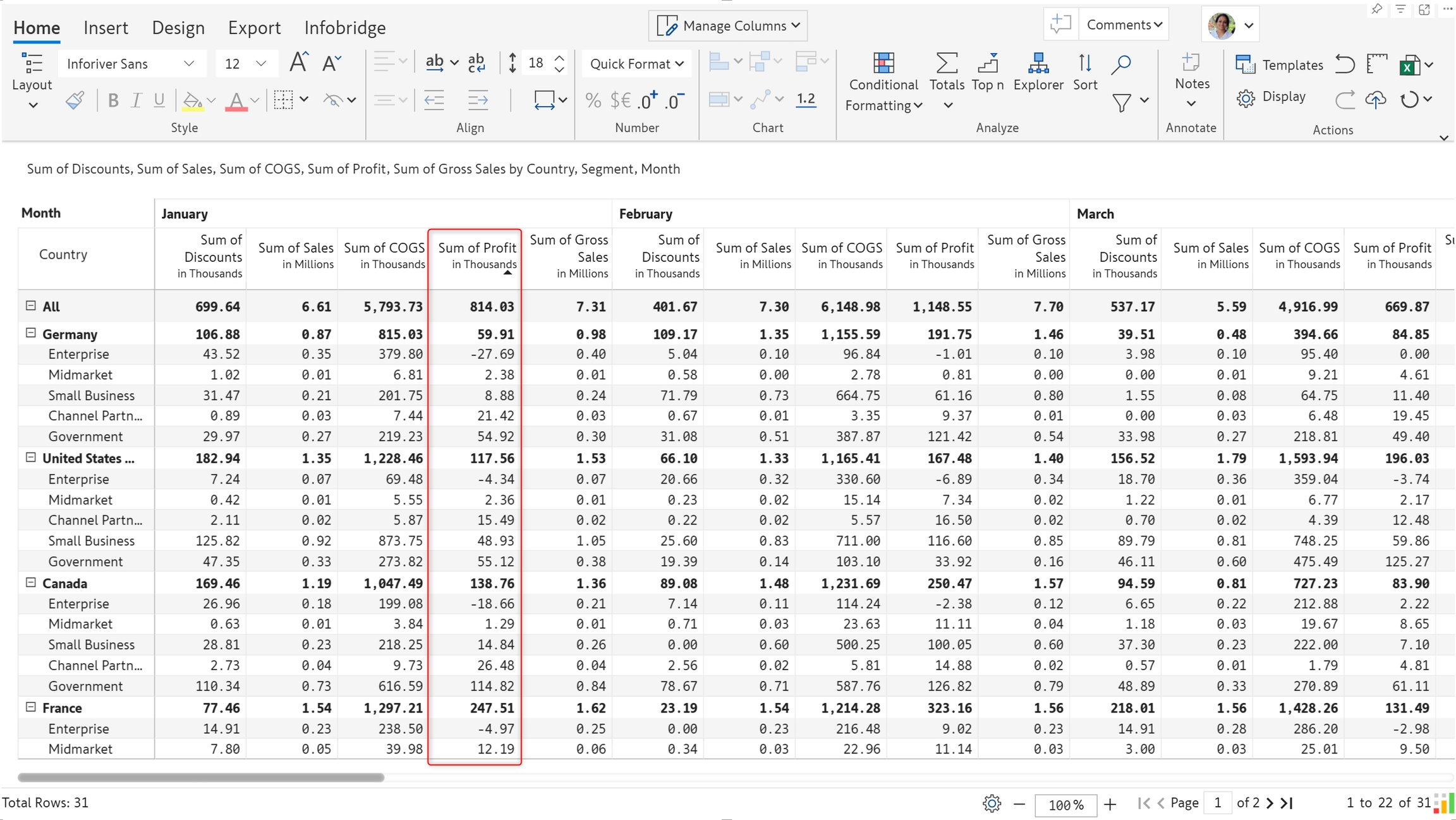 In the example, the Dec>Profits and Apr>Sales have been pinned to the beginning of the report.