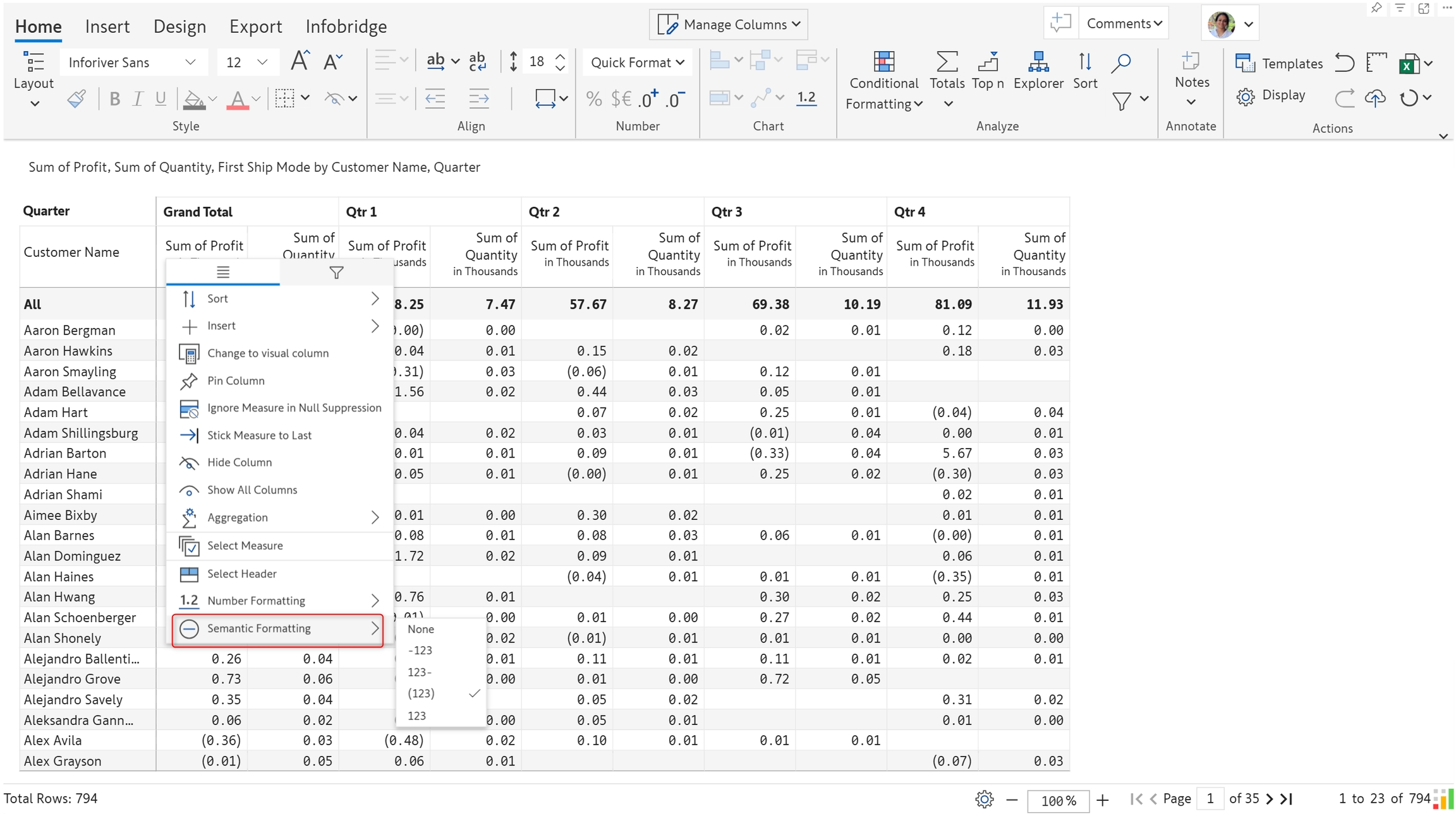 Display negative values in parentheses or choose to place the negative sign after the number with Semantic formatting options.