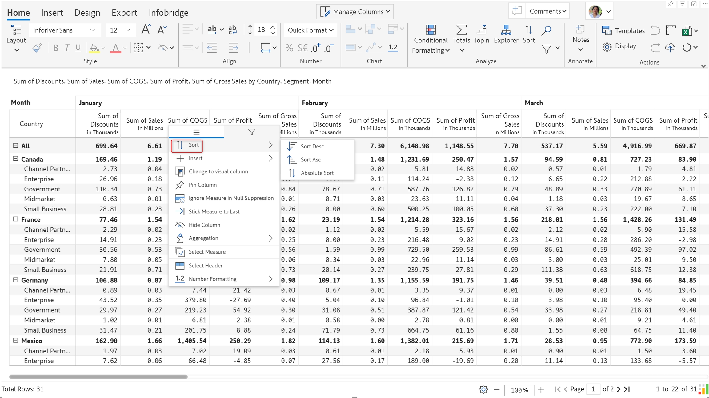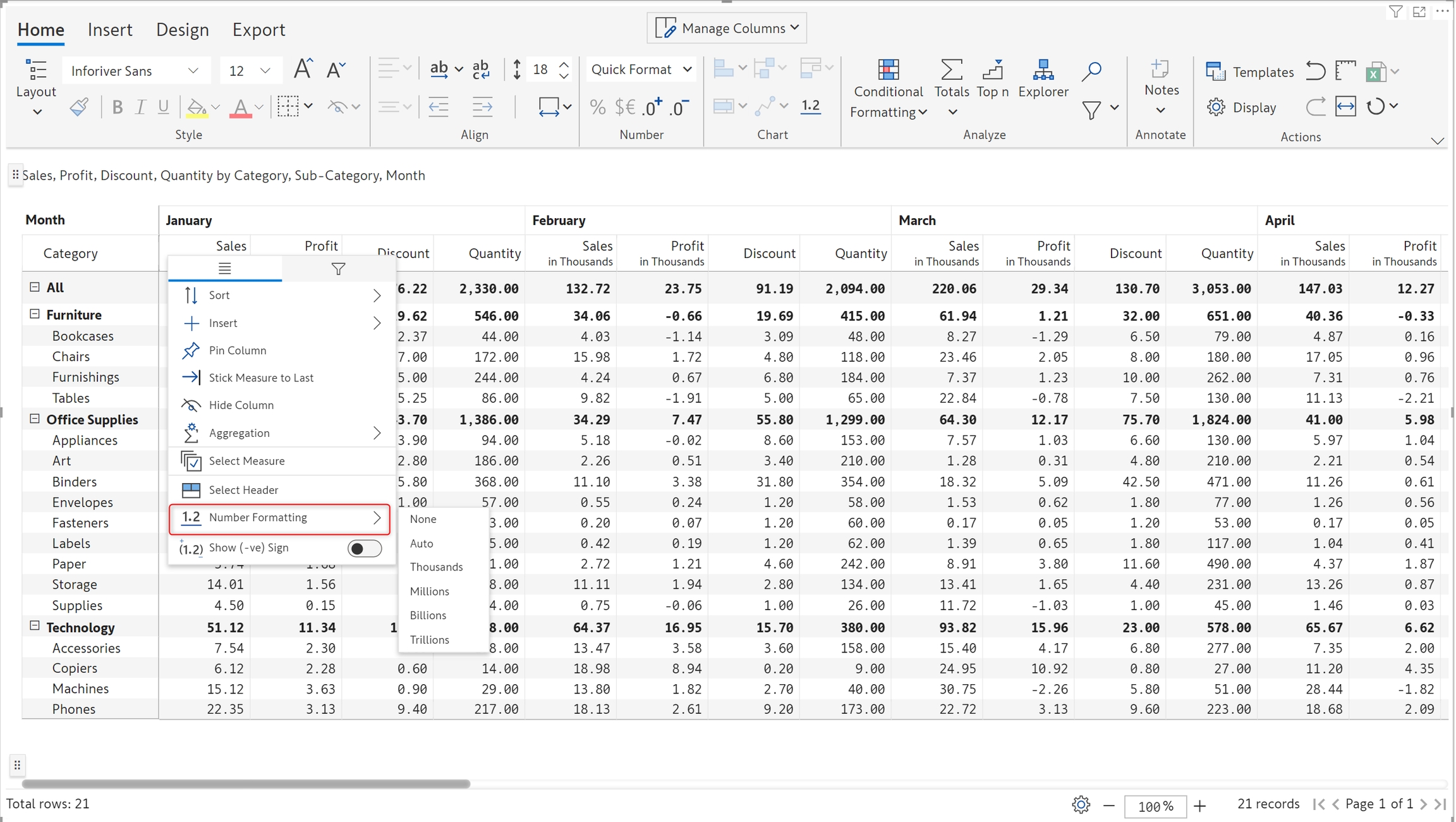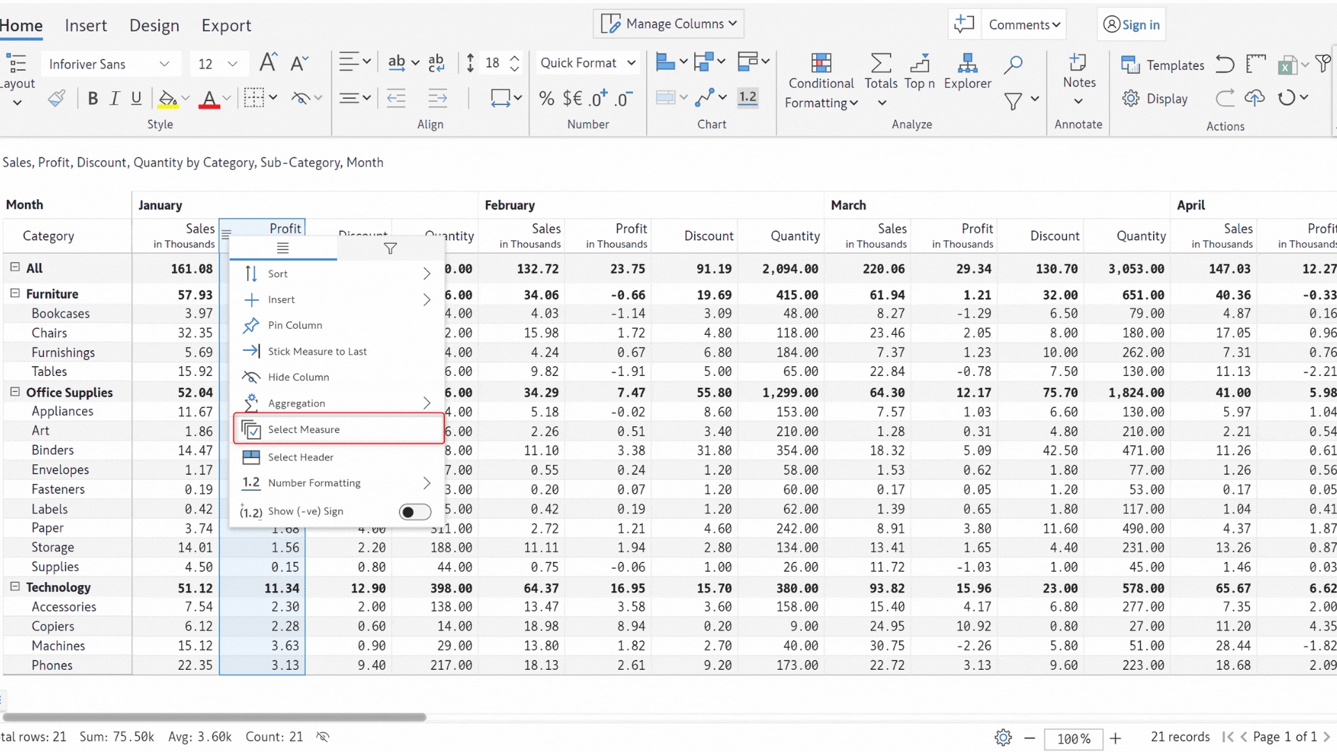 You may need to perform operations such as applying uniform formatting for a measure. Rather than selecting each measure and applying formatting, you can use this option to select a particular measure across the entire report and apply formatting in a single shot. In the animation below, notice how the Discount measure has been selected for all months.