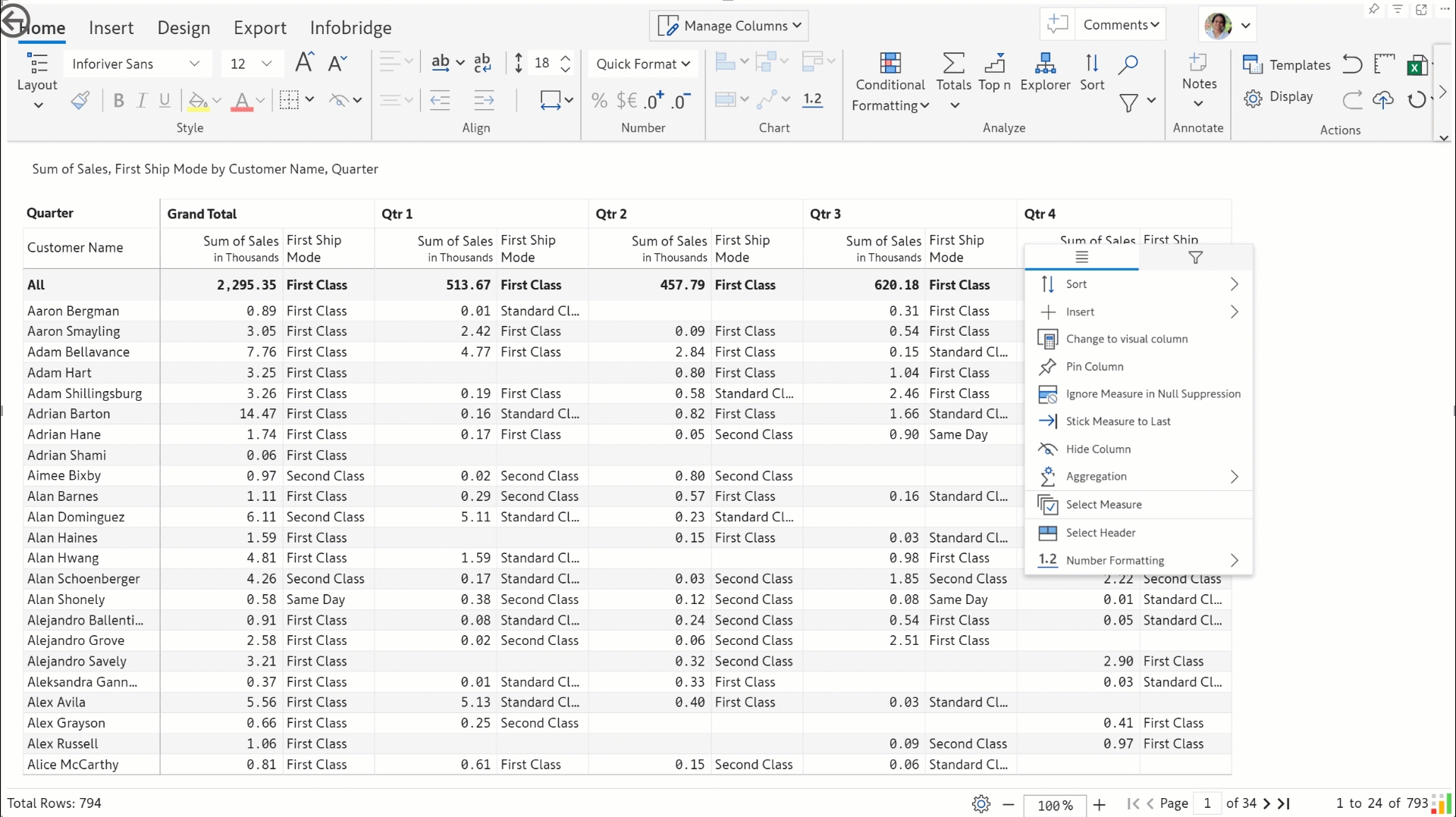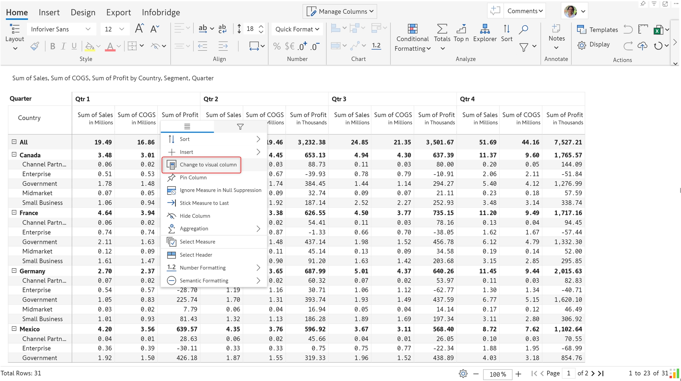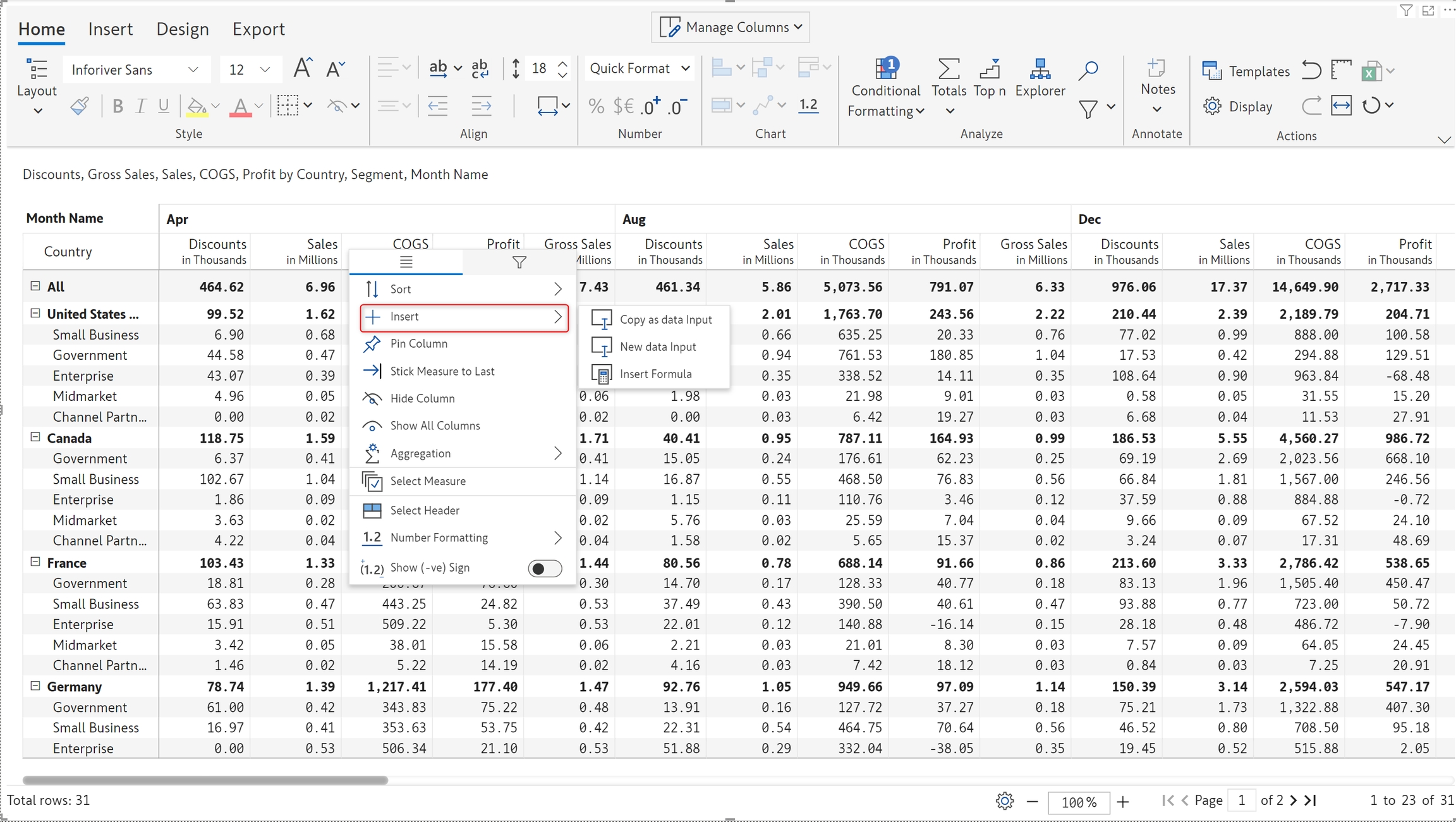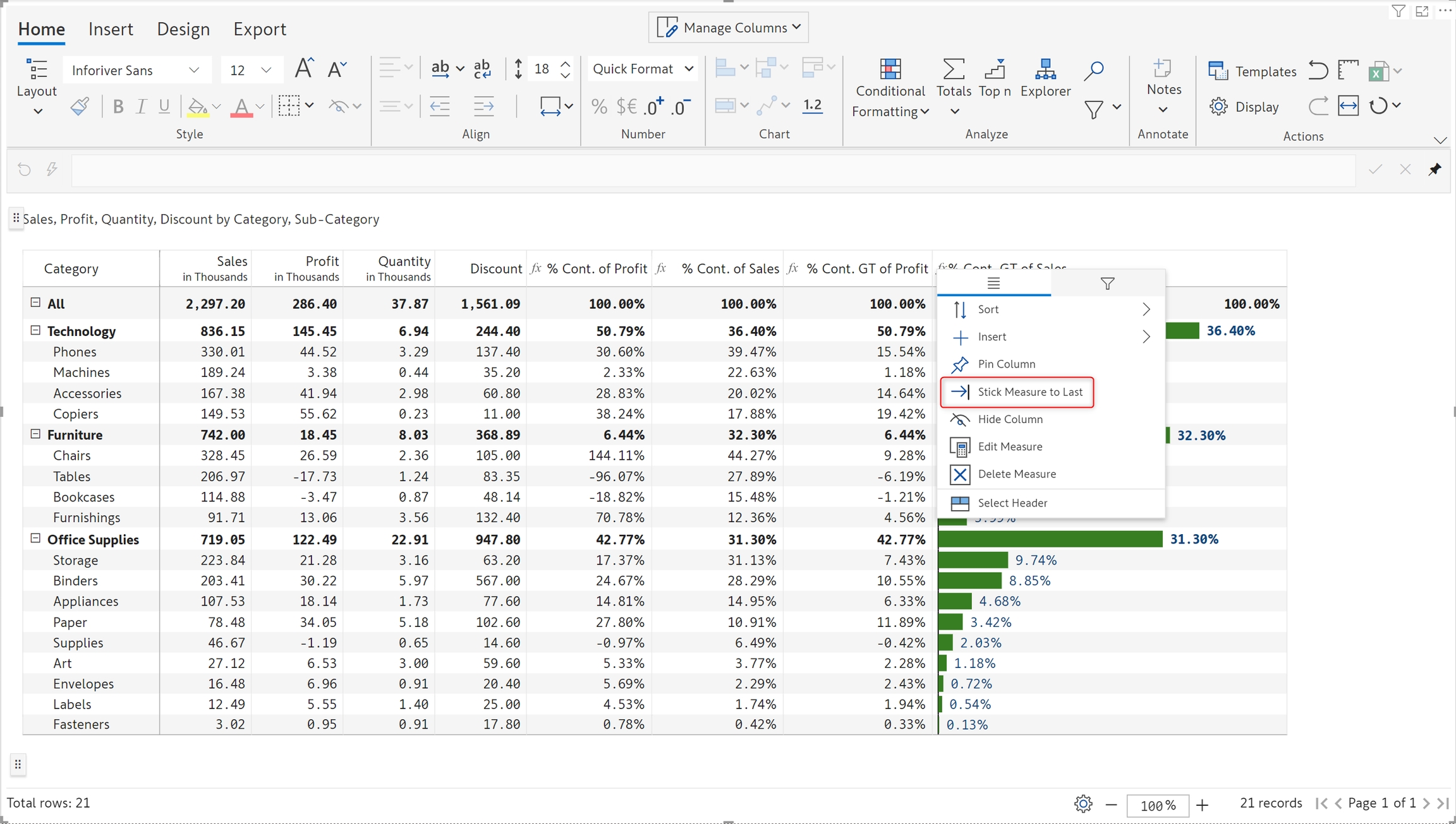 You may need to perform operations such as applying uniform formatting for a measure. Rather than selecting each measure and applying formatting, you can use this option to select a particular measure across the entire report and apply formatting in a single shot. In the animation below, notice how the Discount measure has been selected for all months.