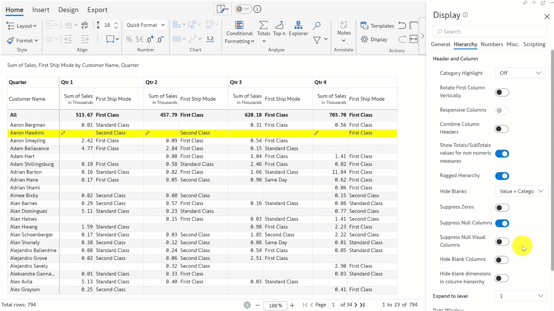 Notice the row highlighted in the report below; all Sales values are null. You can suppress these rows with the Ignore Measure in Null Suppression option.
