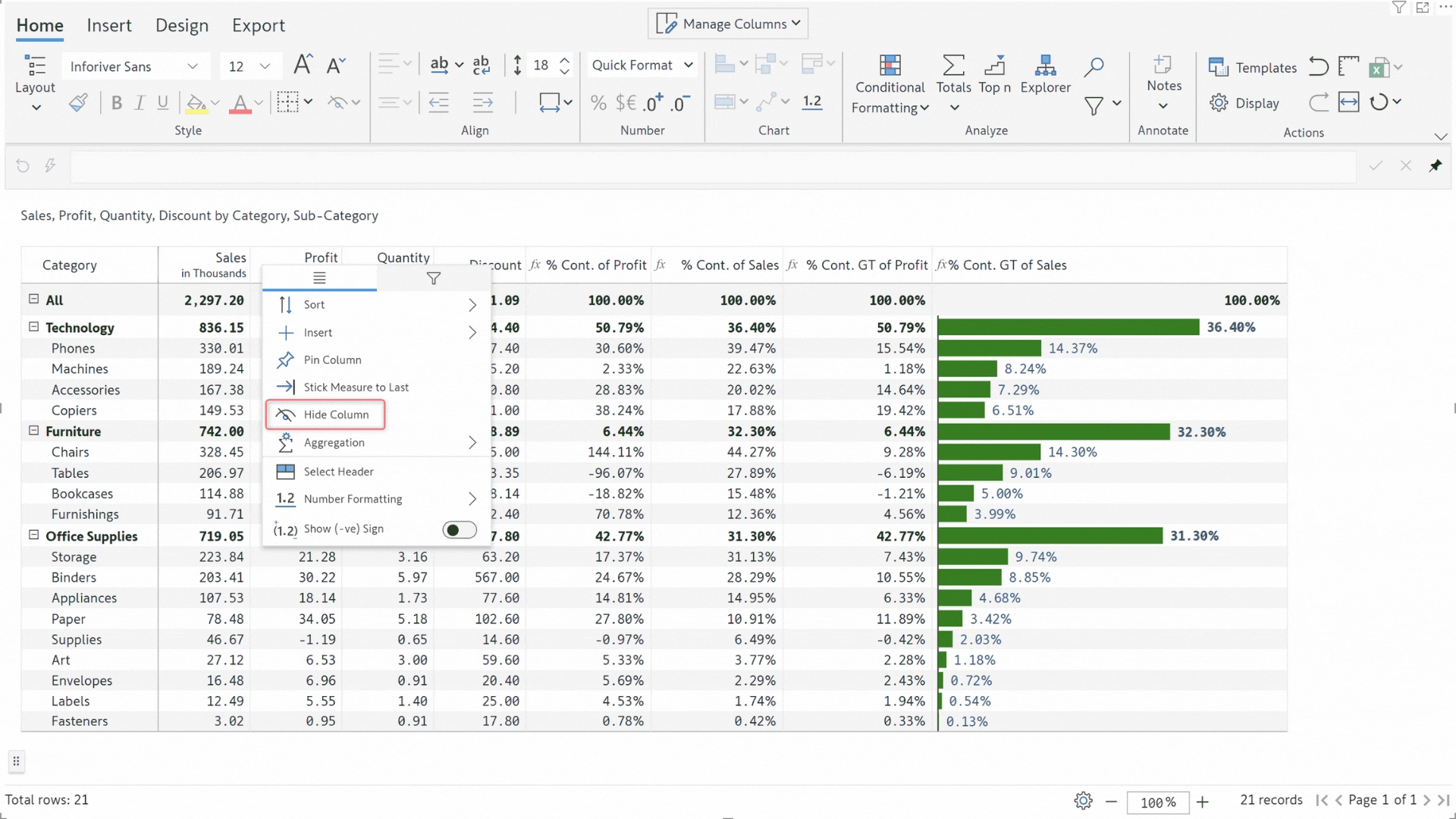 You can use the Hide Column option to mask a particular column in your report. In the animation below, notice how the Profit measure has been hidden in the report.