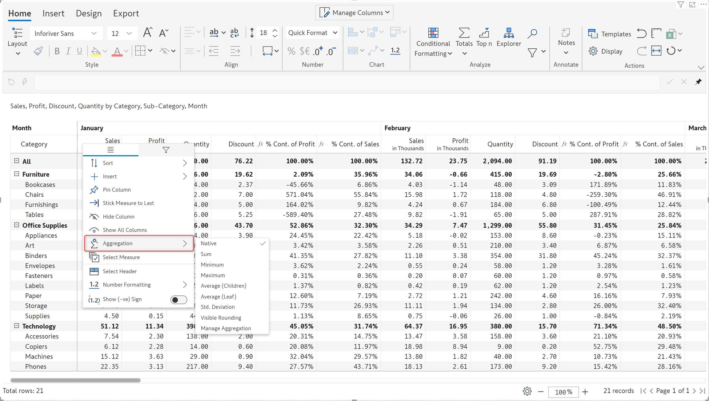 Using this option, you can directly set the aggregation method used to calculate the totals and subtotals for a particular column. Learn more about managing aggregation.