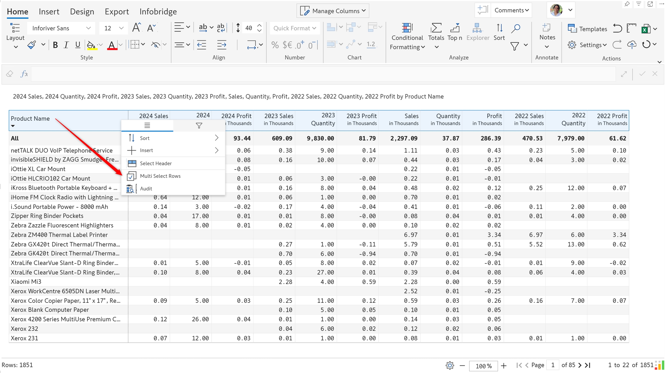 This option enables checkboxes to quickly select multiple rows. Click on the column gripper for the row dimension header to access the Multi Select Rows option.