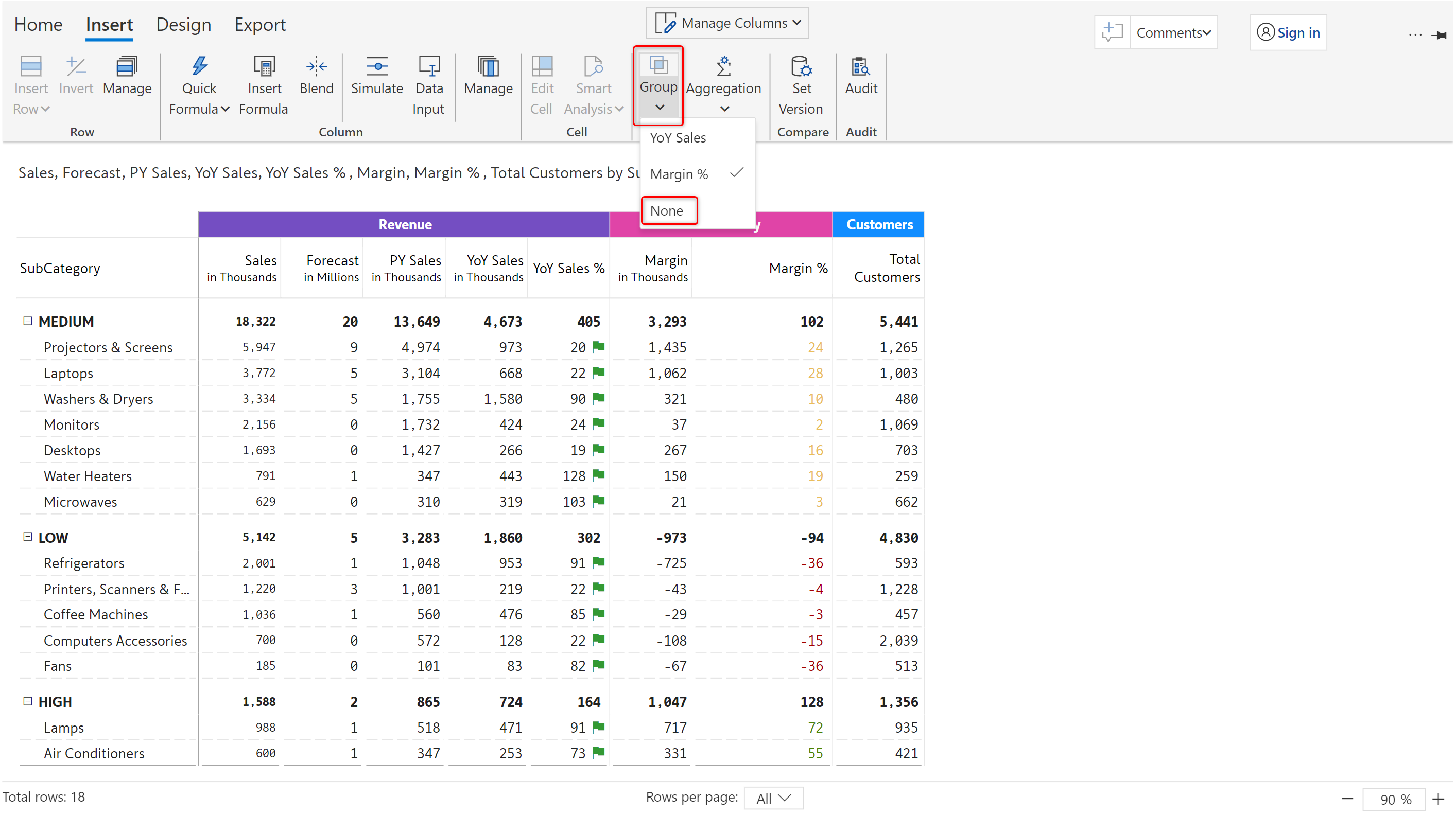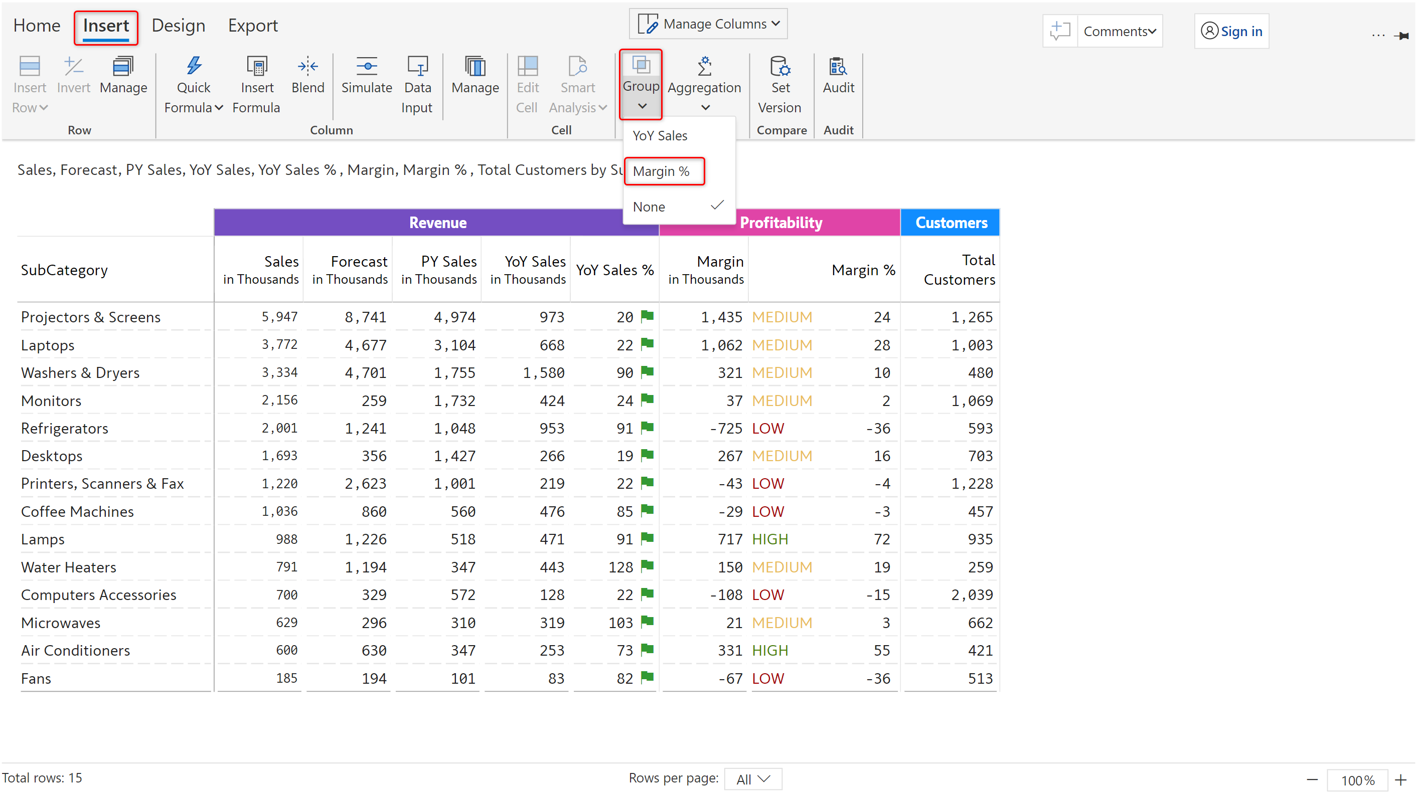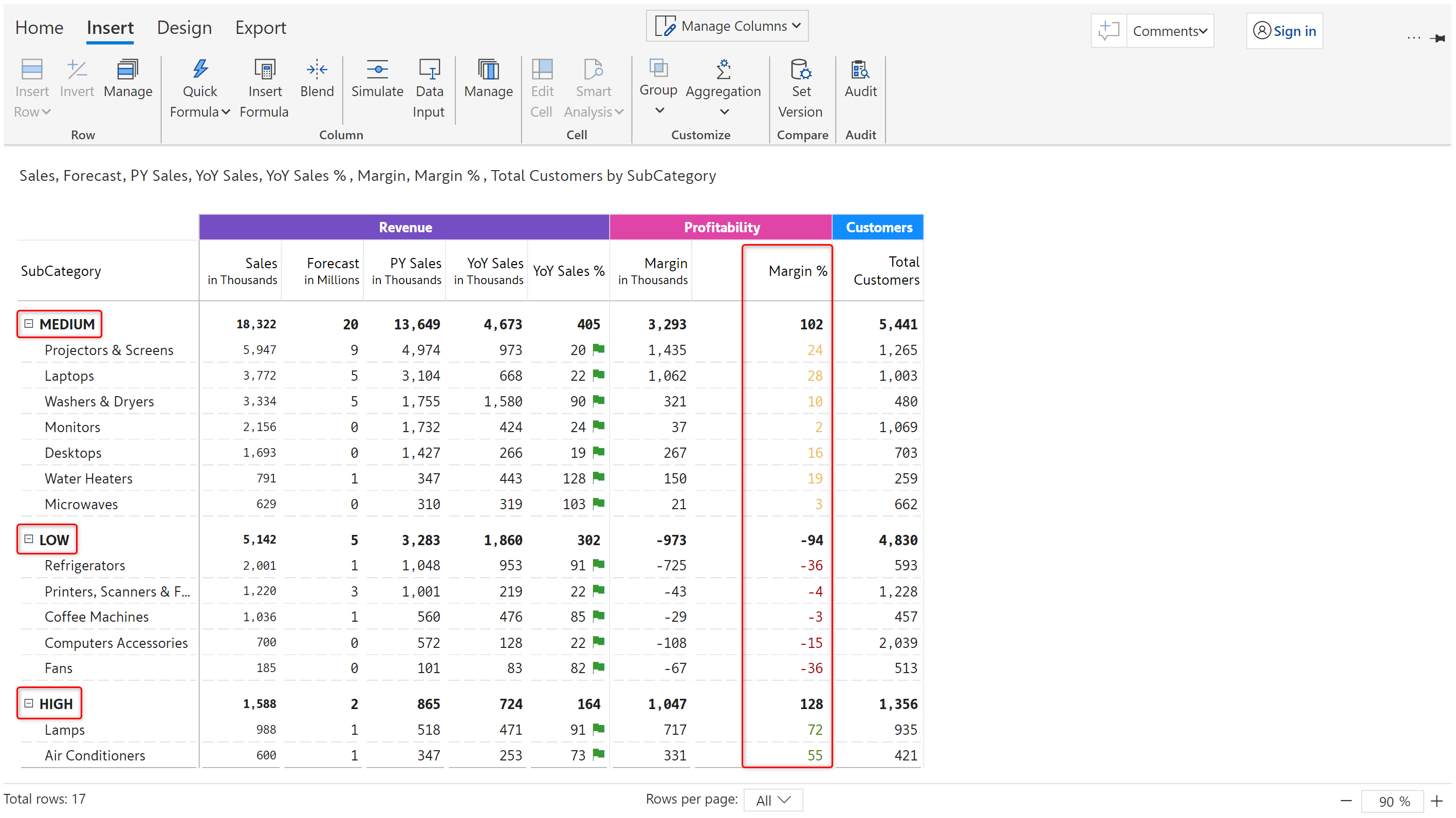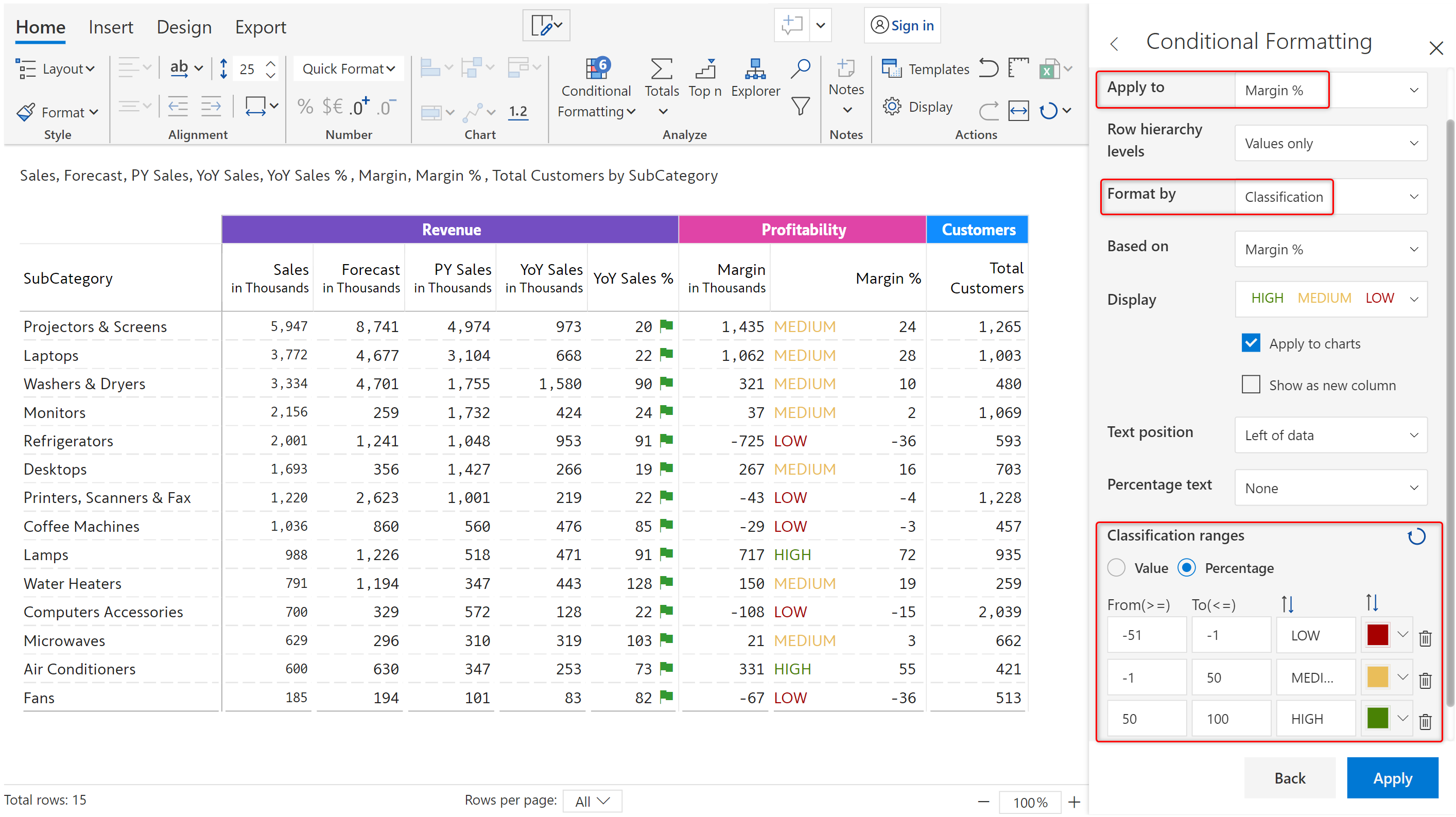 In this example, classification rules are applied to Margin %. High/Medium/Low is displayed next to the Margin % values based on the applied ranges.