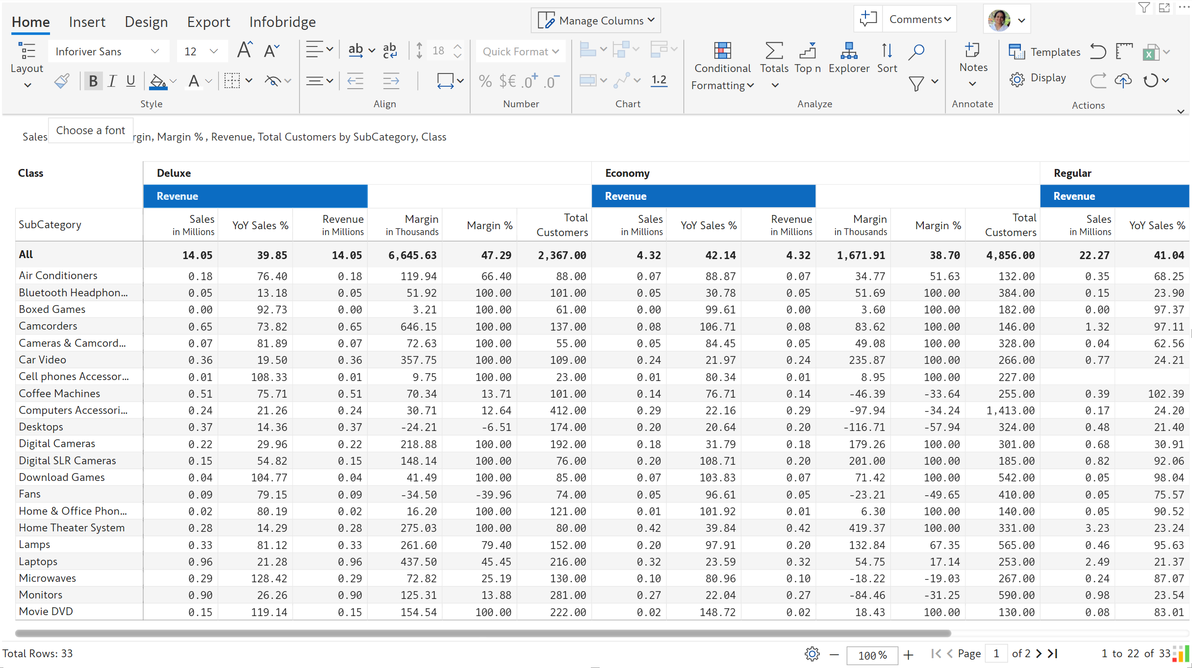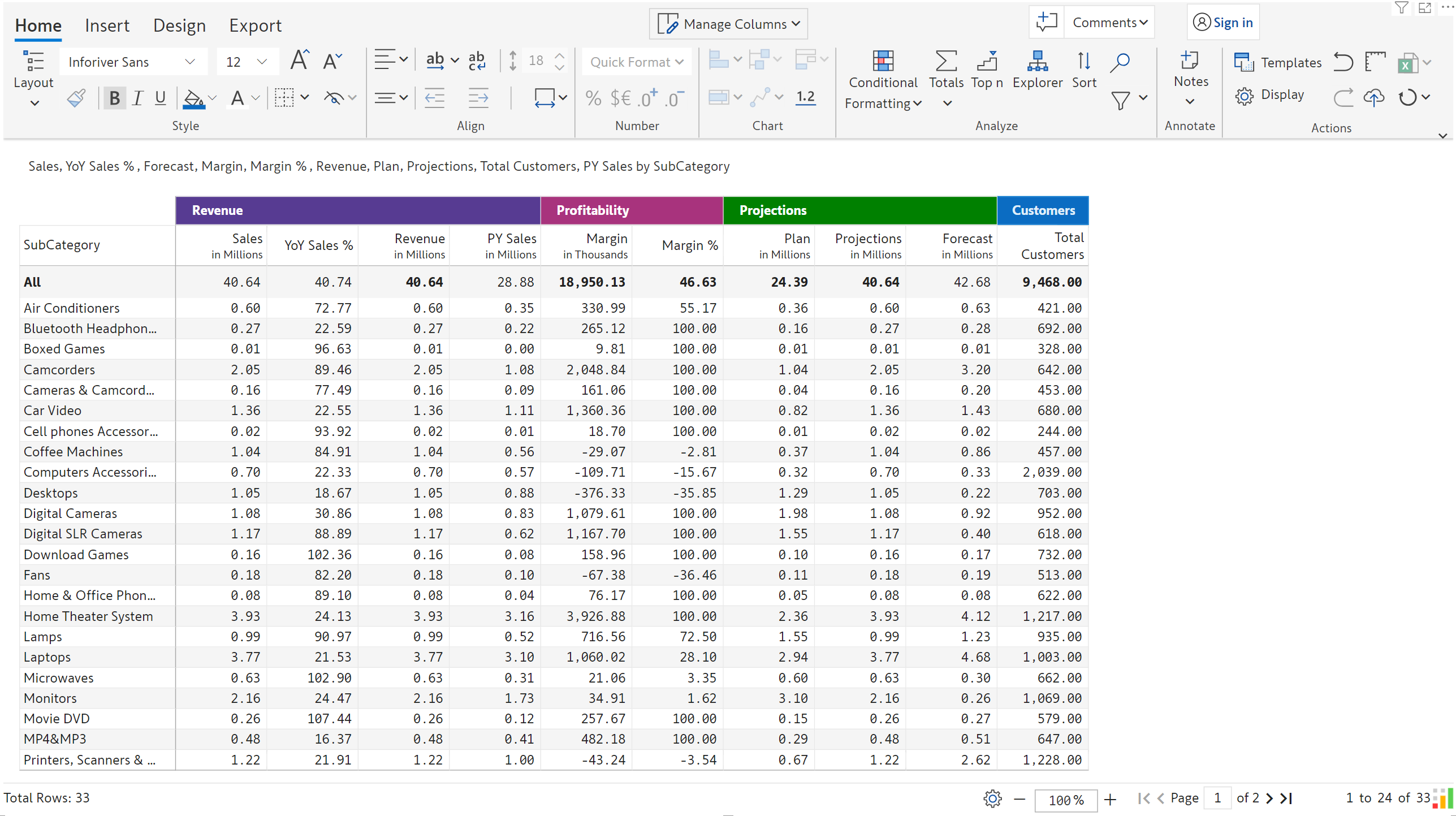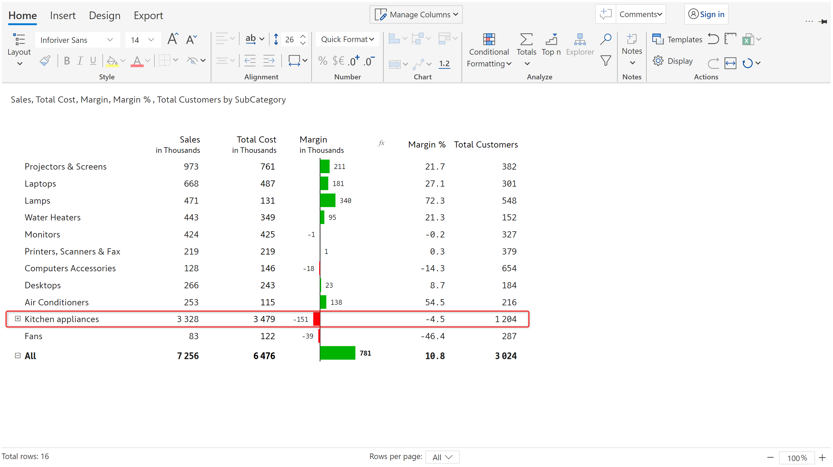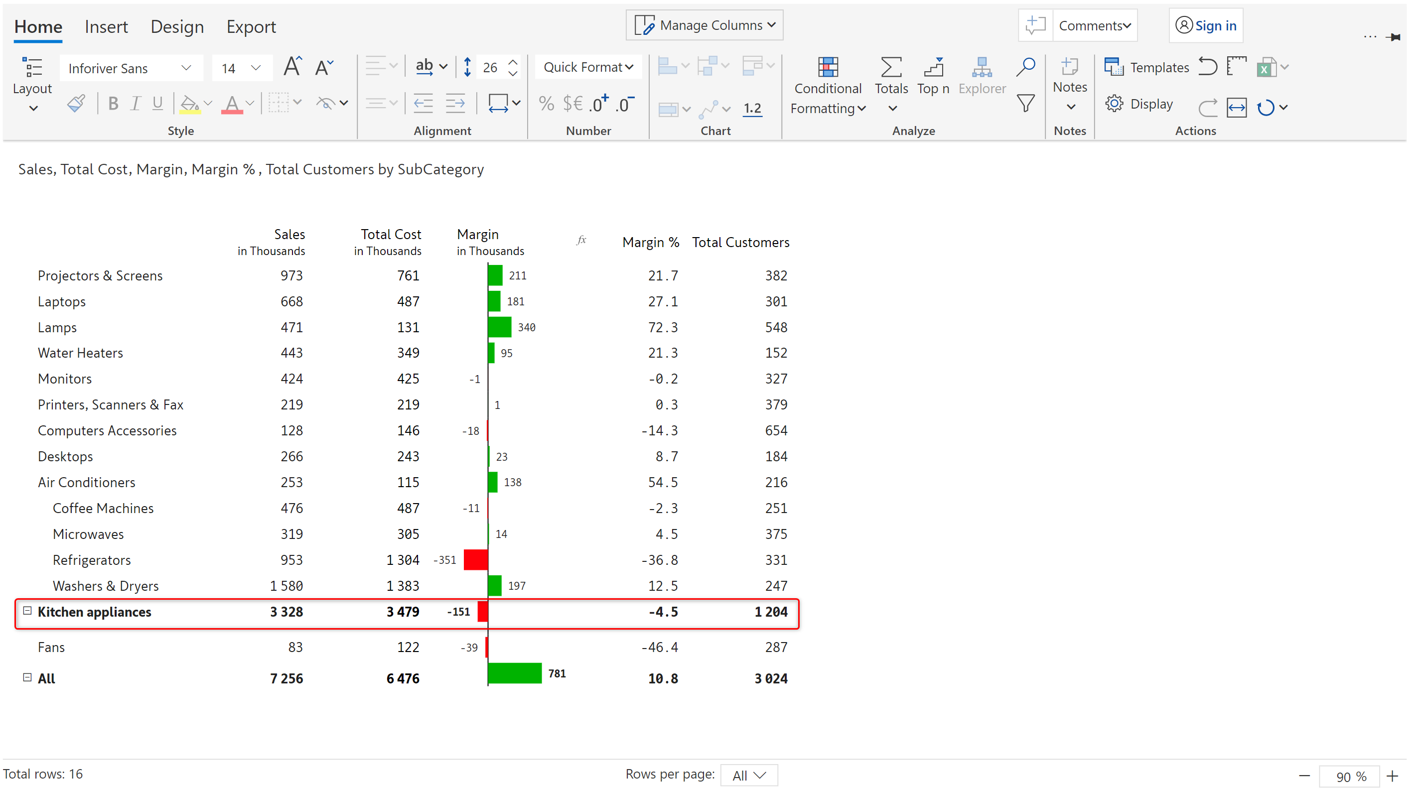 In this example, classification rules are applied to Margin %. High/Medium/Low is displayed next to the Margin % values based on the applied ranges.