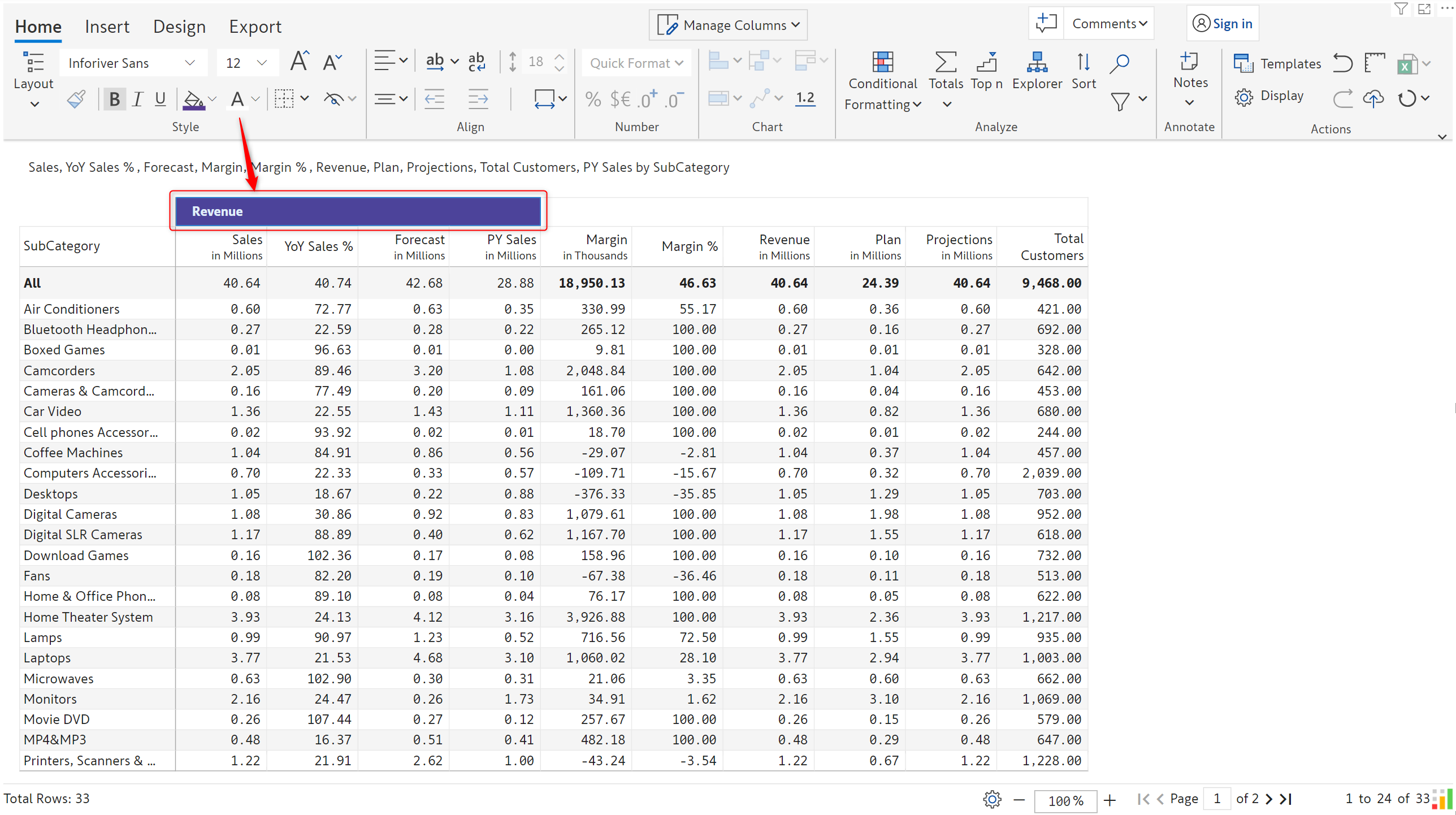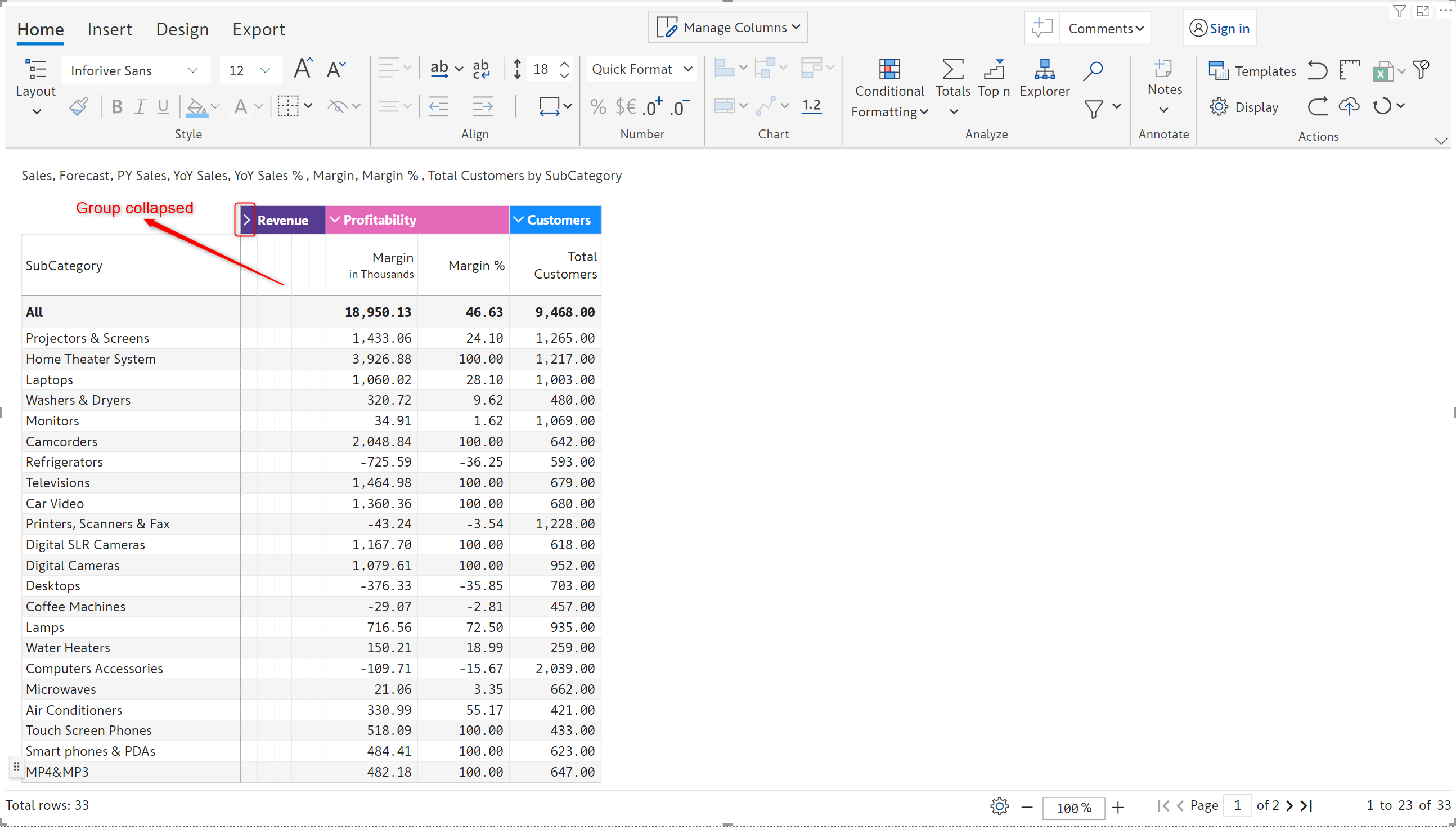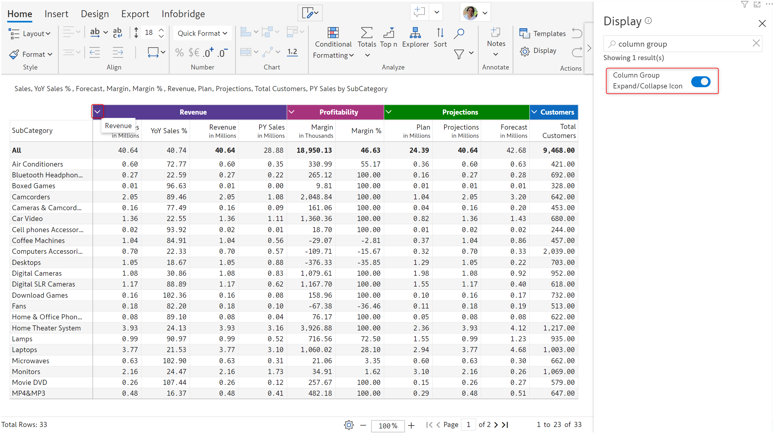 Notice how the Revenue group is created across all the column dimension categories.