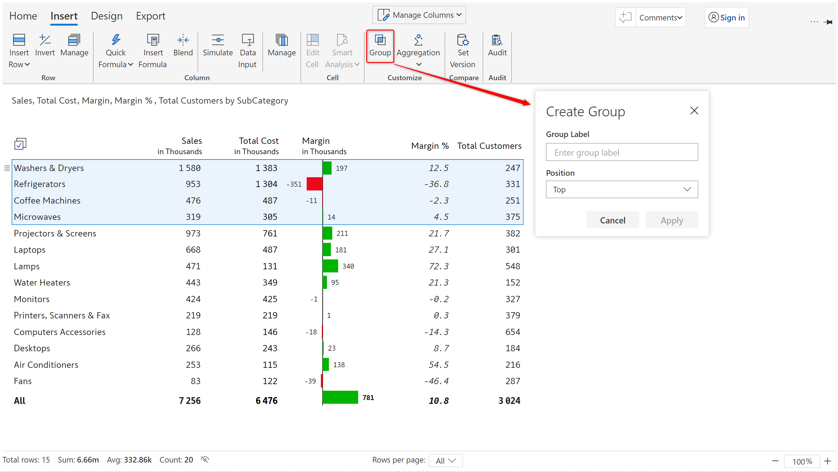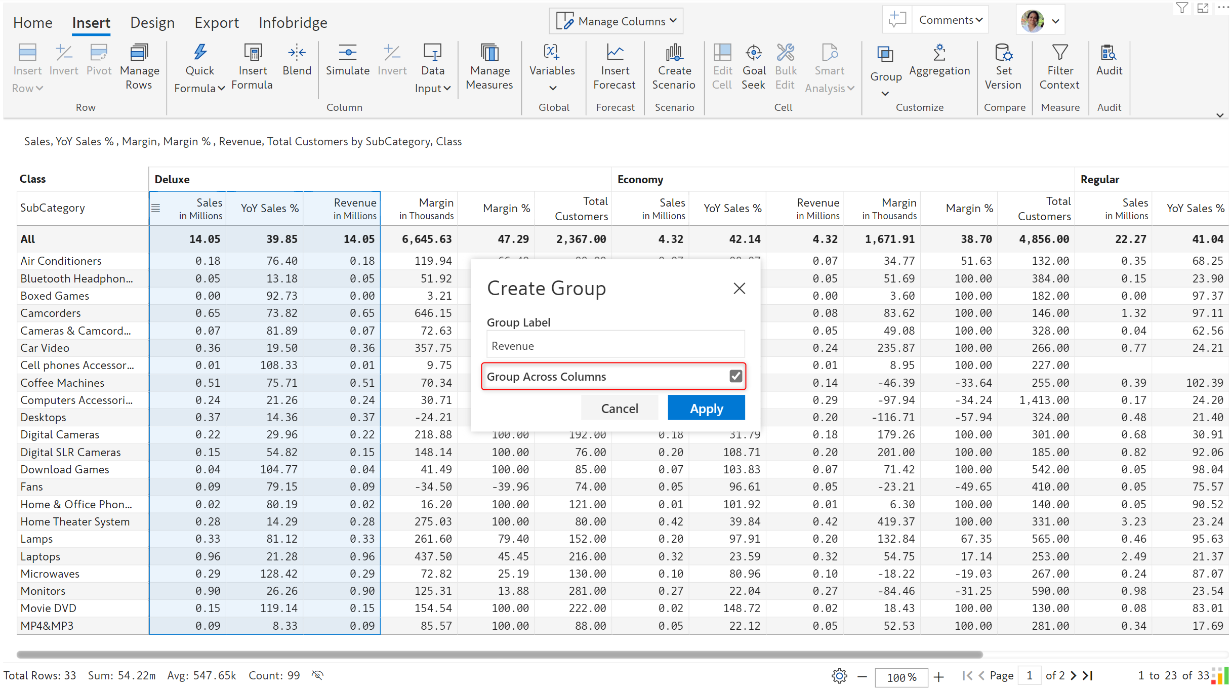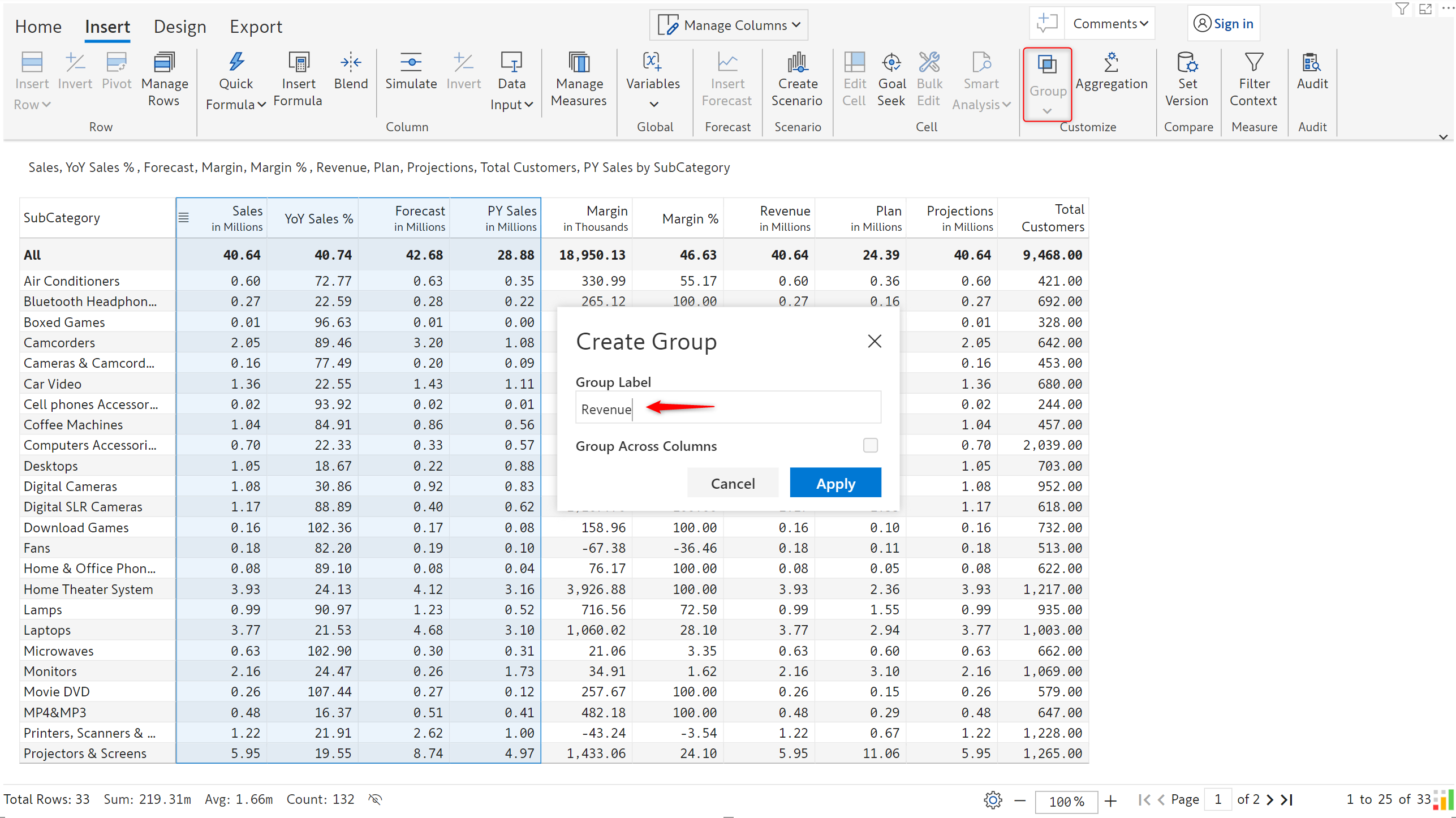 **STEP 1:** Select the columns to be grouped as Revenue. In the 'Insert' tab, click on **Group** and enter a label.  Click 'Apply'.