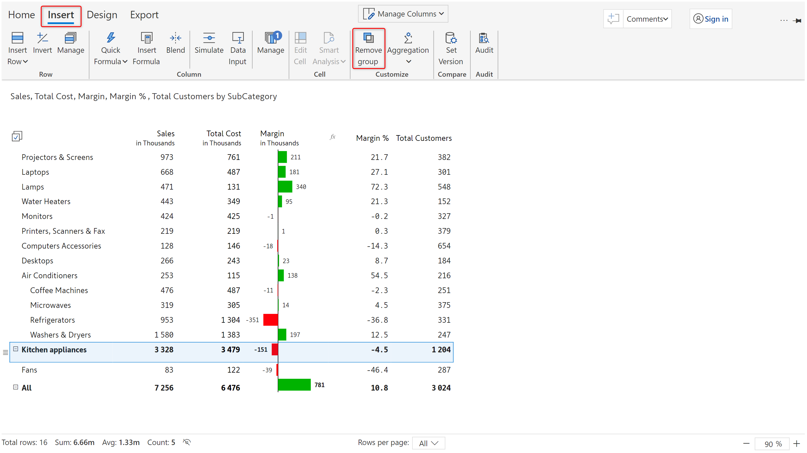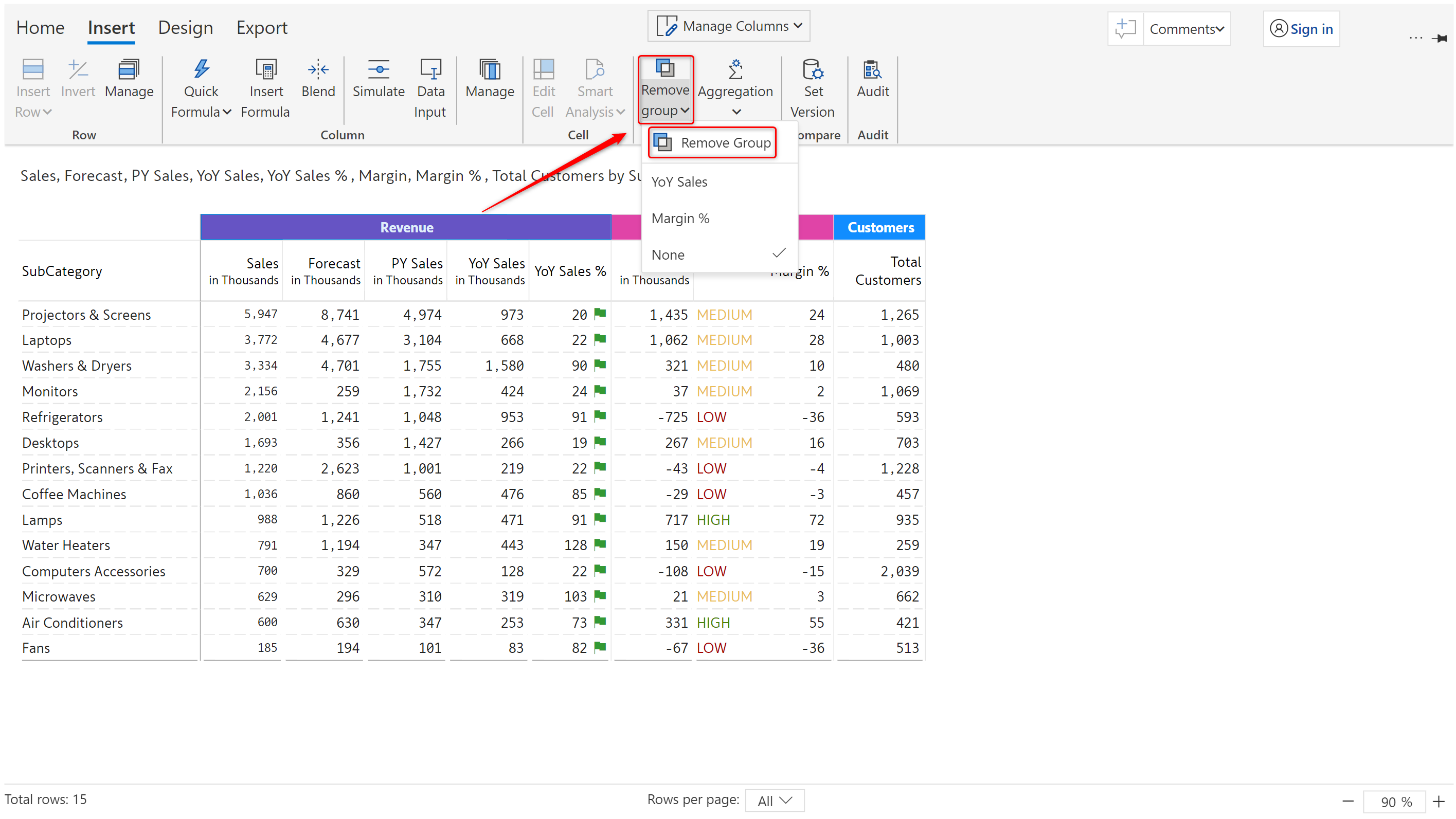 b) In case of auto-grouped rows, in the 'Insert' tab, '**Group**' dropdown, select '**None**'.