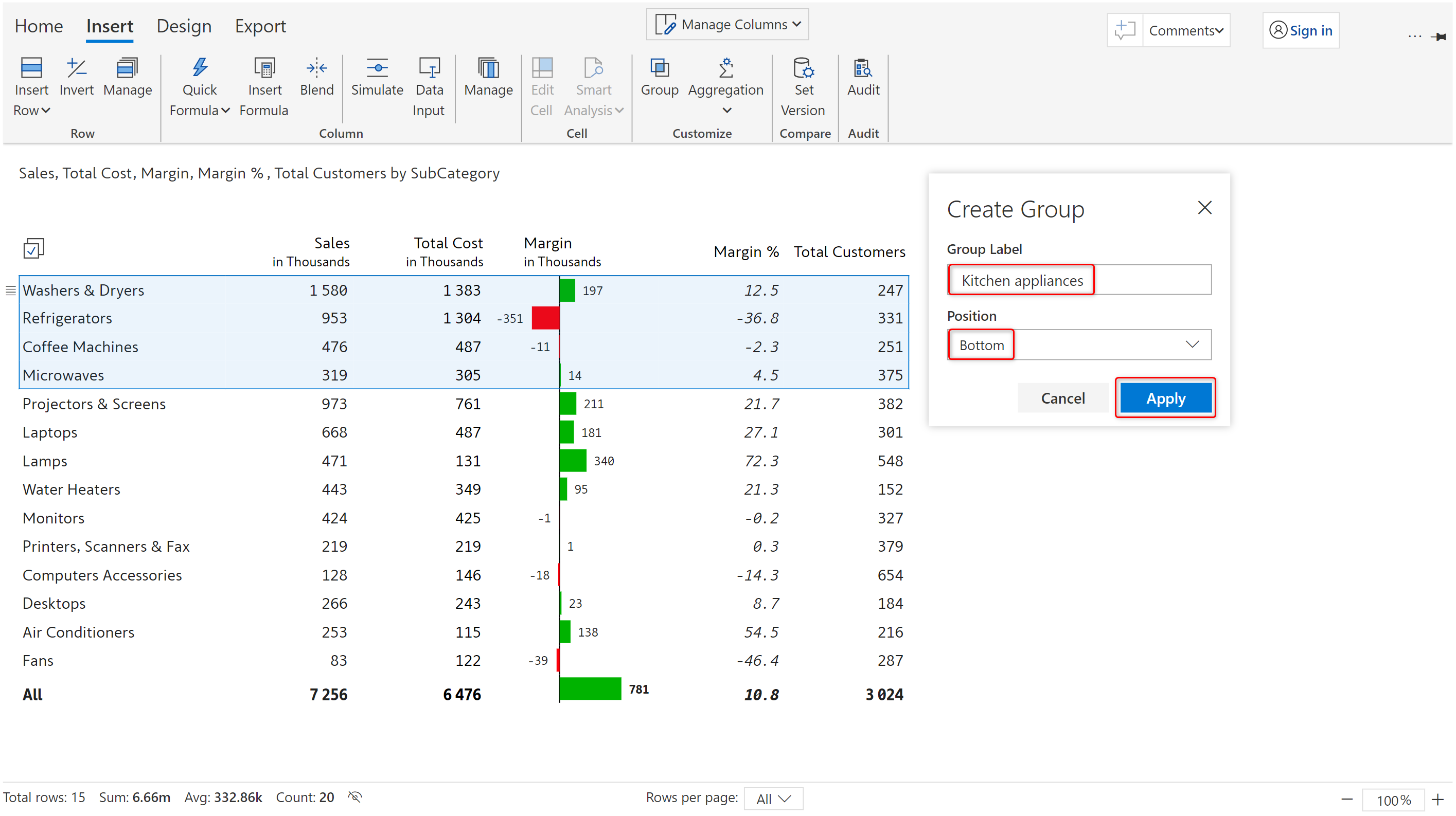 b) Enter the row group label and set the total position. Click 'Apply'.