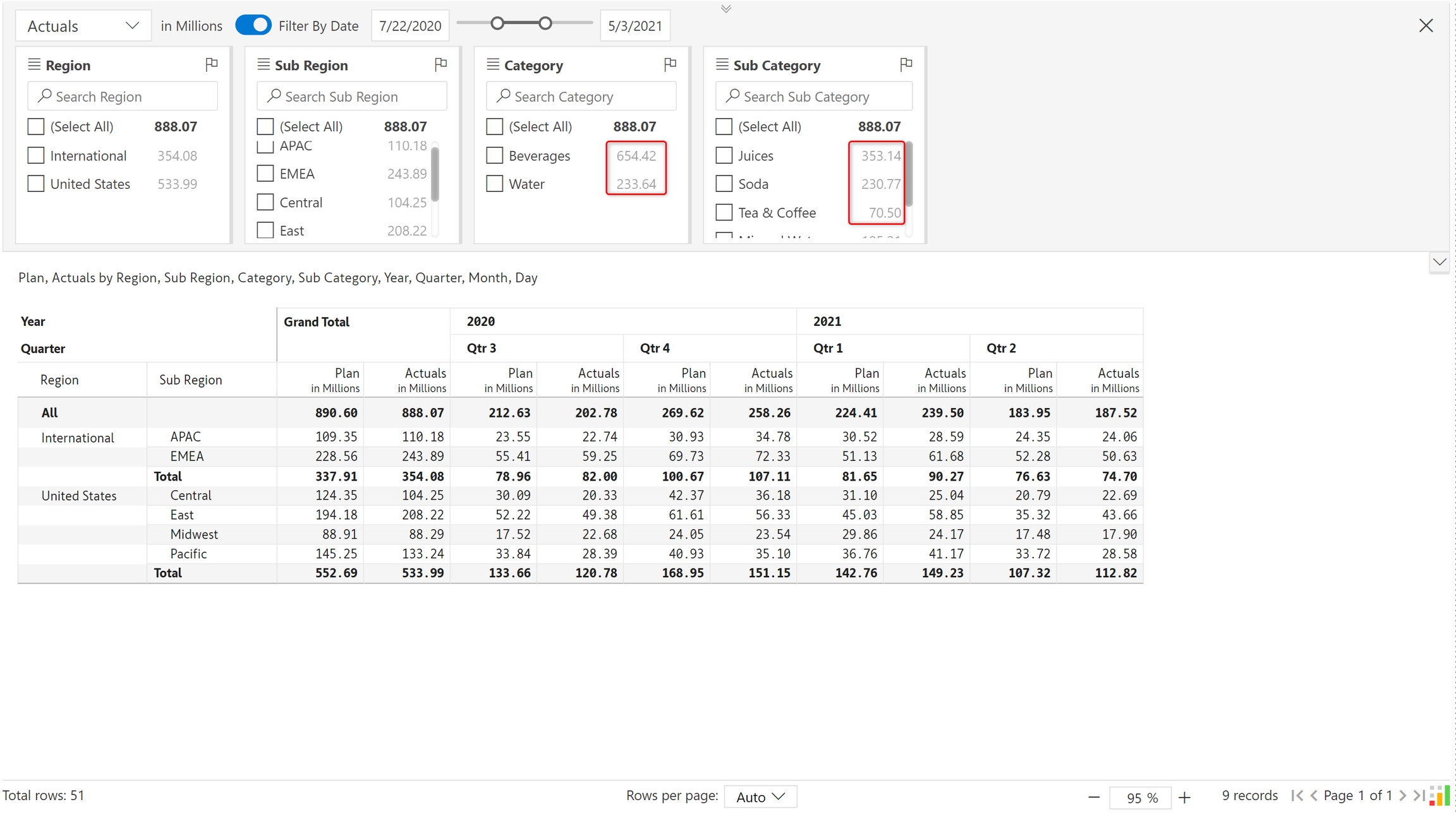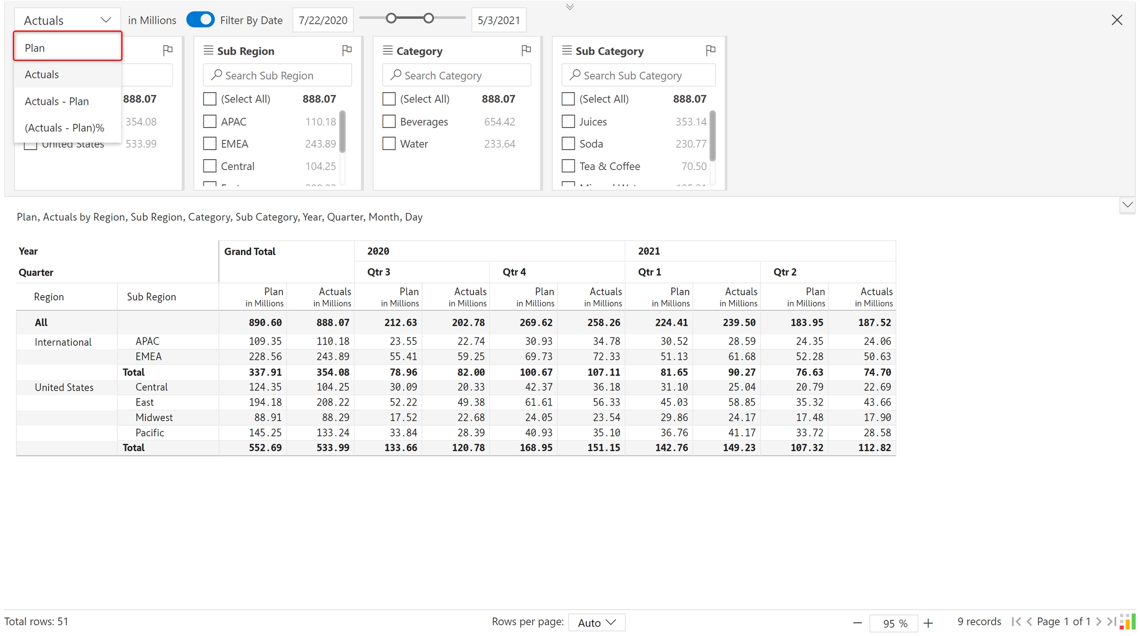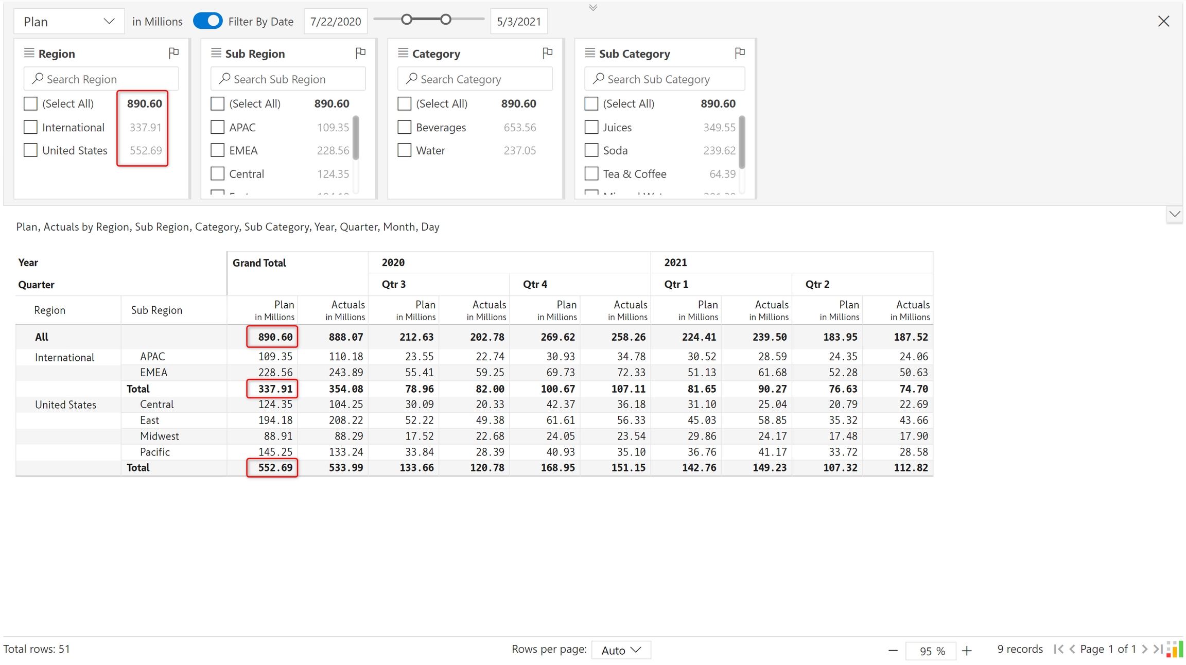 In this report, we have Region and Category hierarchies in rows, Dates in columns and Actuals and Plan as measures. Outline layout is used in this example, but all table and measure layouts are supported when using KPI Explorer.