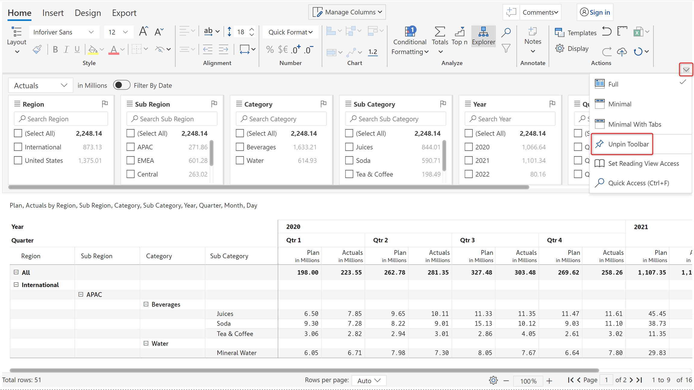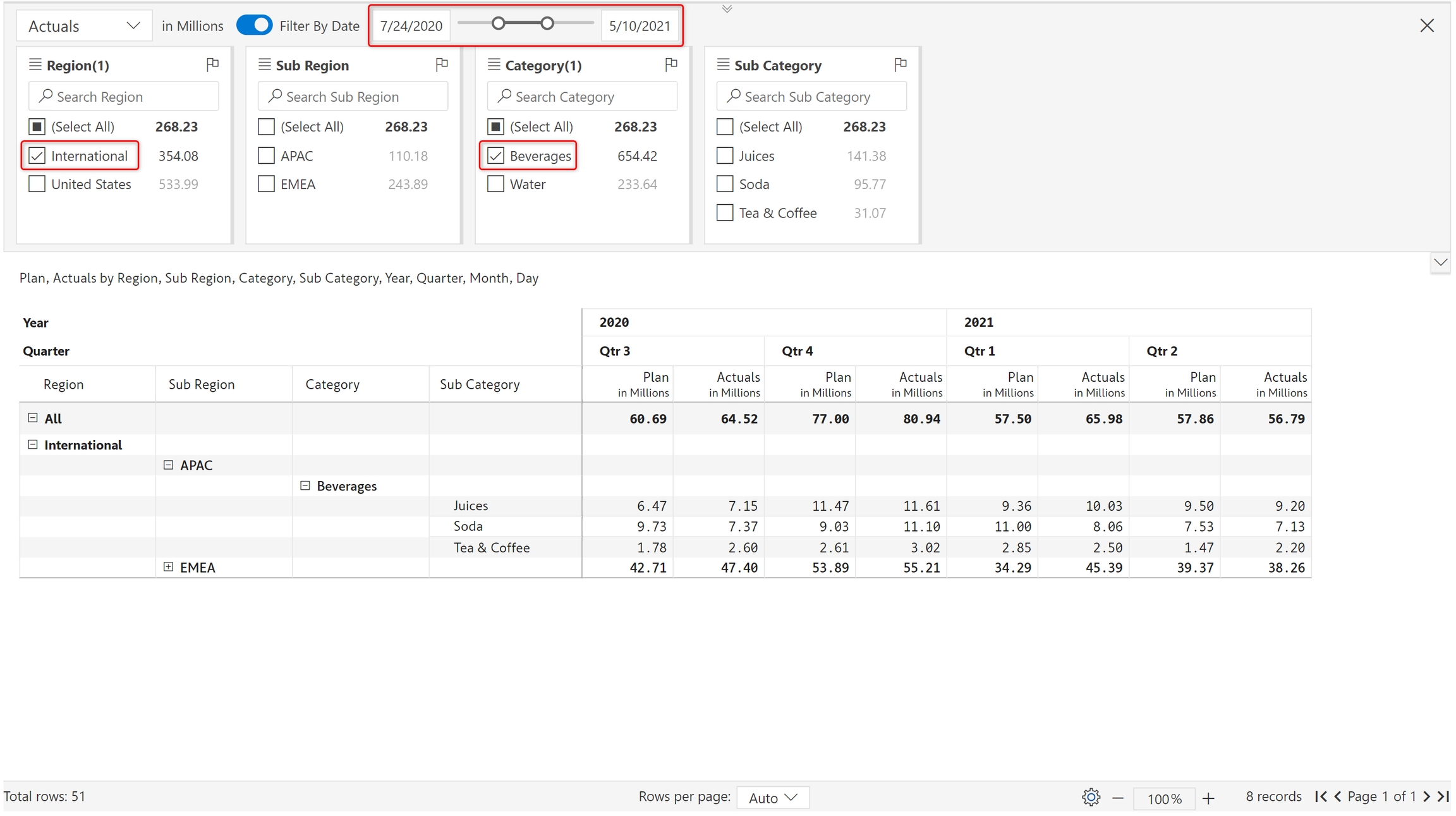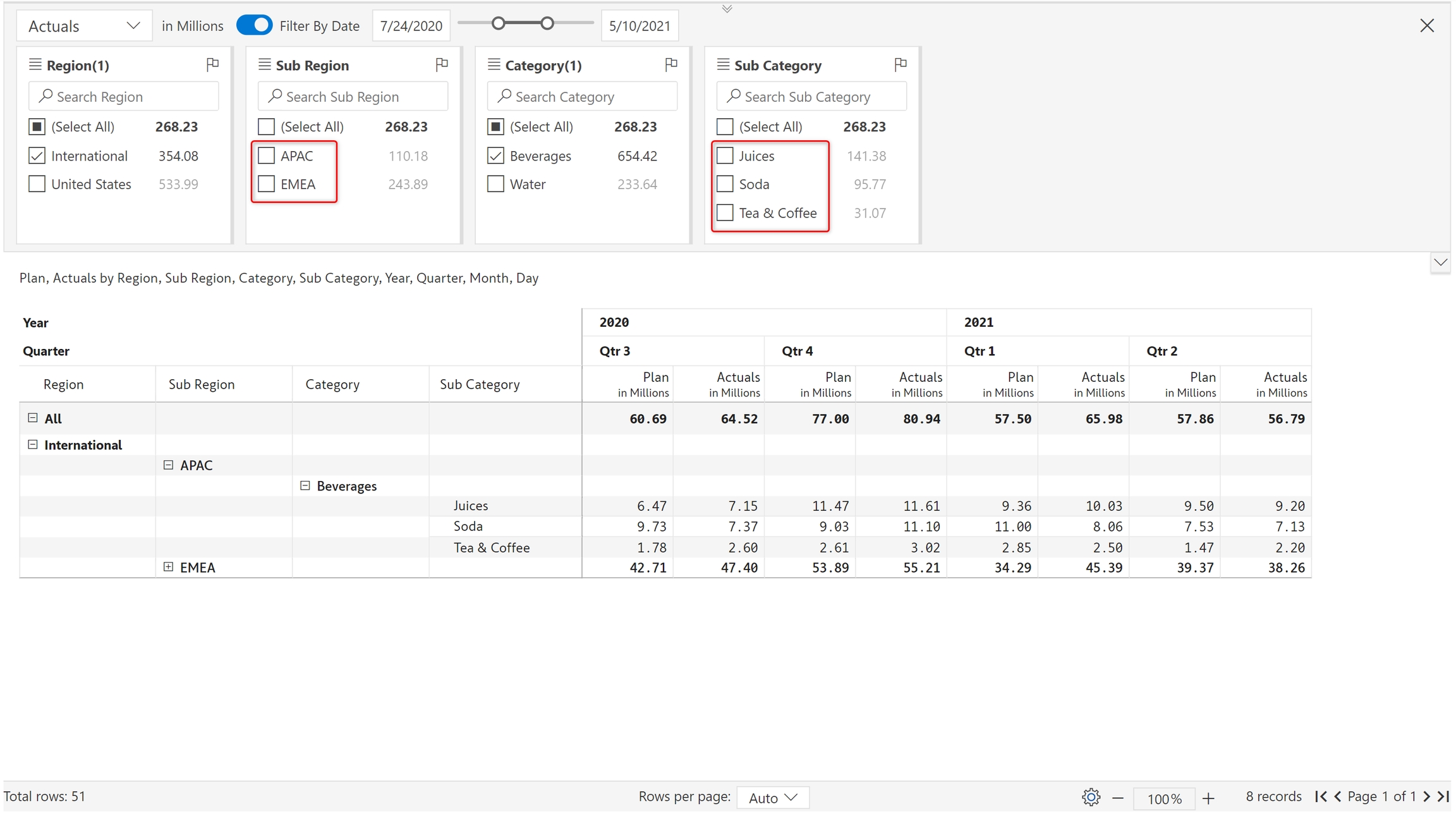 In this report, we have Region and Category hierarchies in rows, Dates in columns and Actuals and Plan as measures. Outline layout is used in this example, but all table and measure layouts are supported when using KPI Explorer.