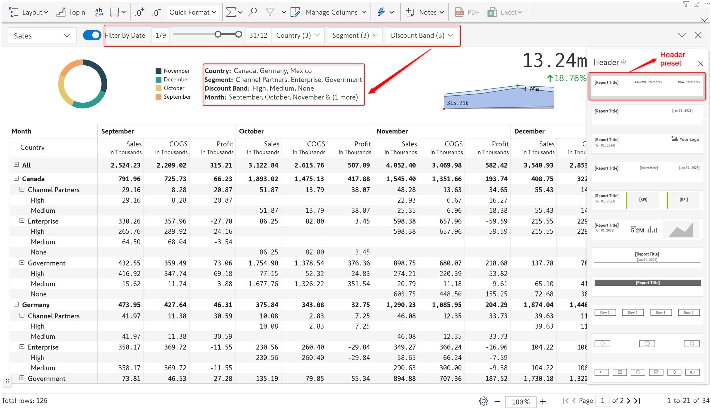 Inforiver provides plug-and-play header presets to design your headers easily. If you have chosen the KPI preset, any selections made in the KPI explorer will be reflected in the header.