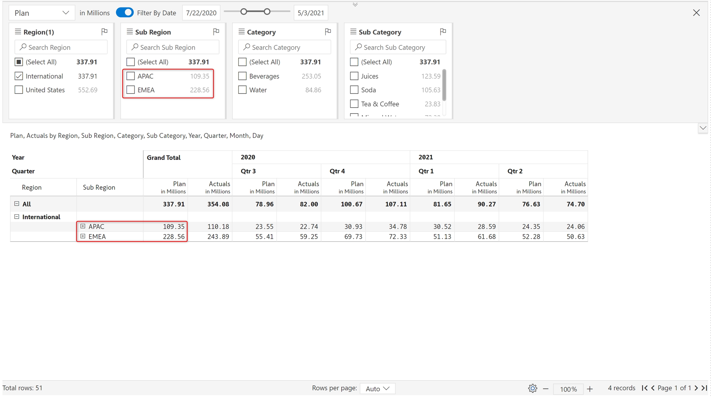 j) As you expand the sub-regions to reveal the categories, you can see that sum of plan values for beverages in APAC and EMEA is displayed.