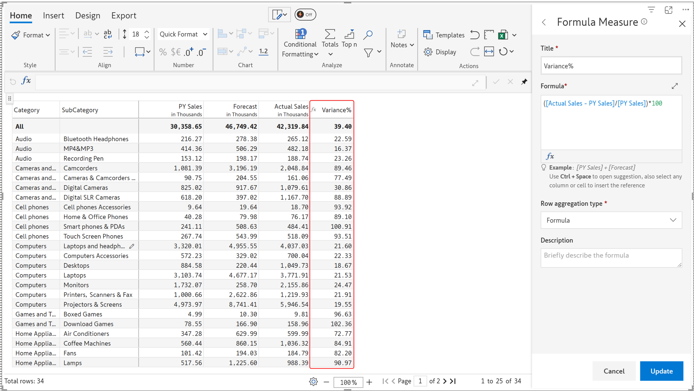 5. Give the calculated column an appropriate name, say 'Variance %', and click on **Create**.