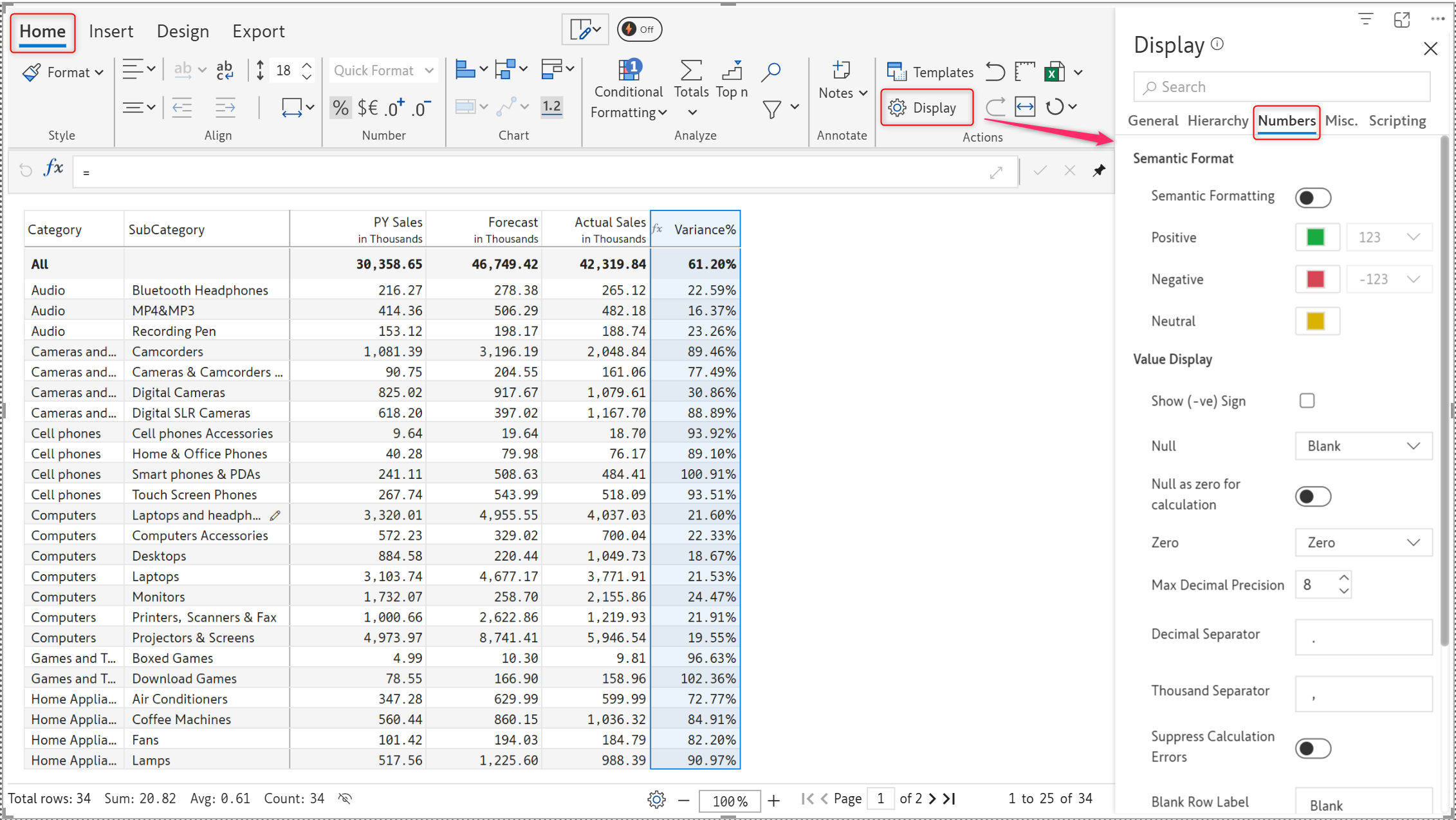 In the 'Home' tab, click on 'Display' settings. In the side panel, go to the 'Numbers' tab.&#x20;