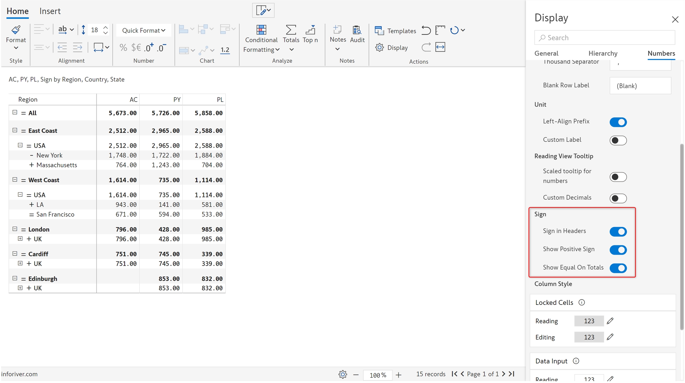 b) On enabling the 'Sign in header' option, you can see the positive, negative, and total rows with the signs in the header.