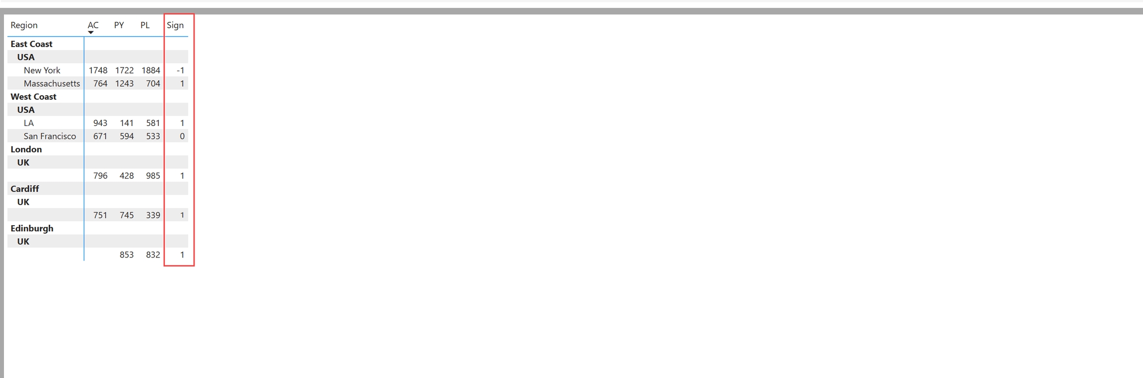 Instead of defining positive and negative signs at the report level, you can use the sign conventions from your data source tables. To do this, create a column that assigns values -1, +1, and 0 for negative, positive, and totals respectively. A sample table is shown below.